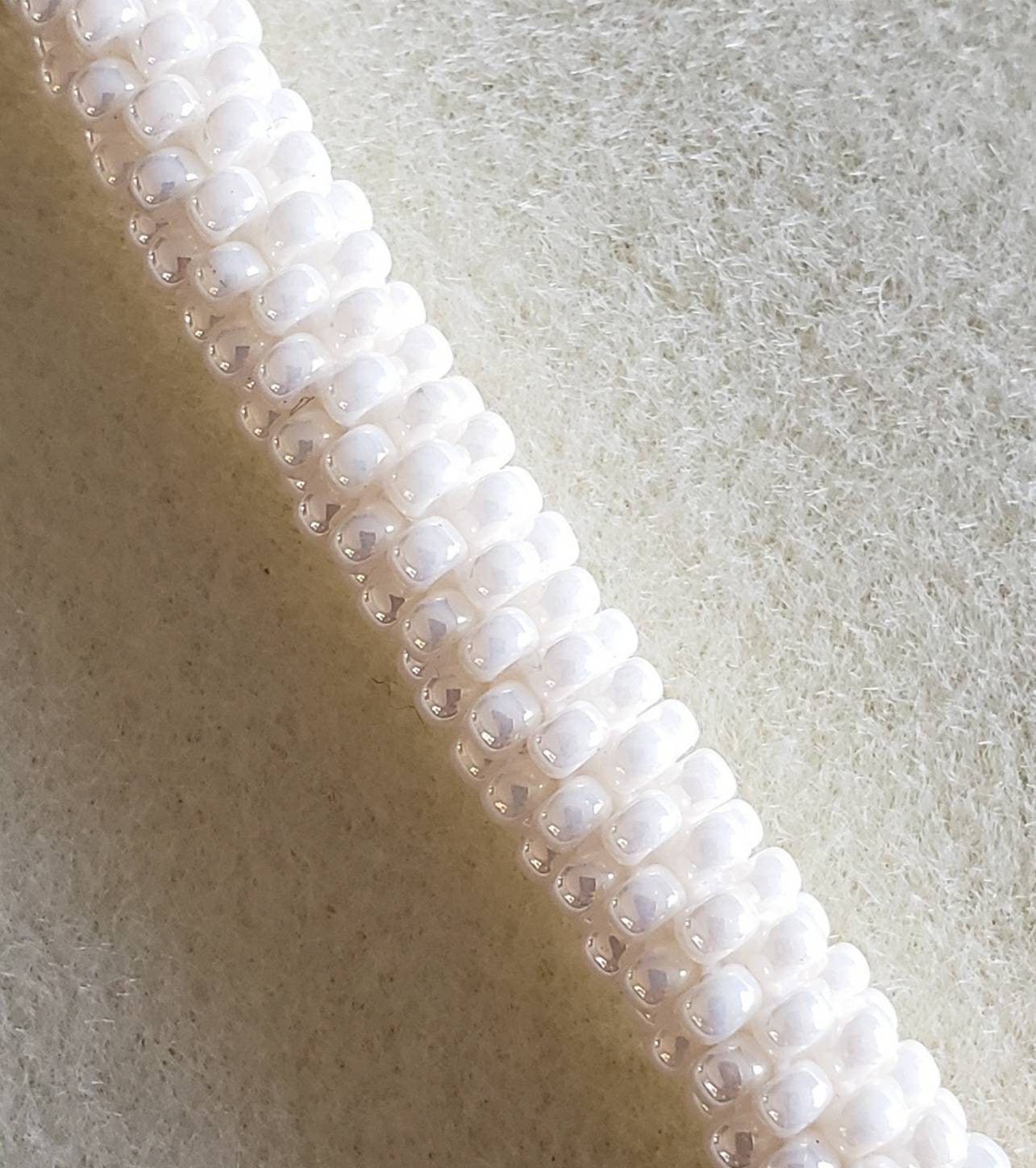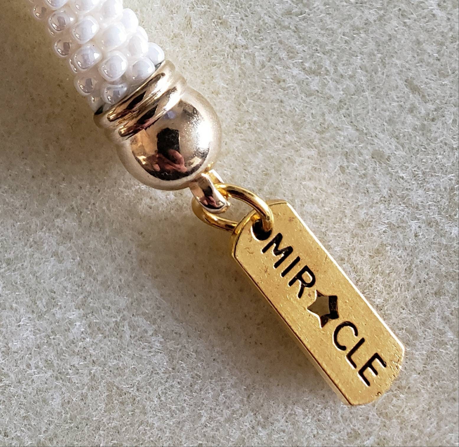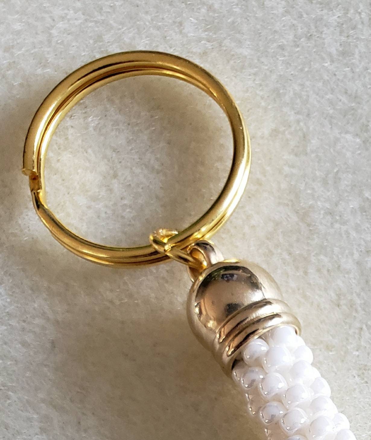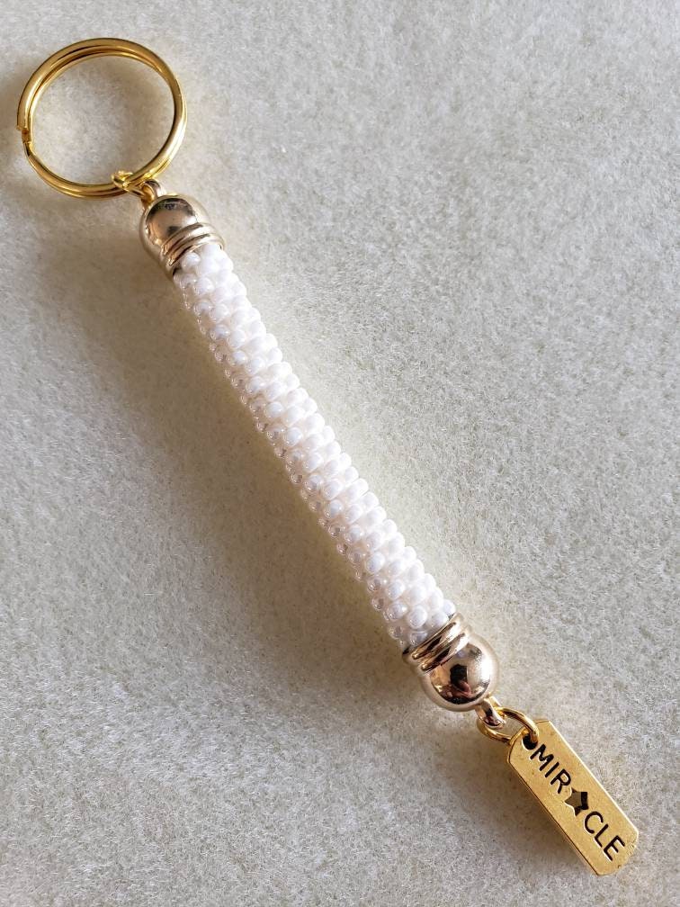 This Keychain measures between 5 1/4 inches long. It is made of high-quality glass beads and finished with gold findings.