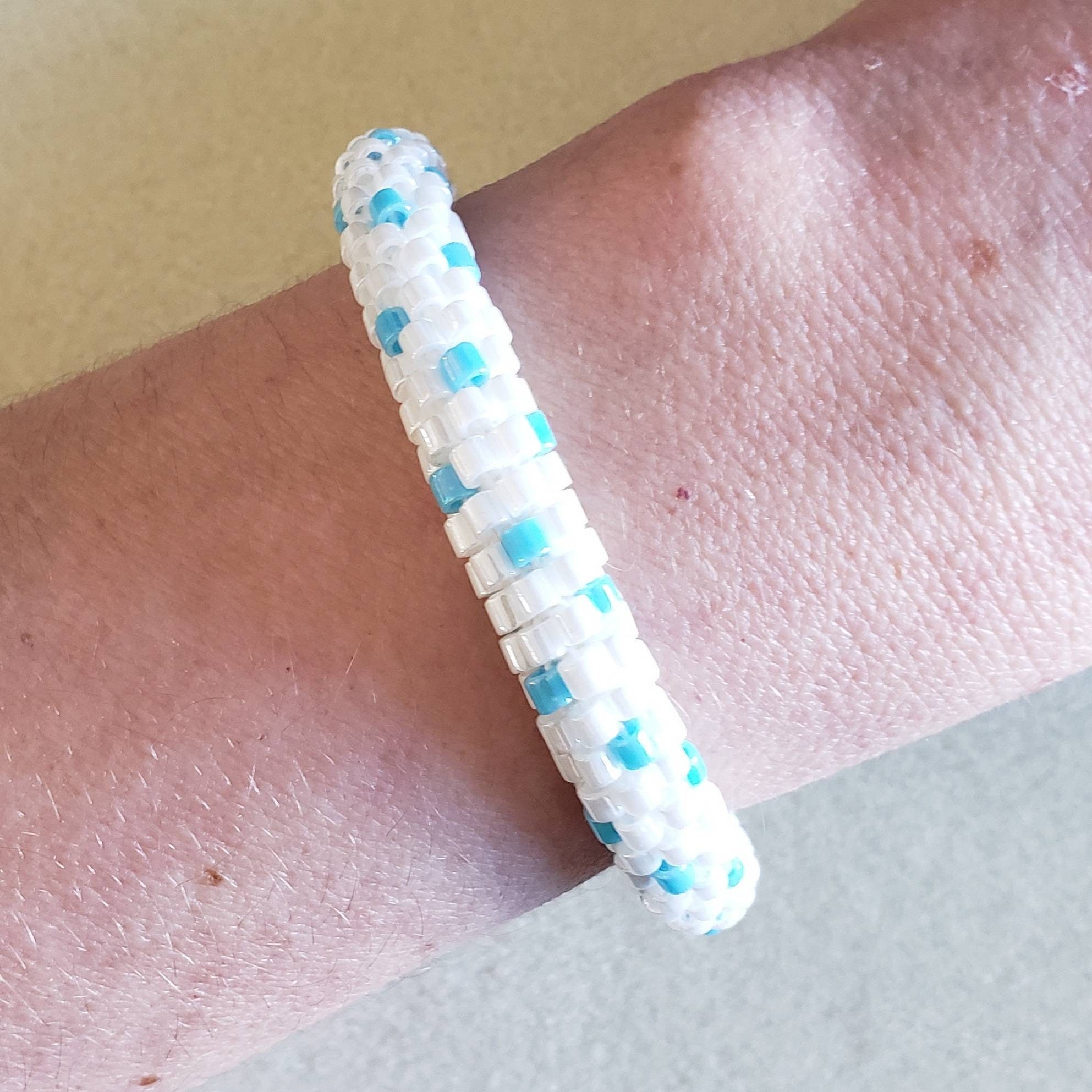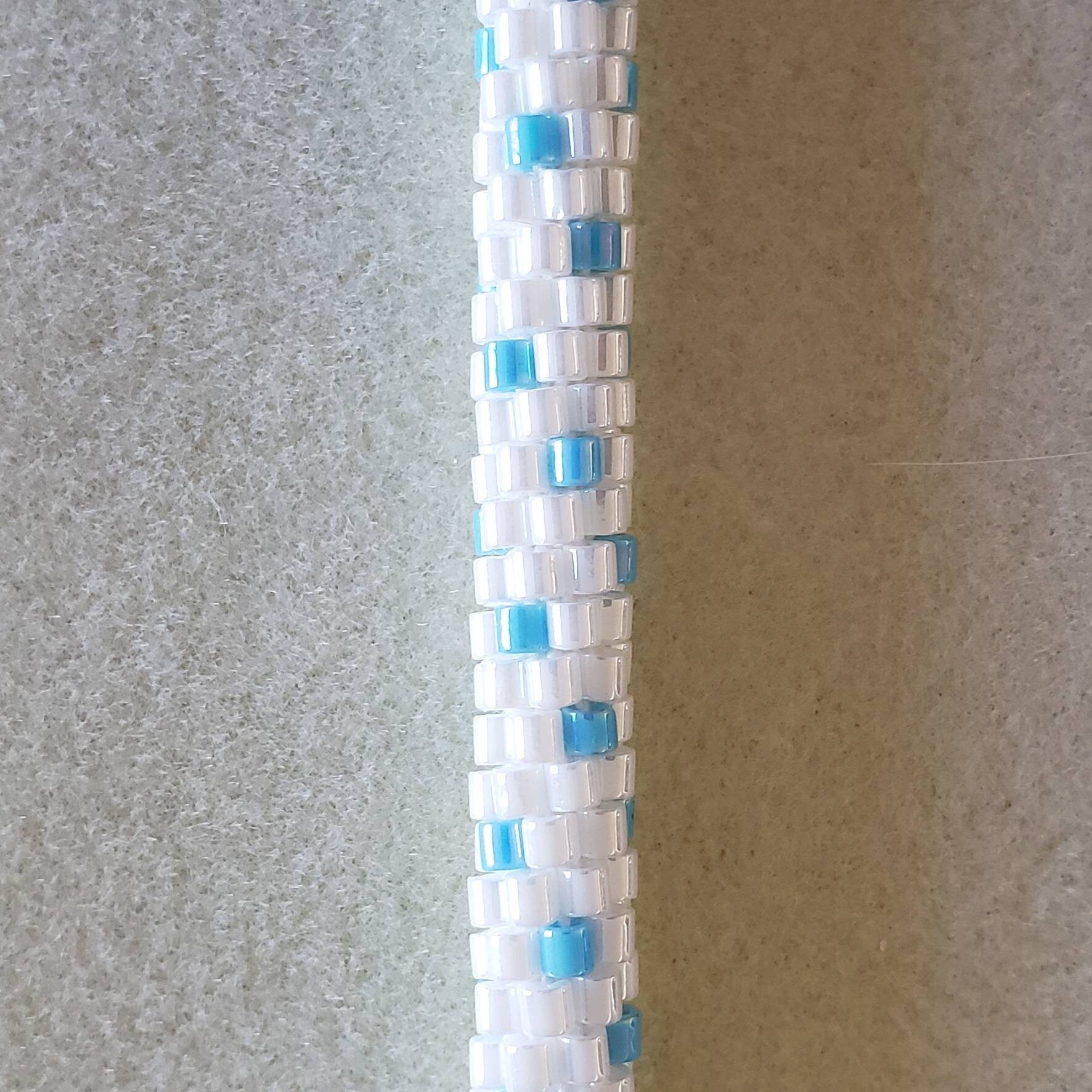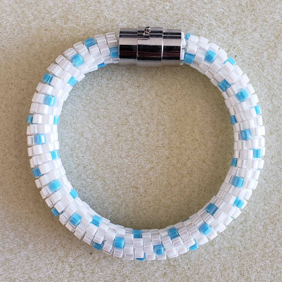 There is something about the first snowfall that is really beautiful. Especially when the sun shines on the snow and there is just a beautiful rainbow blueish tone to it all. The blue beads in this bracelet have a rainbow finish and with the pearl white beads it just reminds me of that first snowfall.