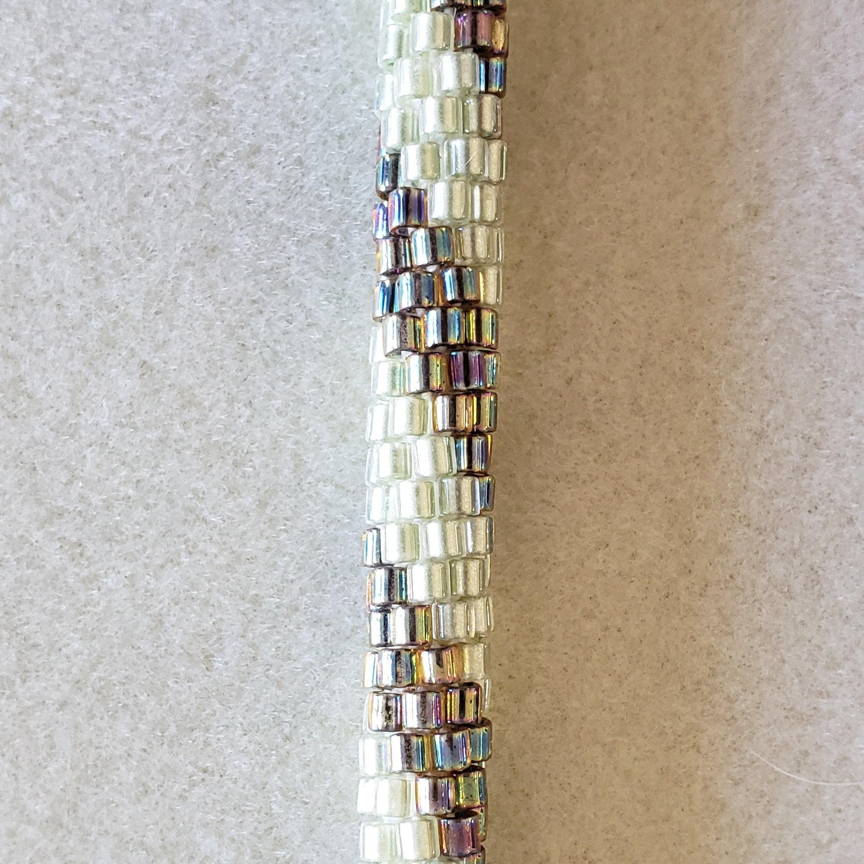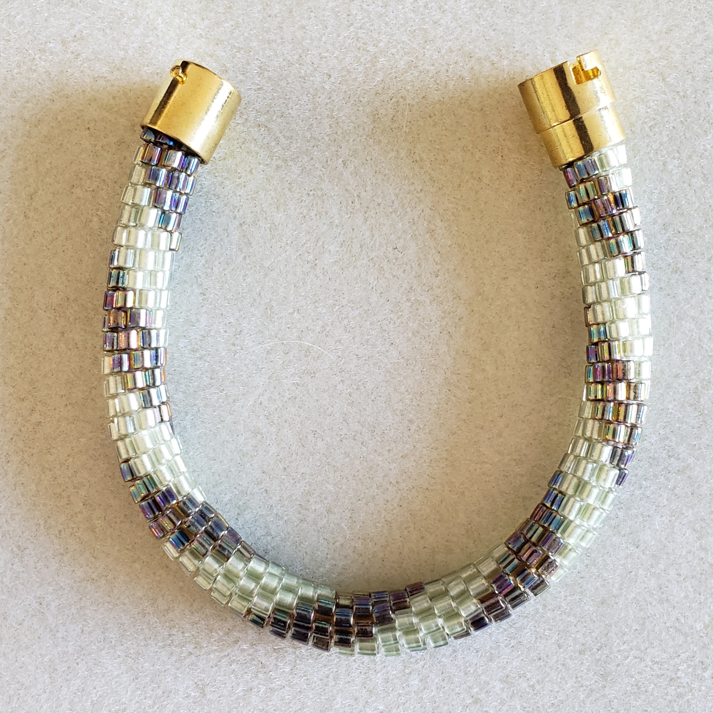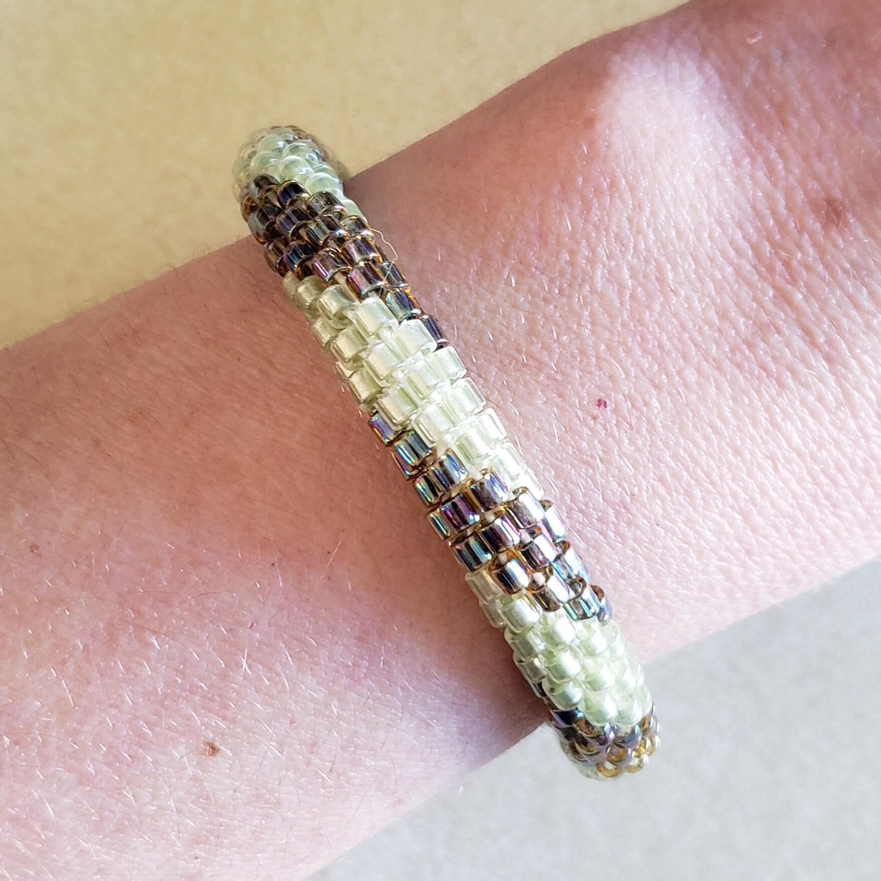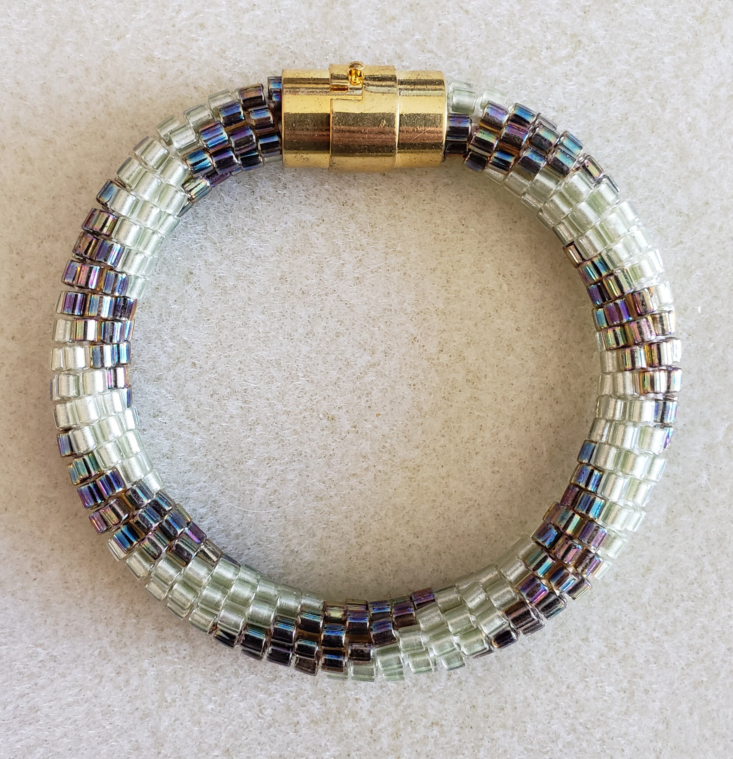 This bracelet reminds me of early spring with the pale green leaves just starting to grow along with the final browns of winter getting ready to leave. Add the rainbow finish to some of the beads and you have a real conversation starter.