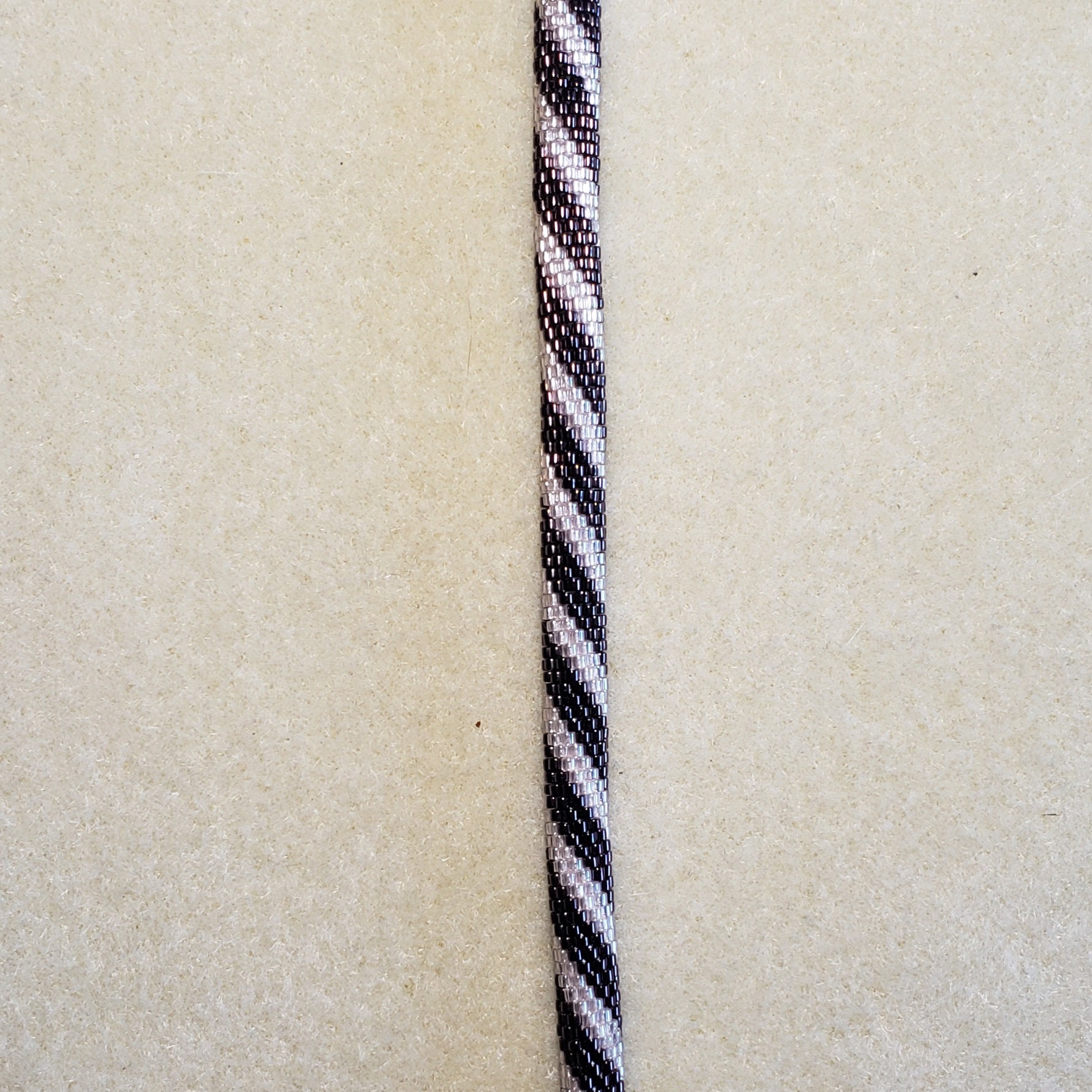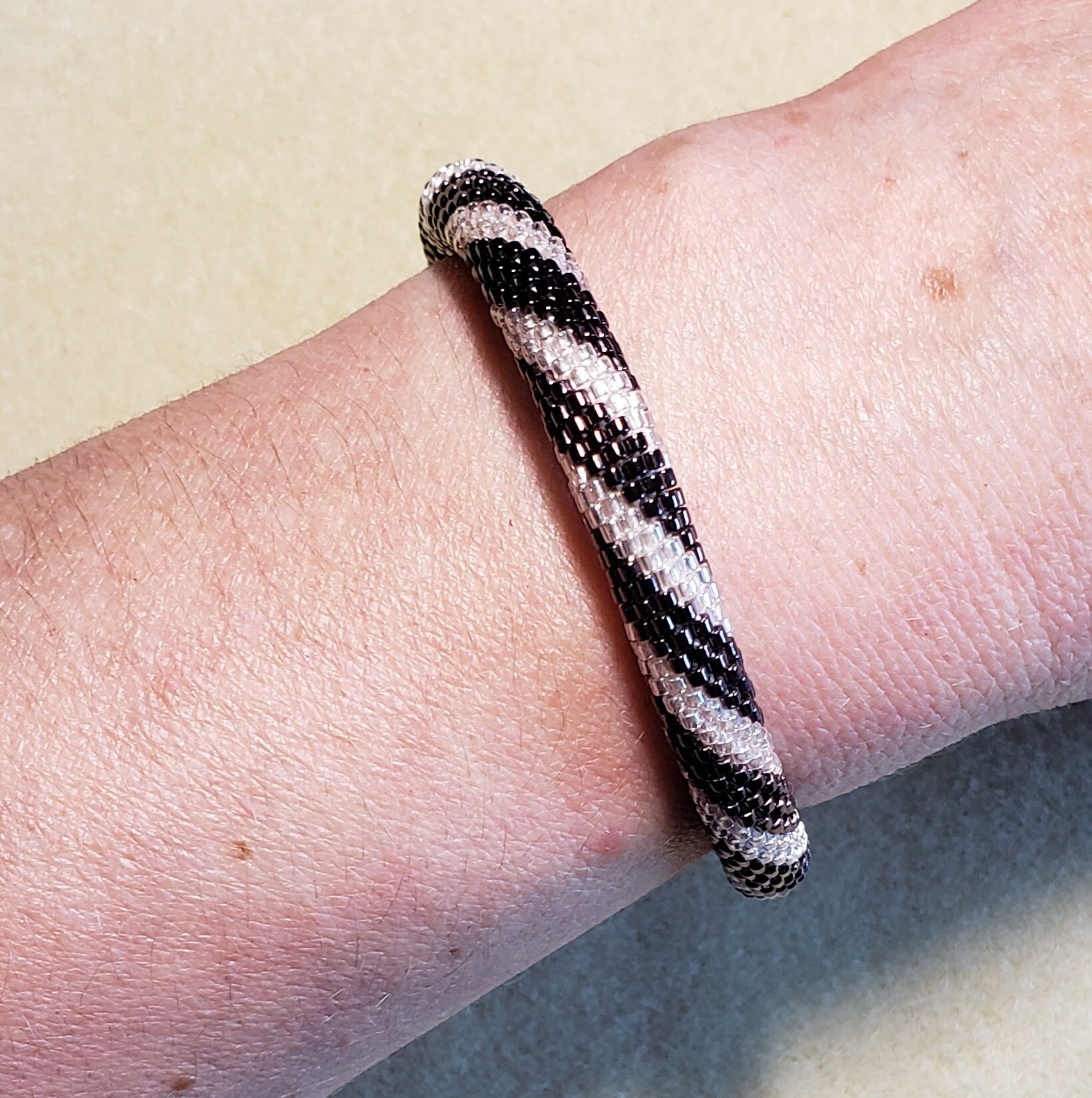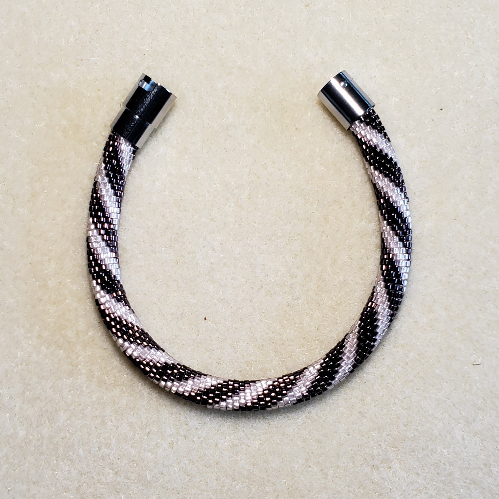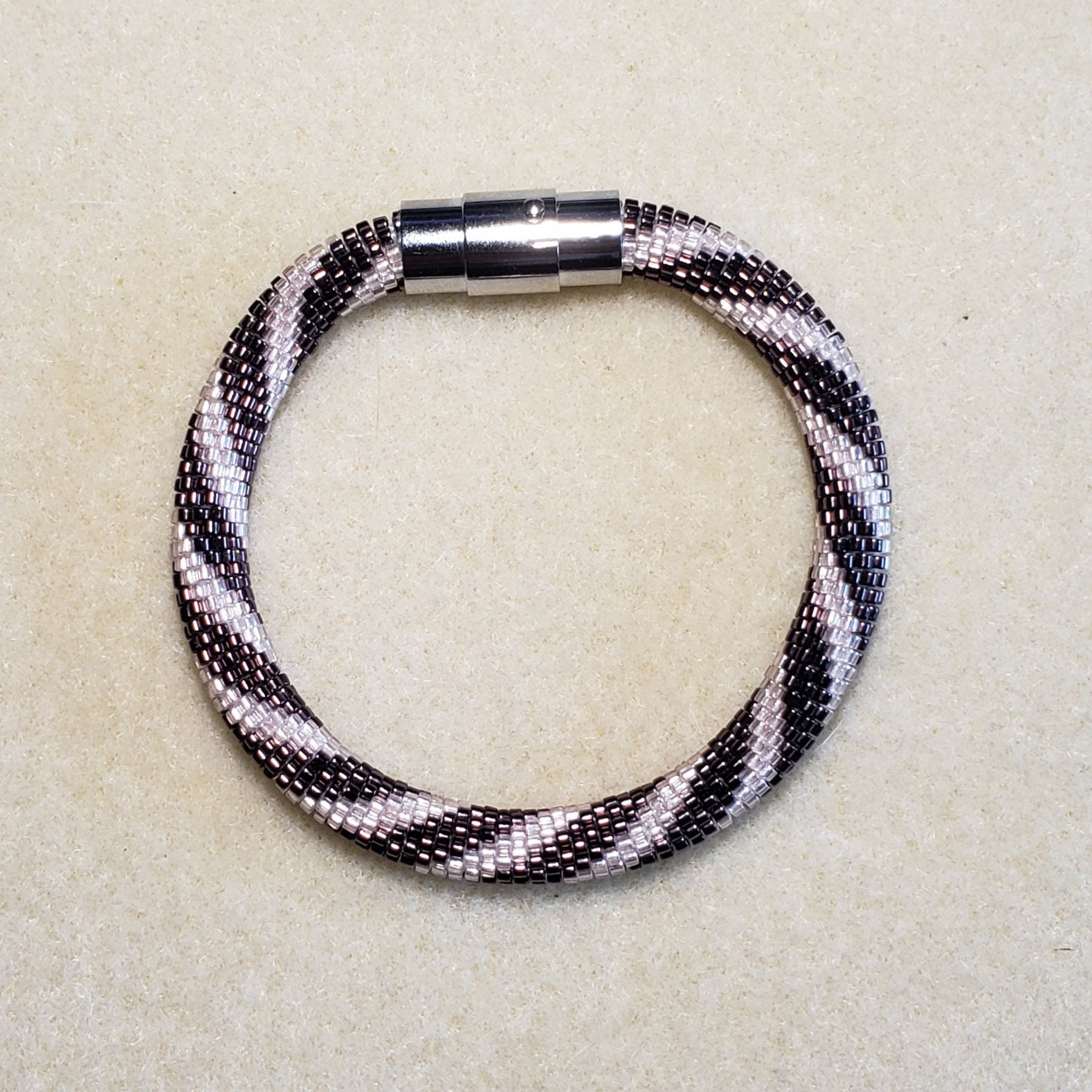 This bracelet measures 7.5 inches long including the clasp. It is made from high quality glass seed beads and finished off with a silver magnetic safety clasp.