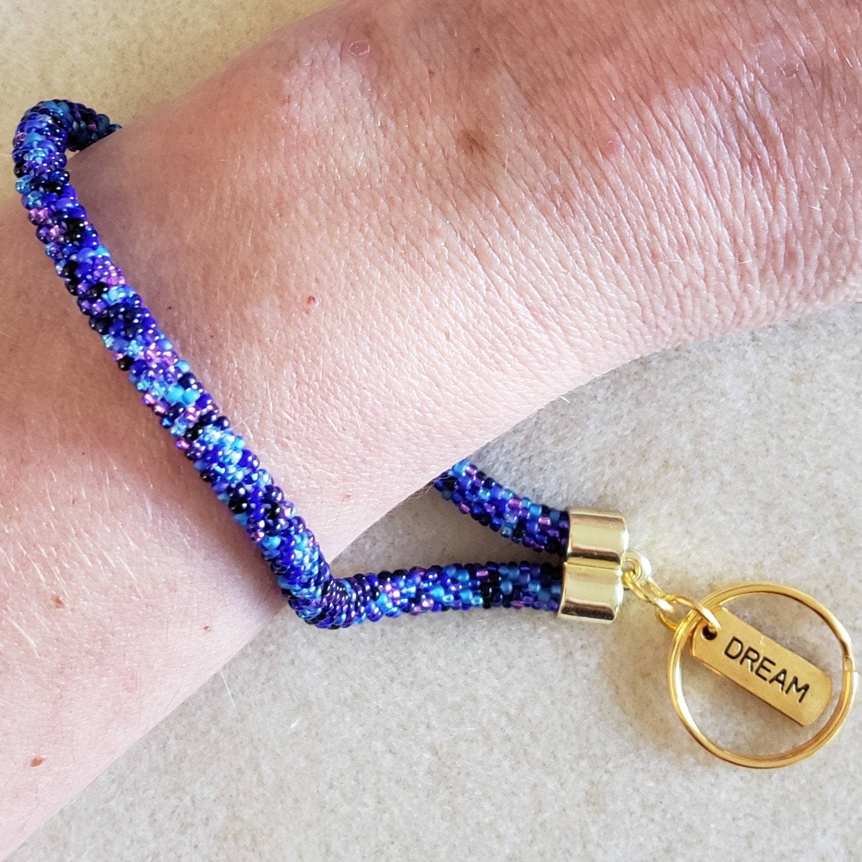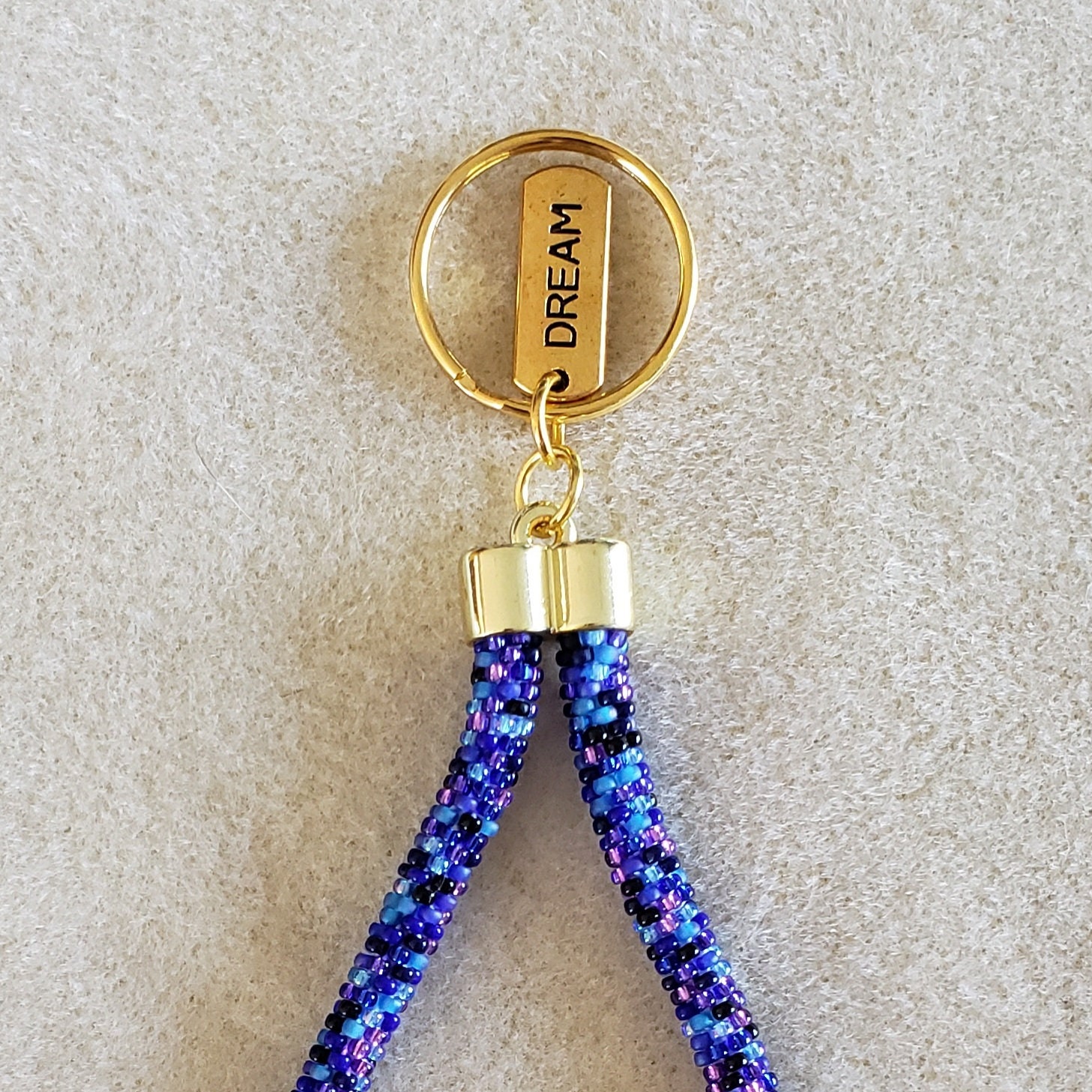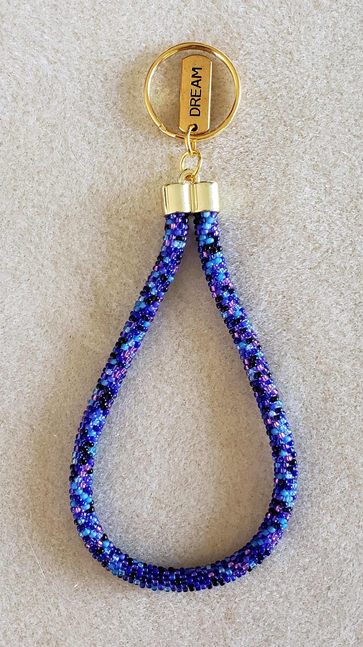 This wristlet is so functional as well as beautiful. The design allows your keys to fall right into your hand for incredible convenience, especially when you have your hands full. It is made from high quality glass seed beads and finished off with gold findings and a motivational charm.