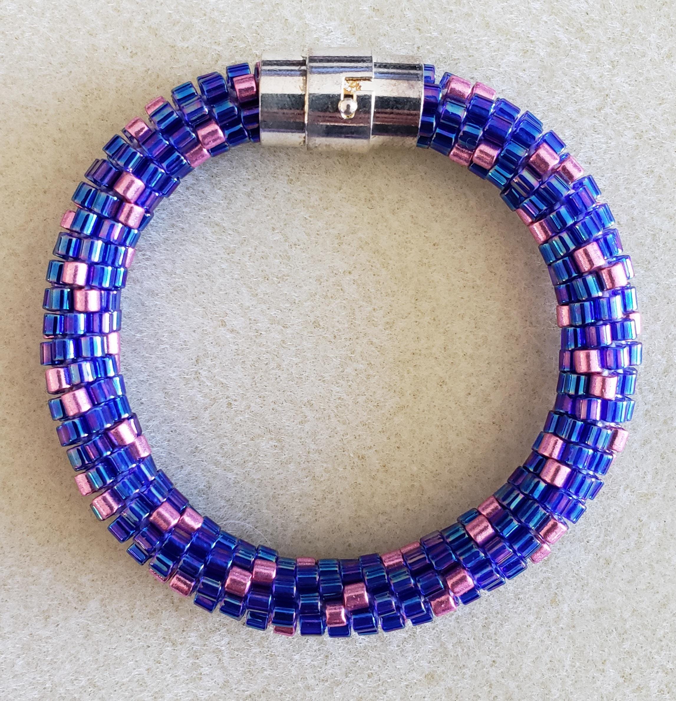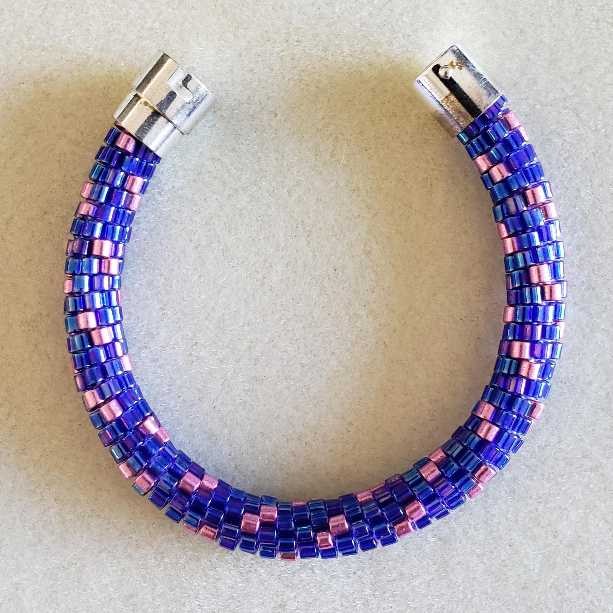 This bracelet measures 8 inches long including the clasp. It is made from high quality glass seed beads and finished off with a silver magnetic safety clasp. One small twist and your bracelet is secure.