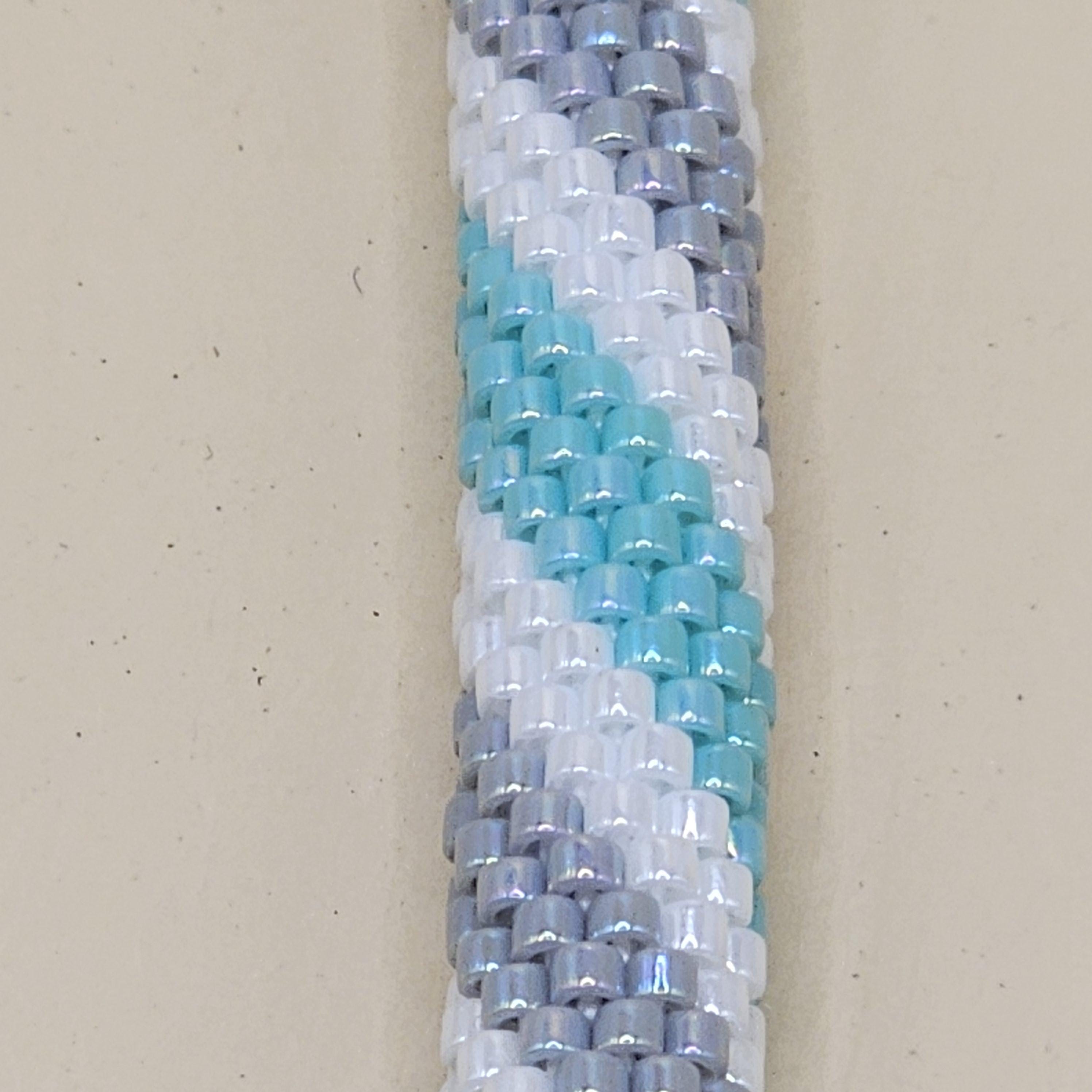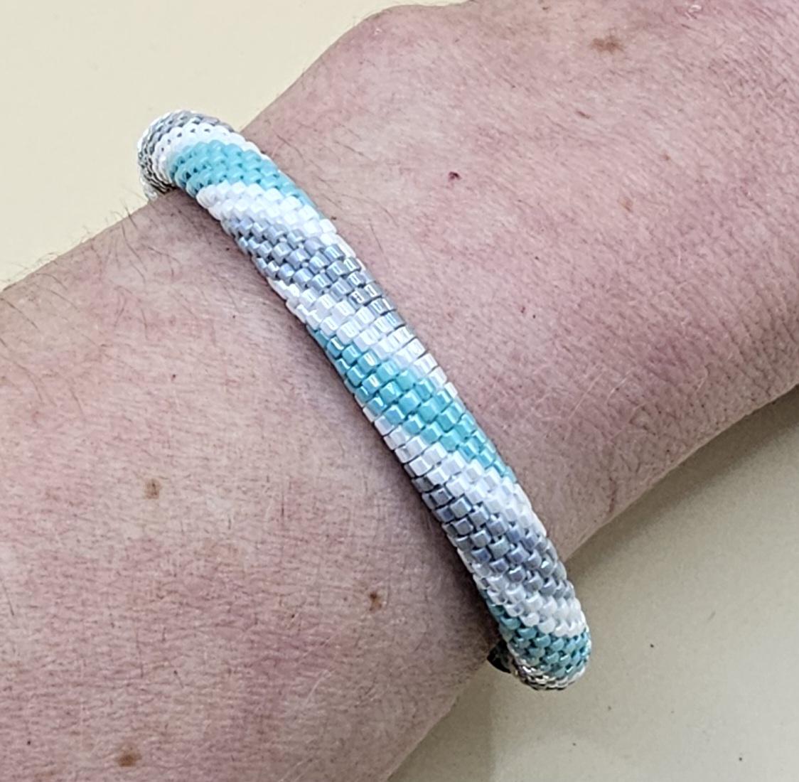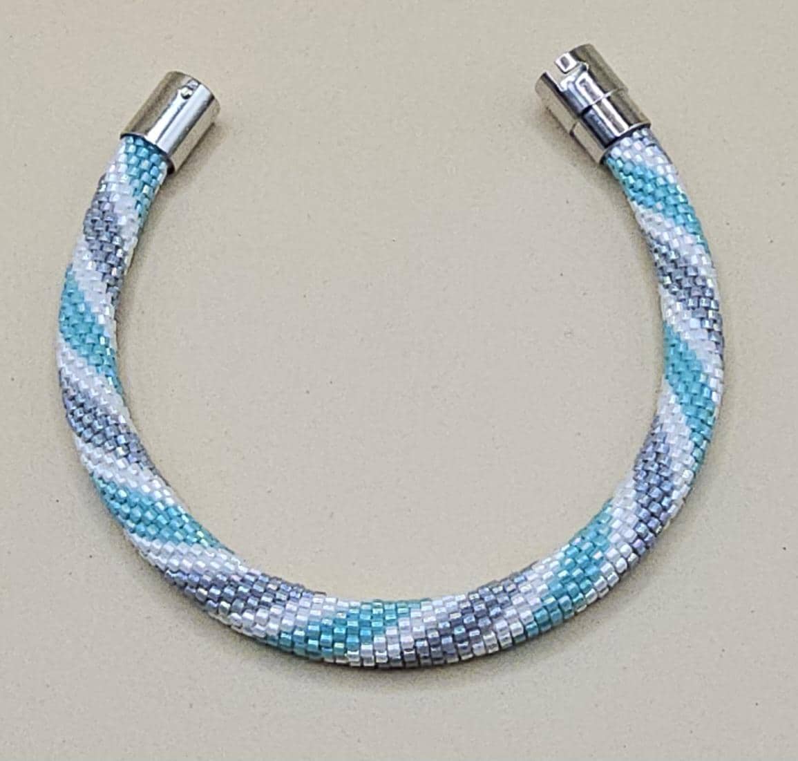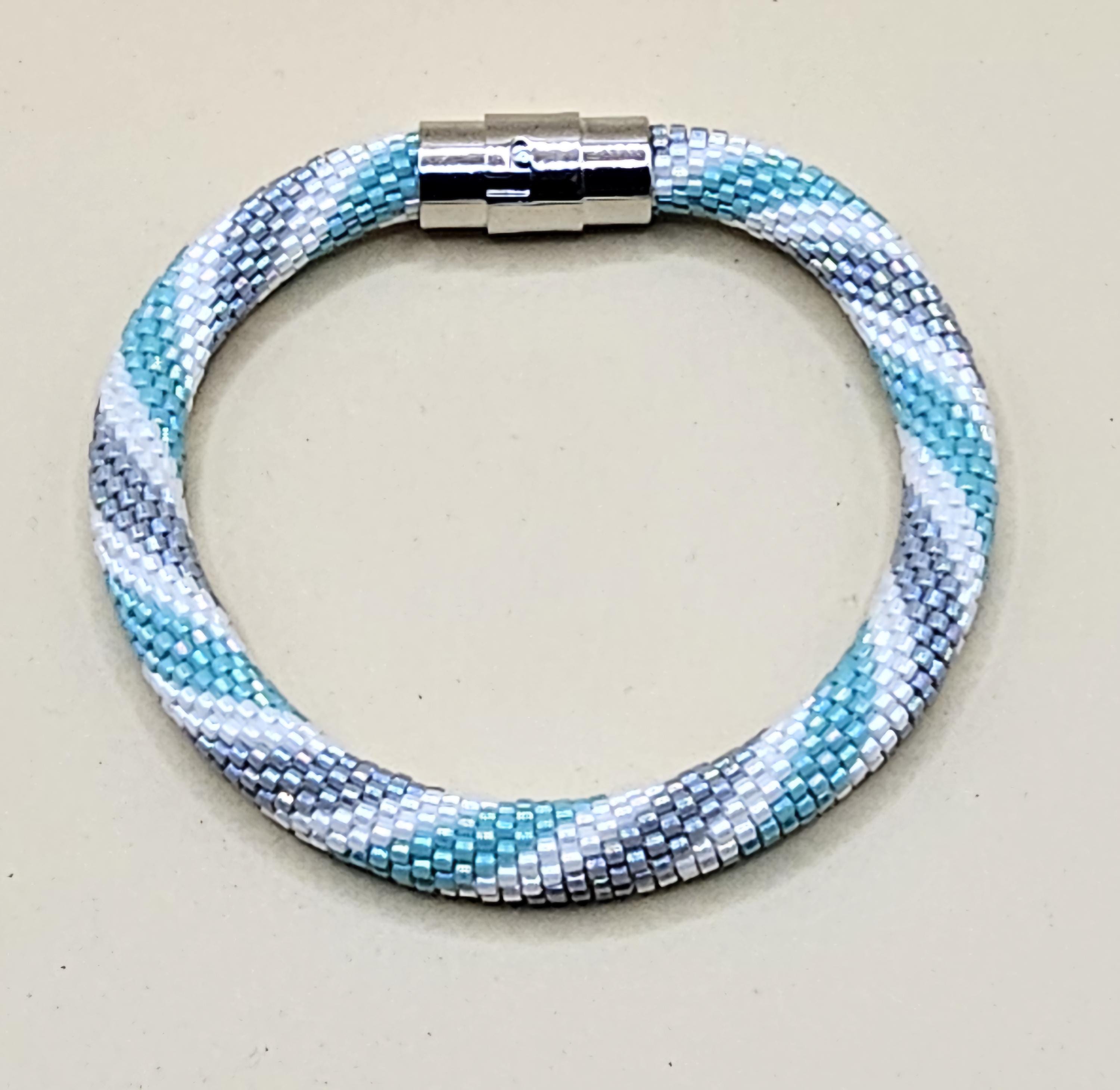 This bracelet measures 7.5 inches including the clasp. It is made from high quality glass seed beads and finished off with a magnetic safety clasp. One small twist and your bracelet is secure.