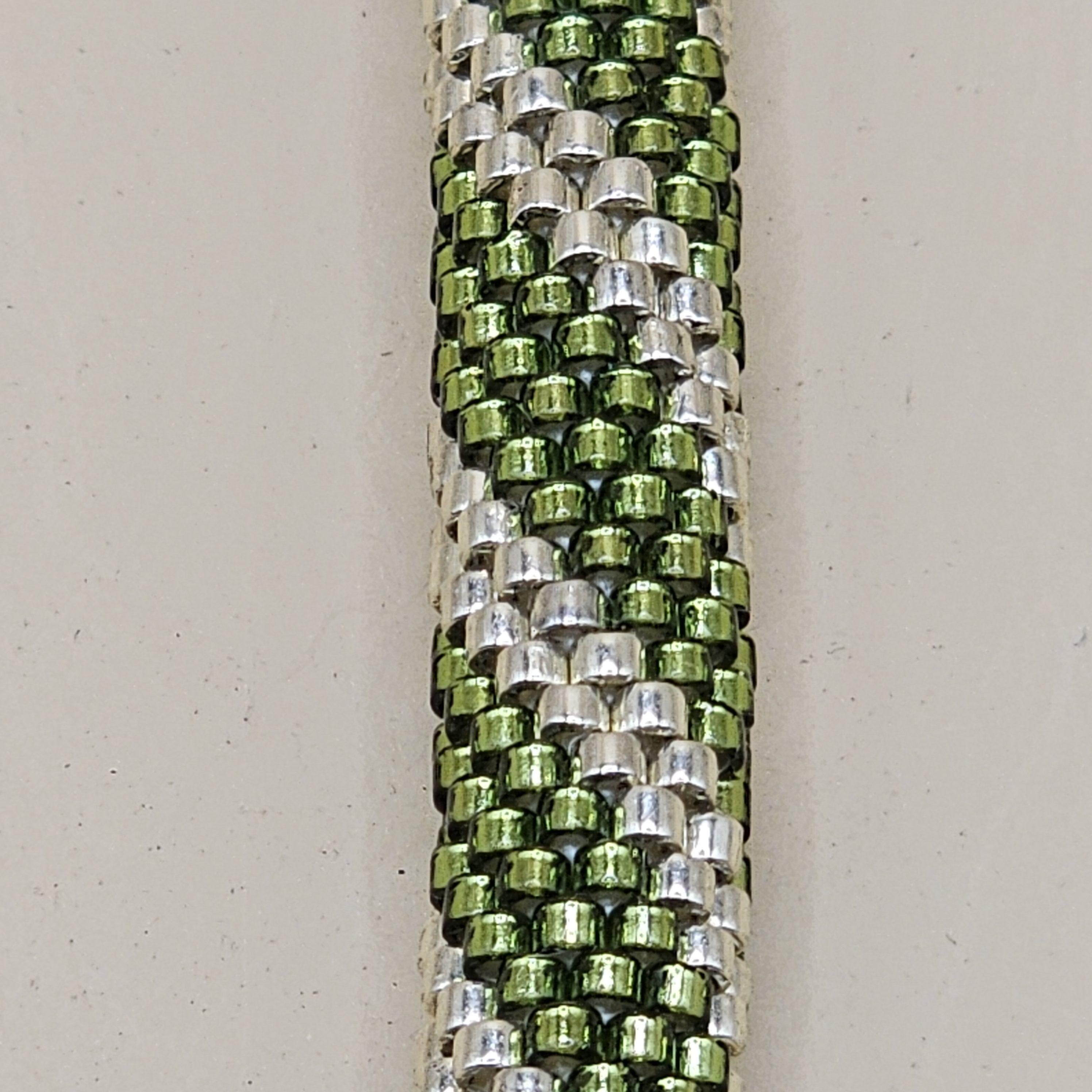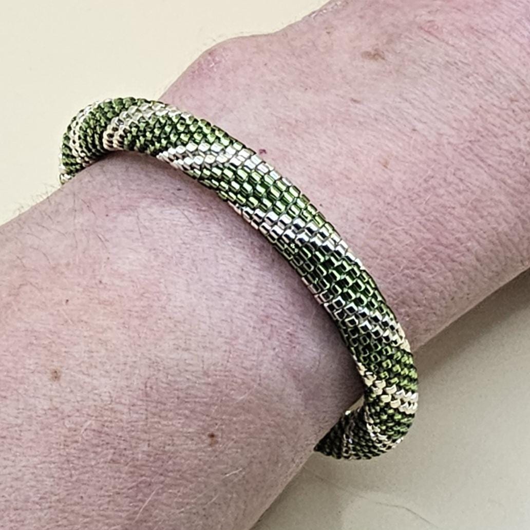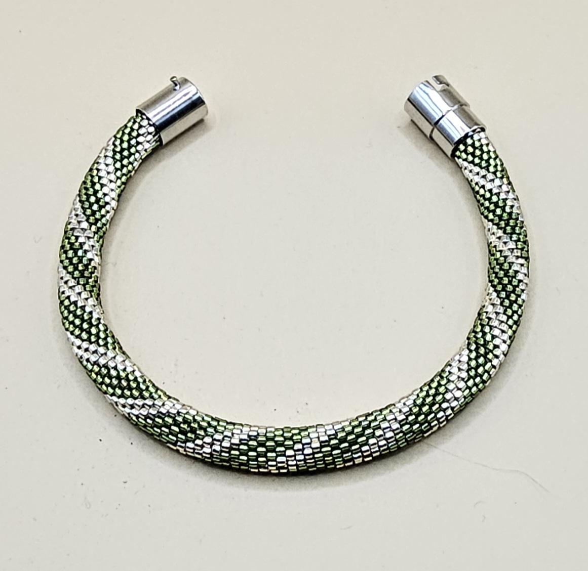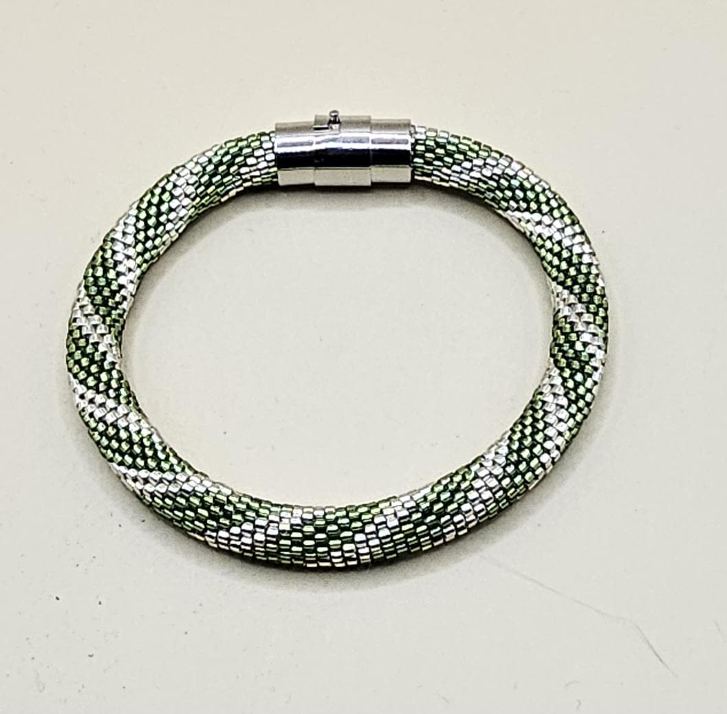 This bracelet measures 7.5 inches including the clasp. It is made from high quality glass seed beads and finished off with a magnetic safety clasp. One small twist and your bracelet is secure.