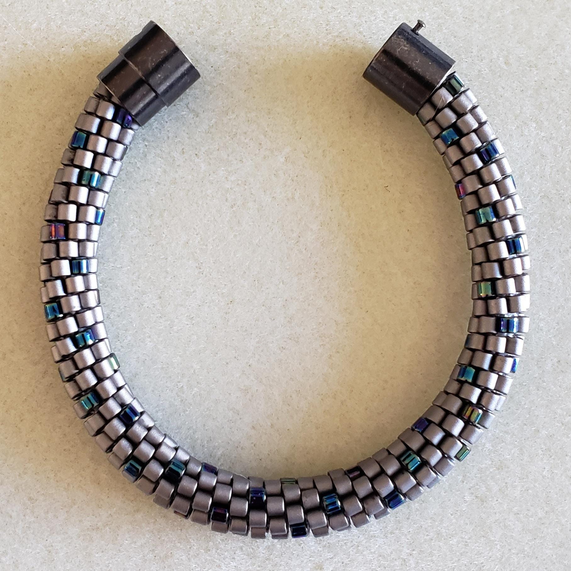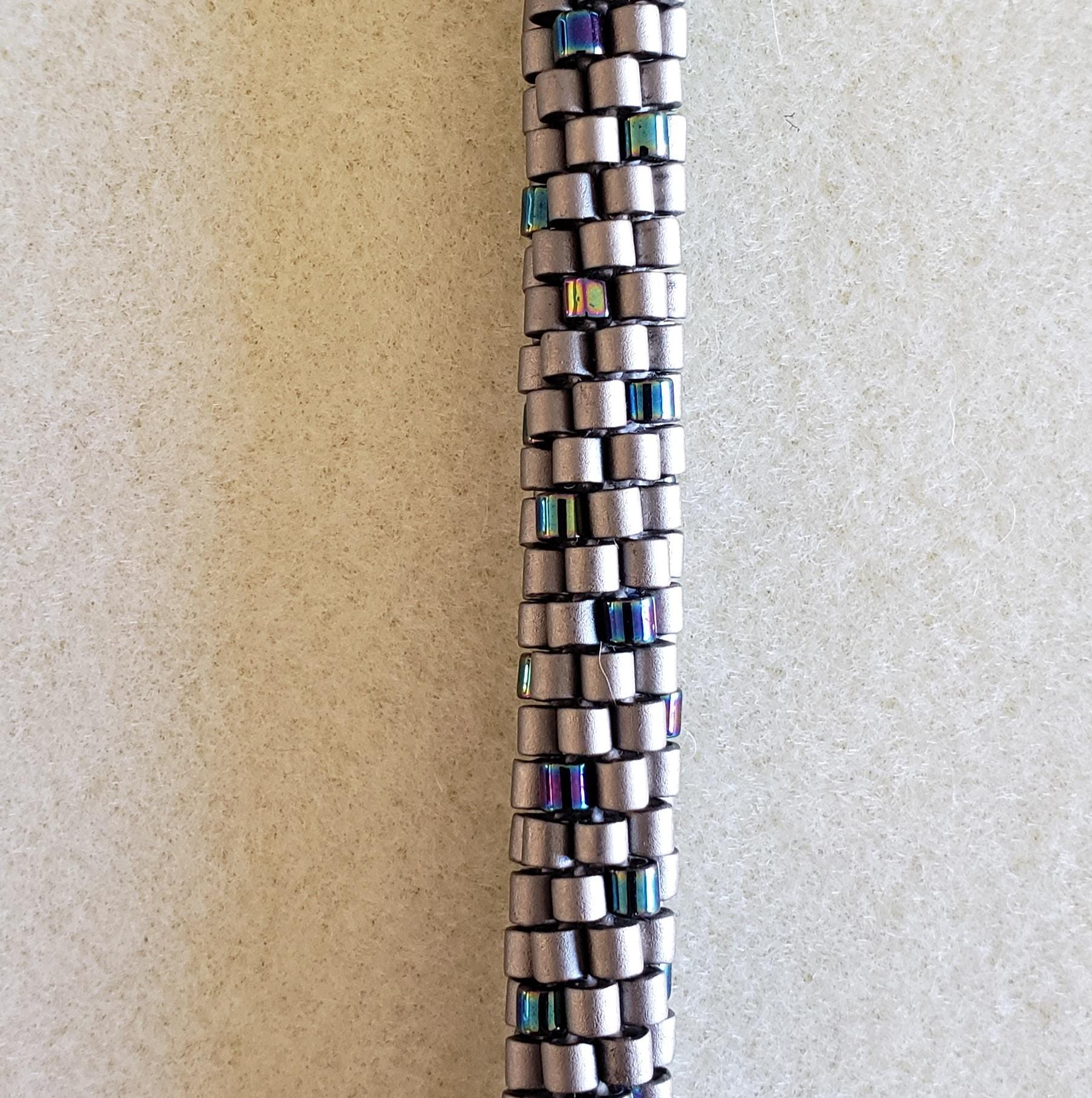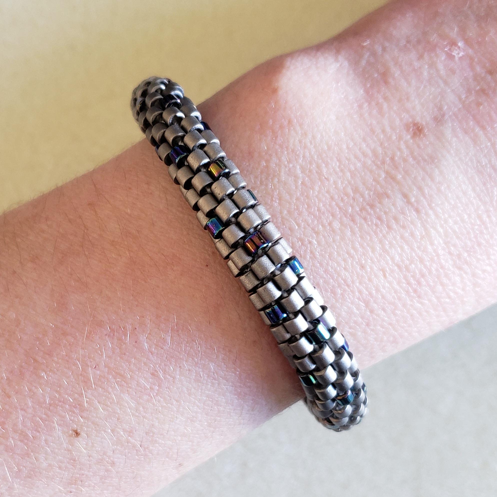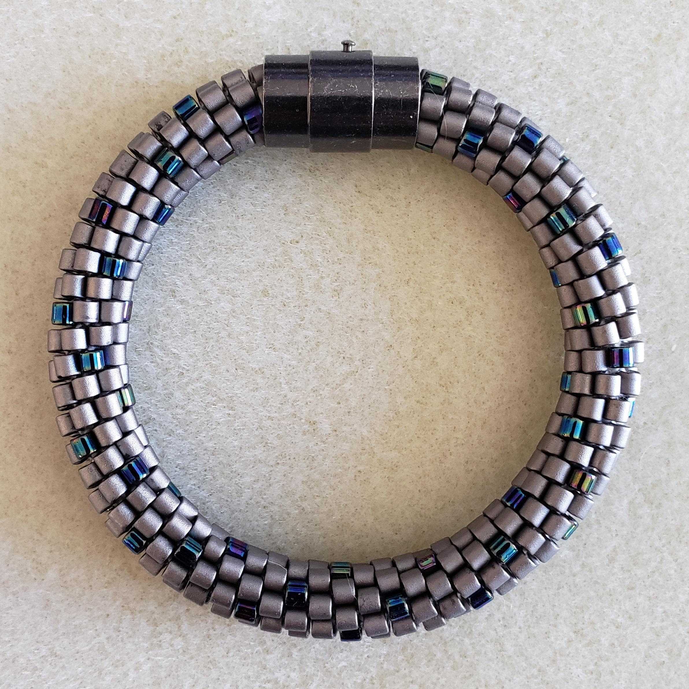 This bracelet measures 8 inches long including the clasp. It is made from high quality glass seed beads and finished off with a gunmetal magnetic safety clasp. One small twist and your bracelet is secure.