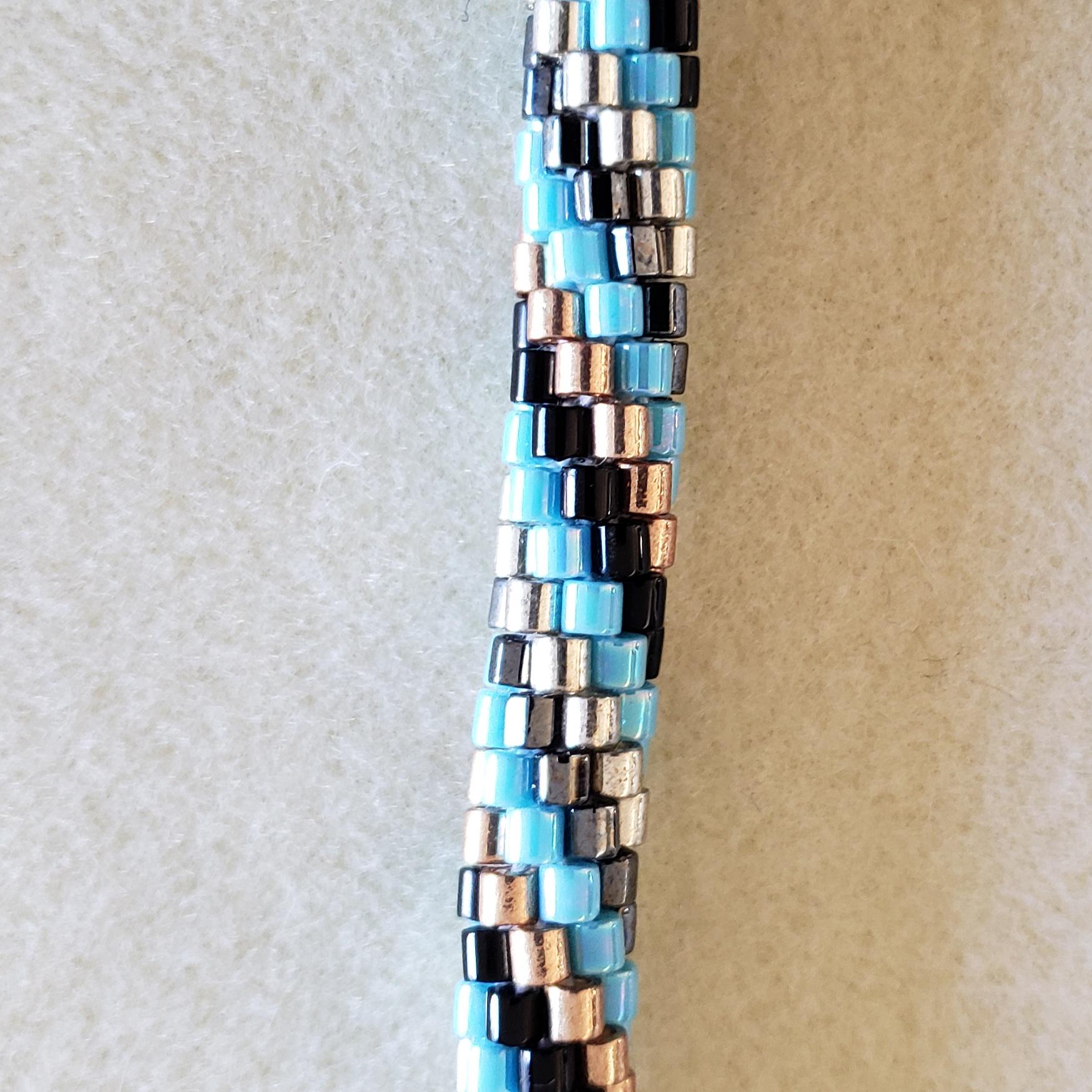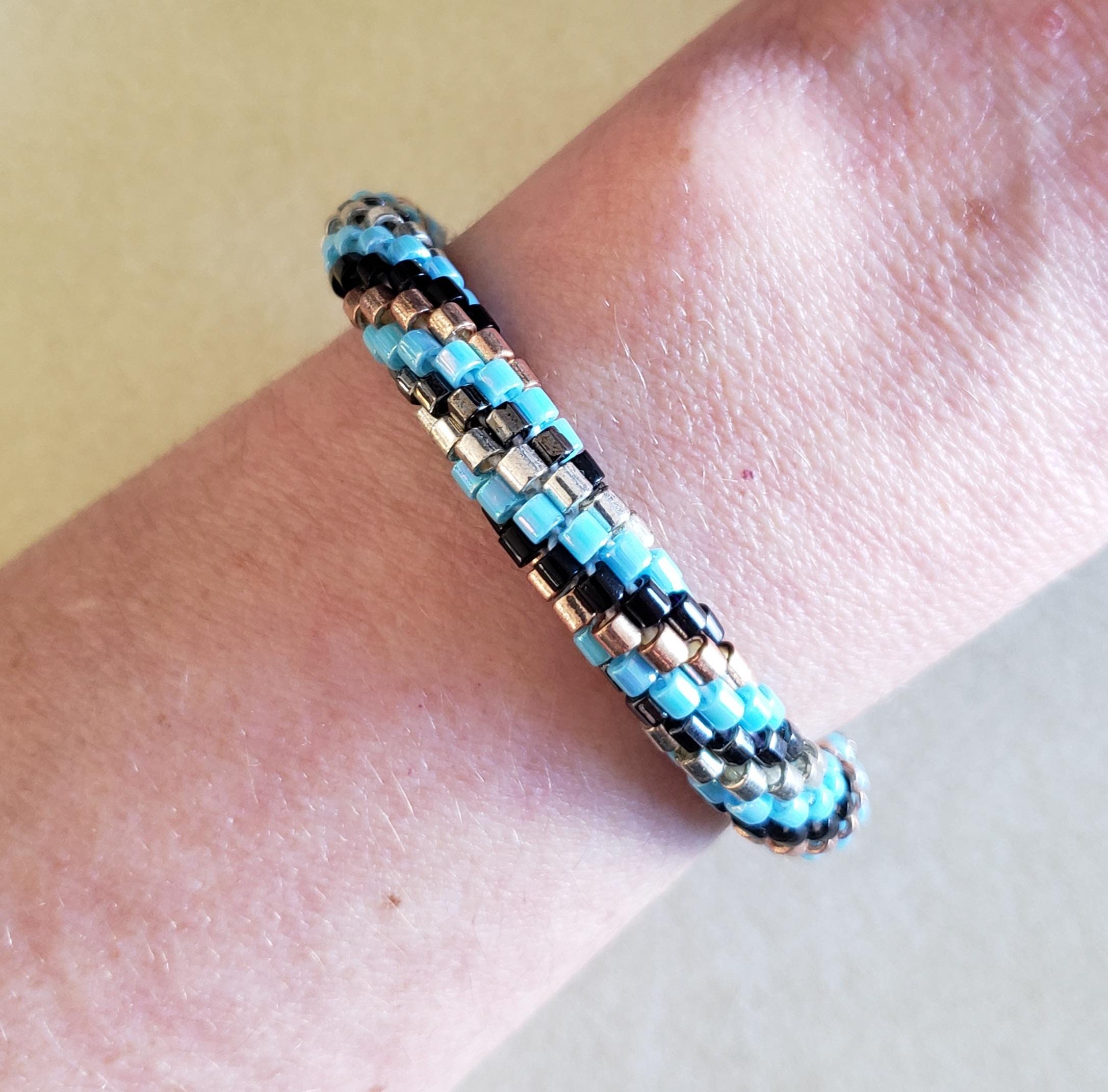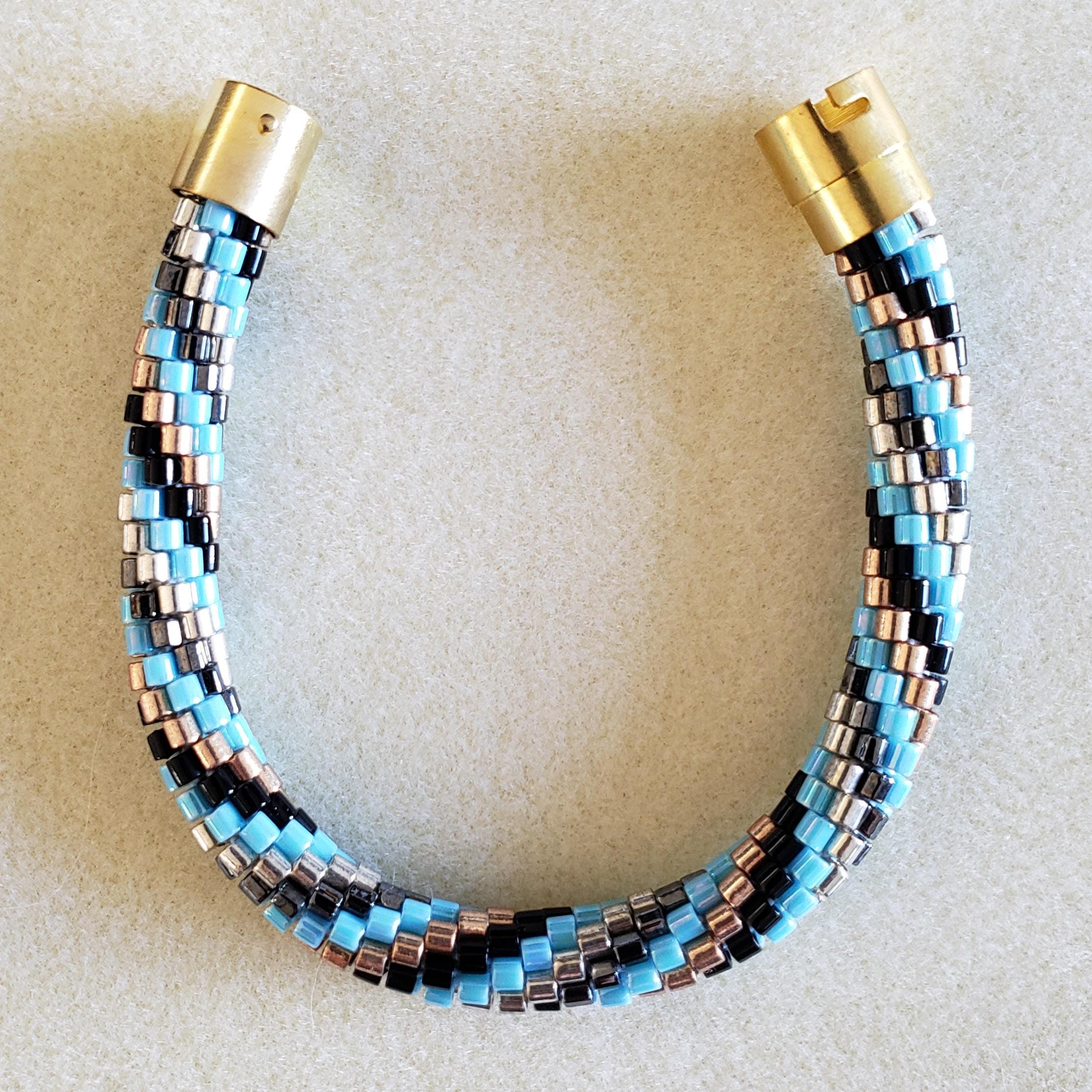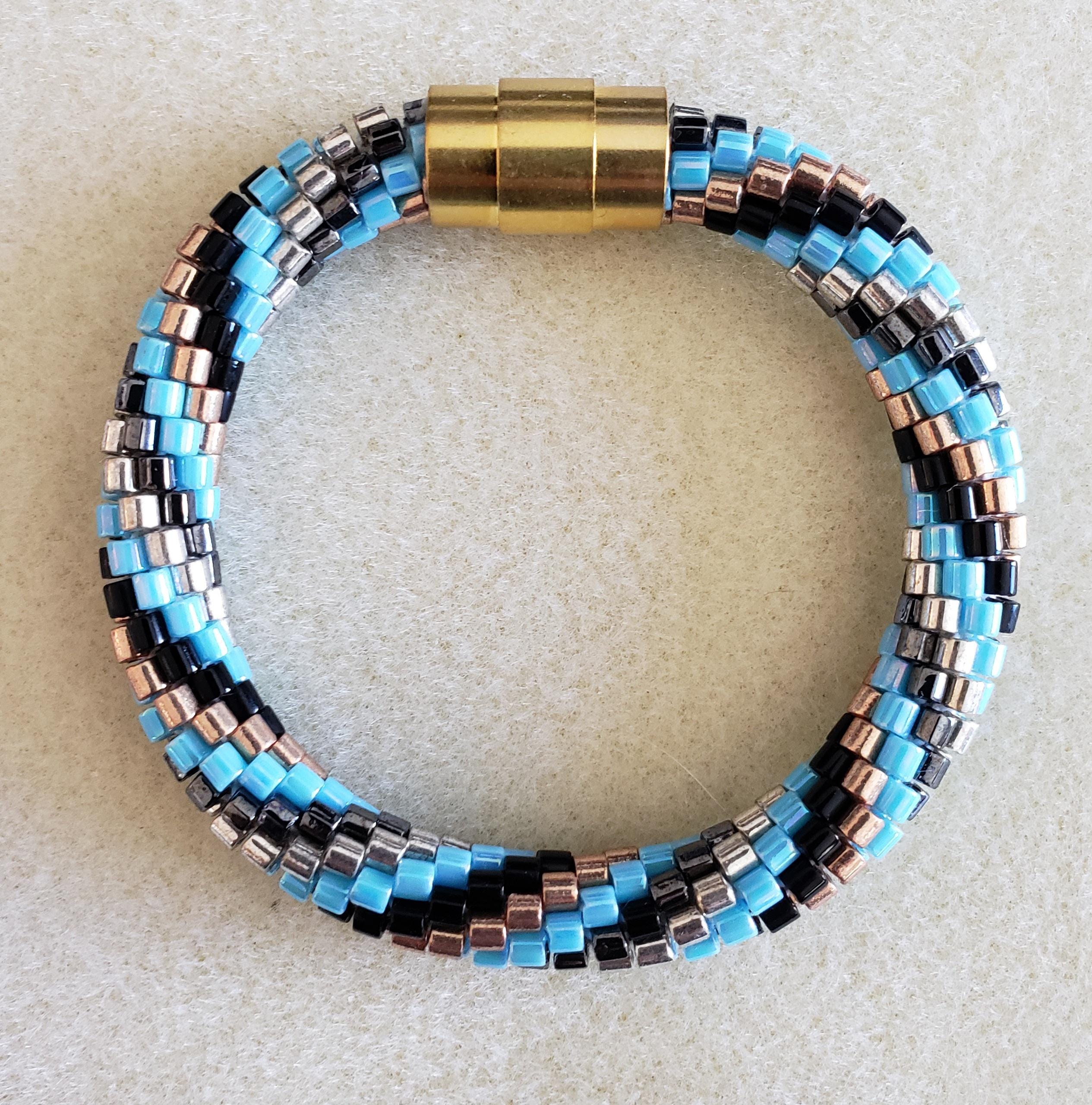 This bracelet measures 8 inches long including the clasp. It is crocheted with high quality glass seed beads and finished off with a gold magnetic safety clasp. One small twist and your bracelet is secure.
