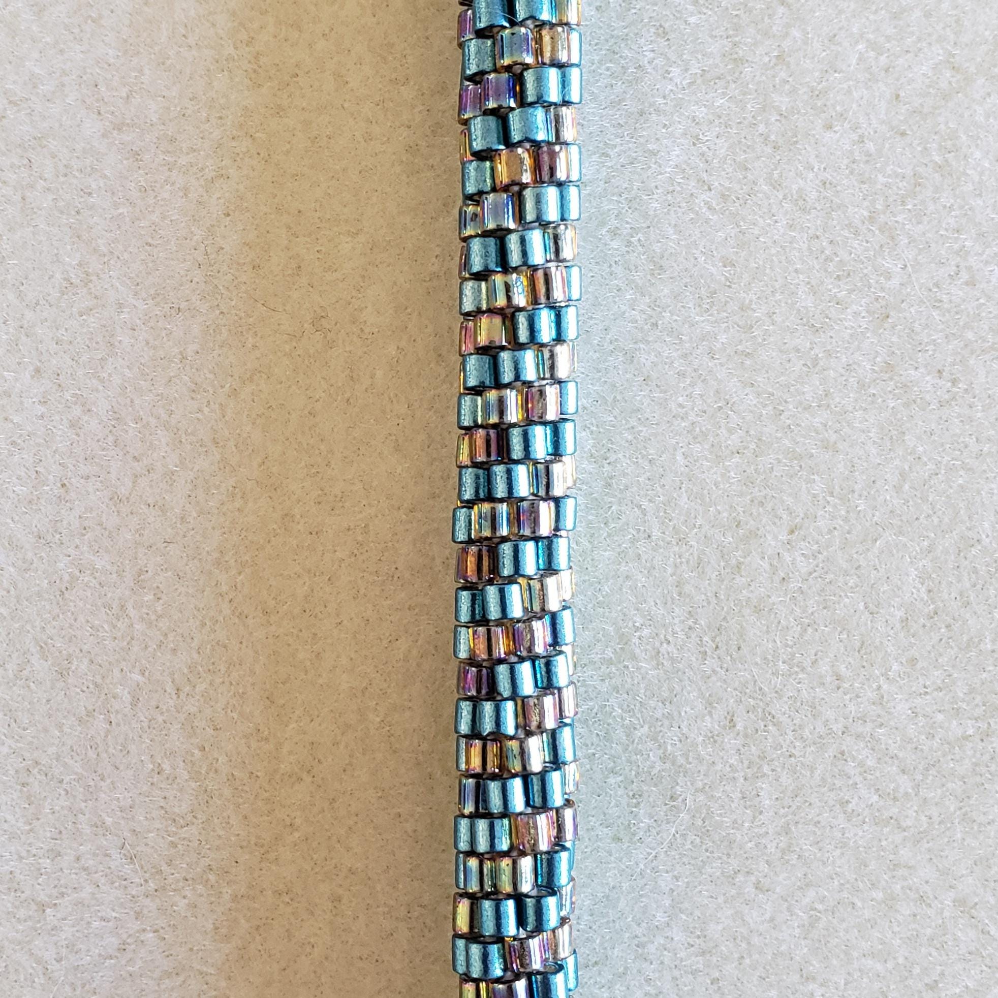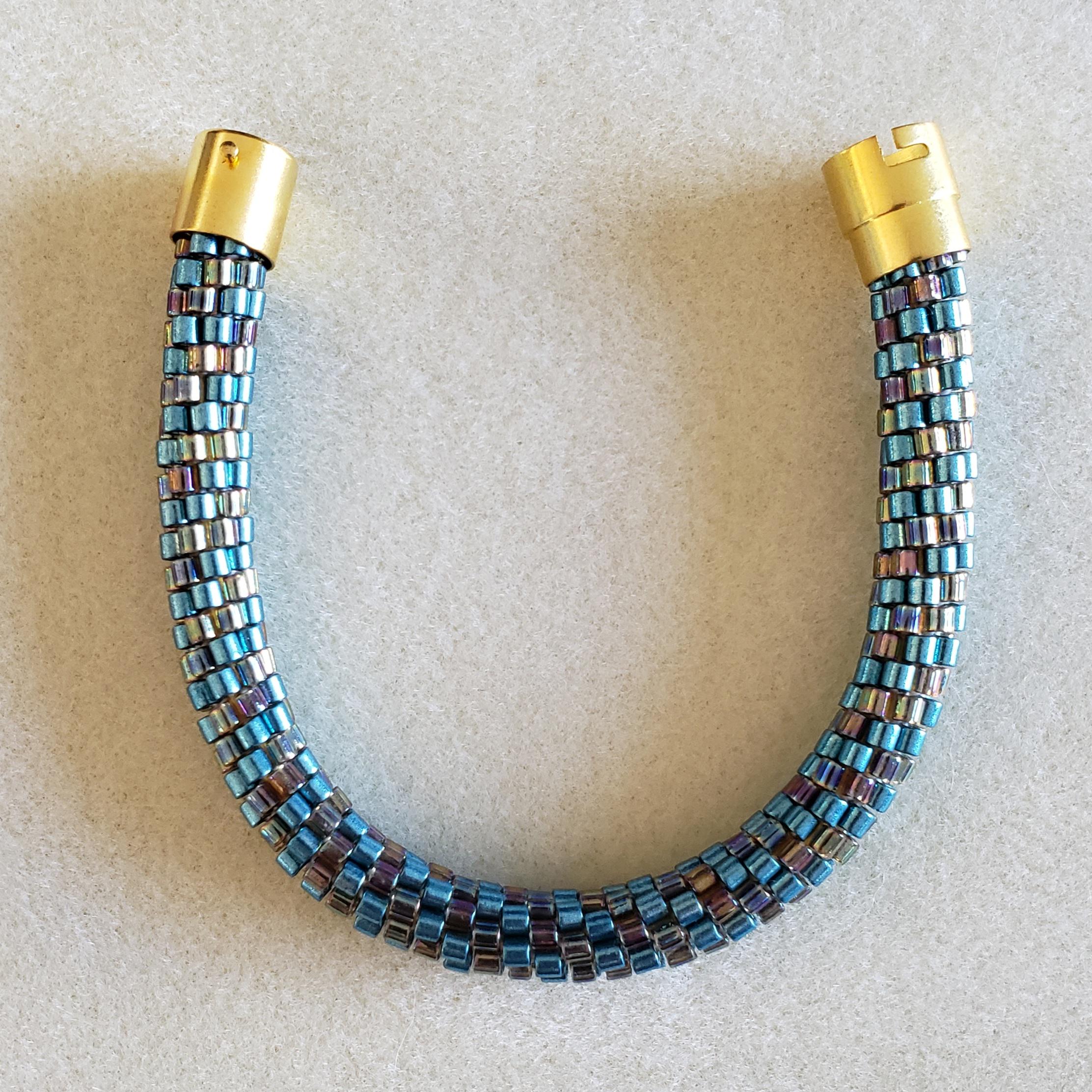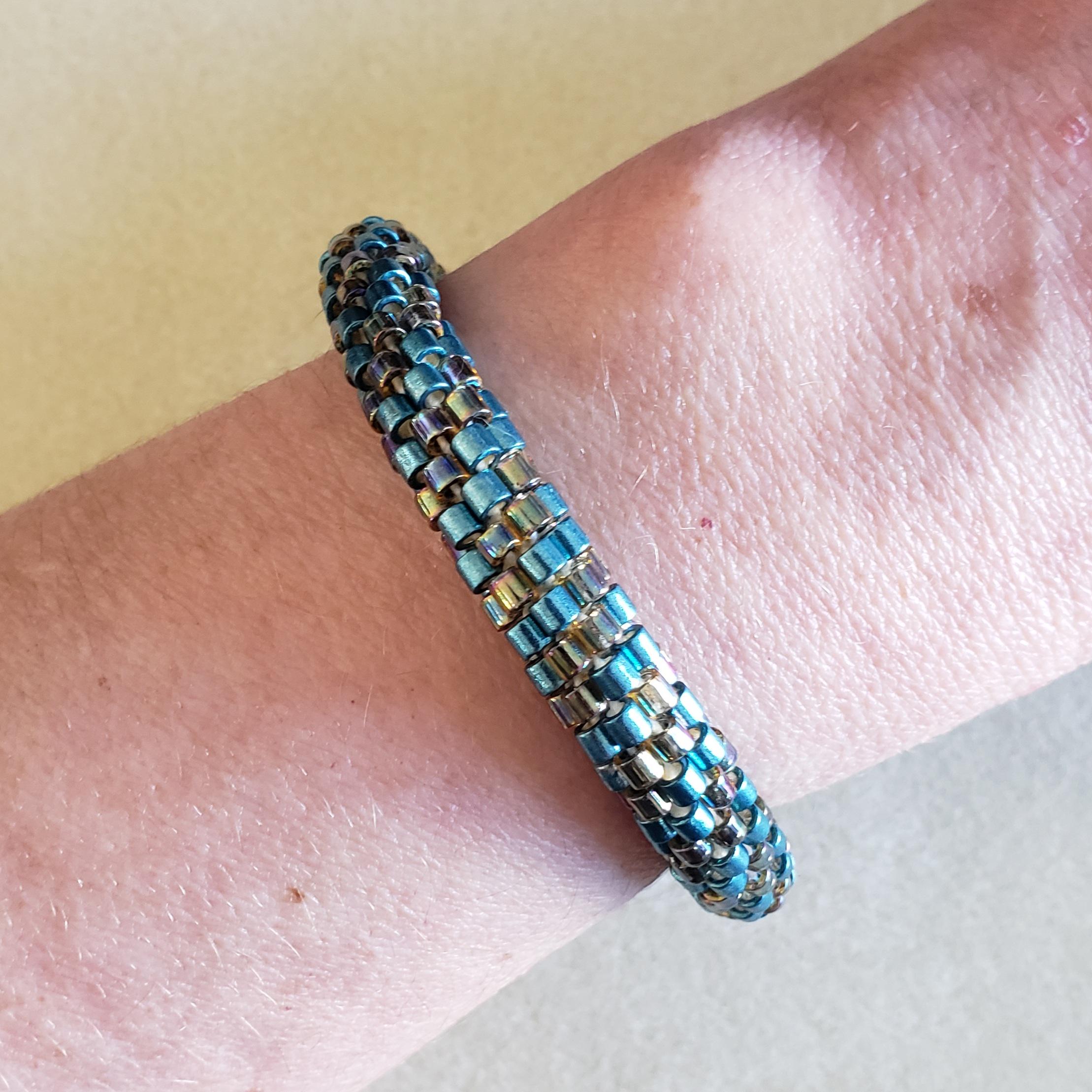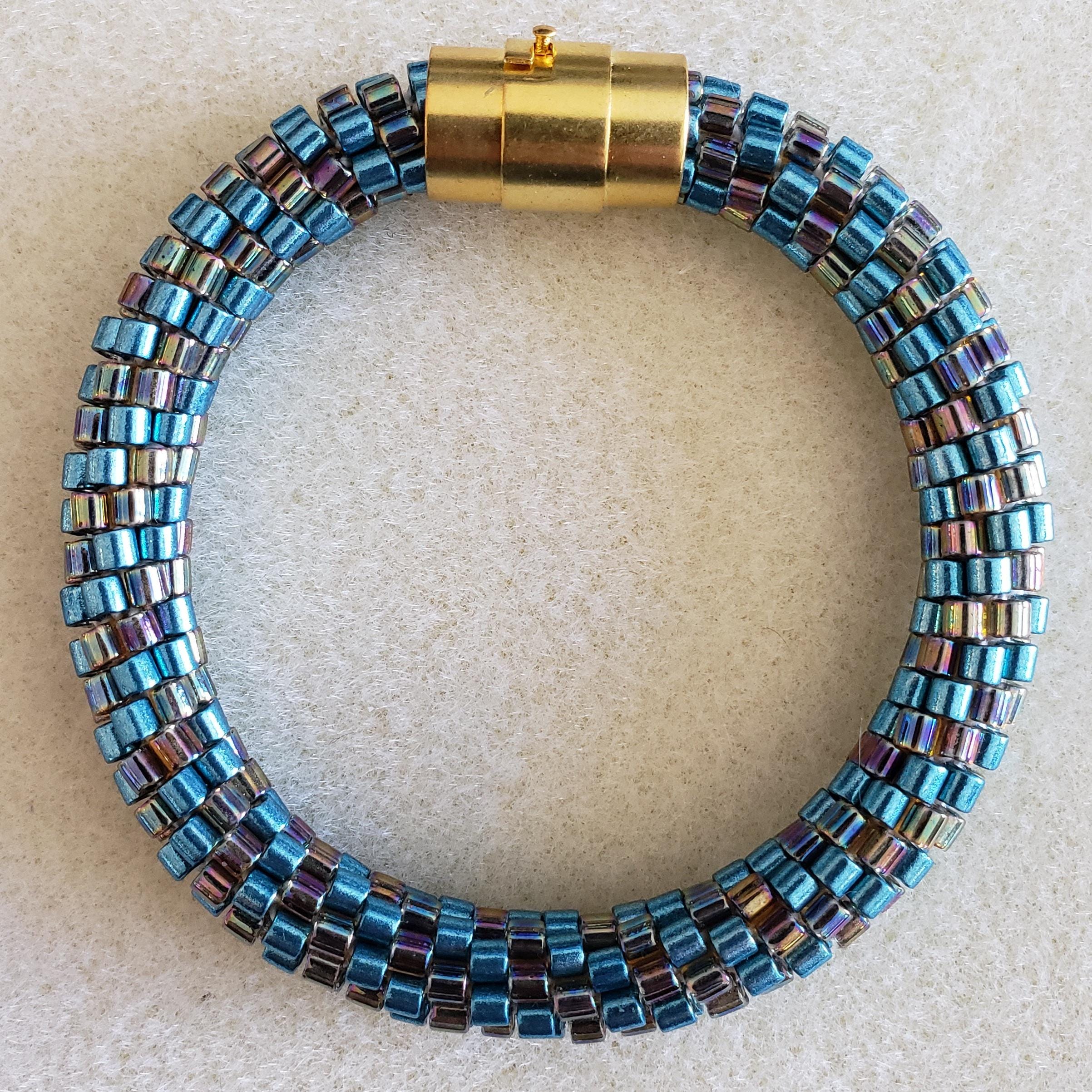 This bracelet measures 8 inches long including the clasp. It is crocheted with high quality glass seed beads and finished off with a gold magnetic safety clasp. One small twist and your bracelet is secure.