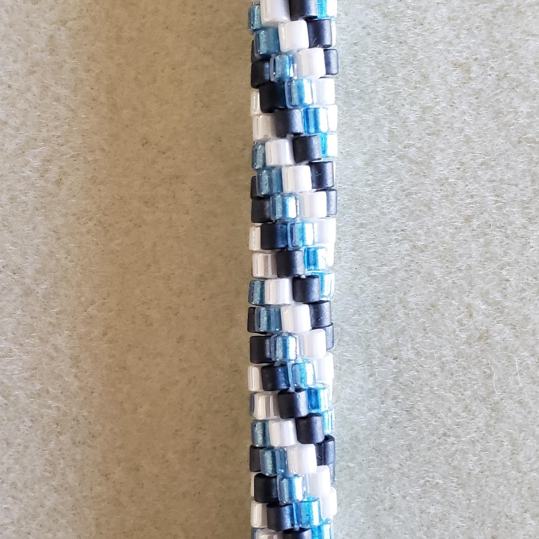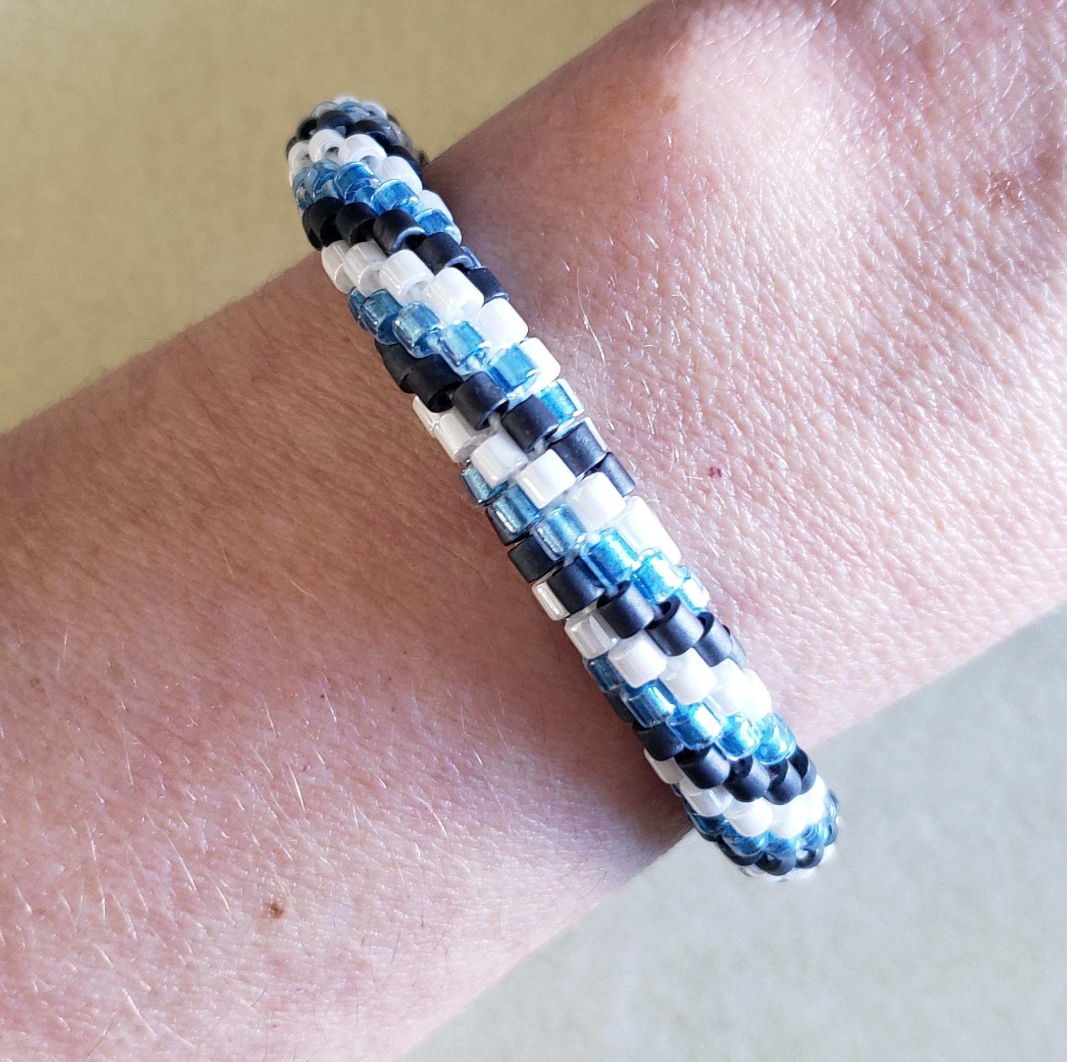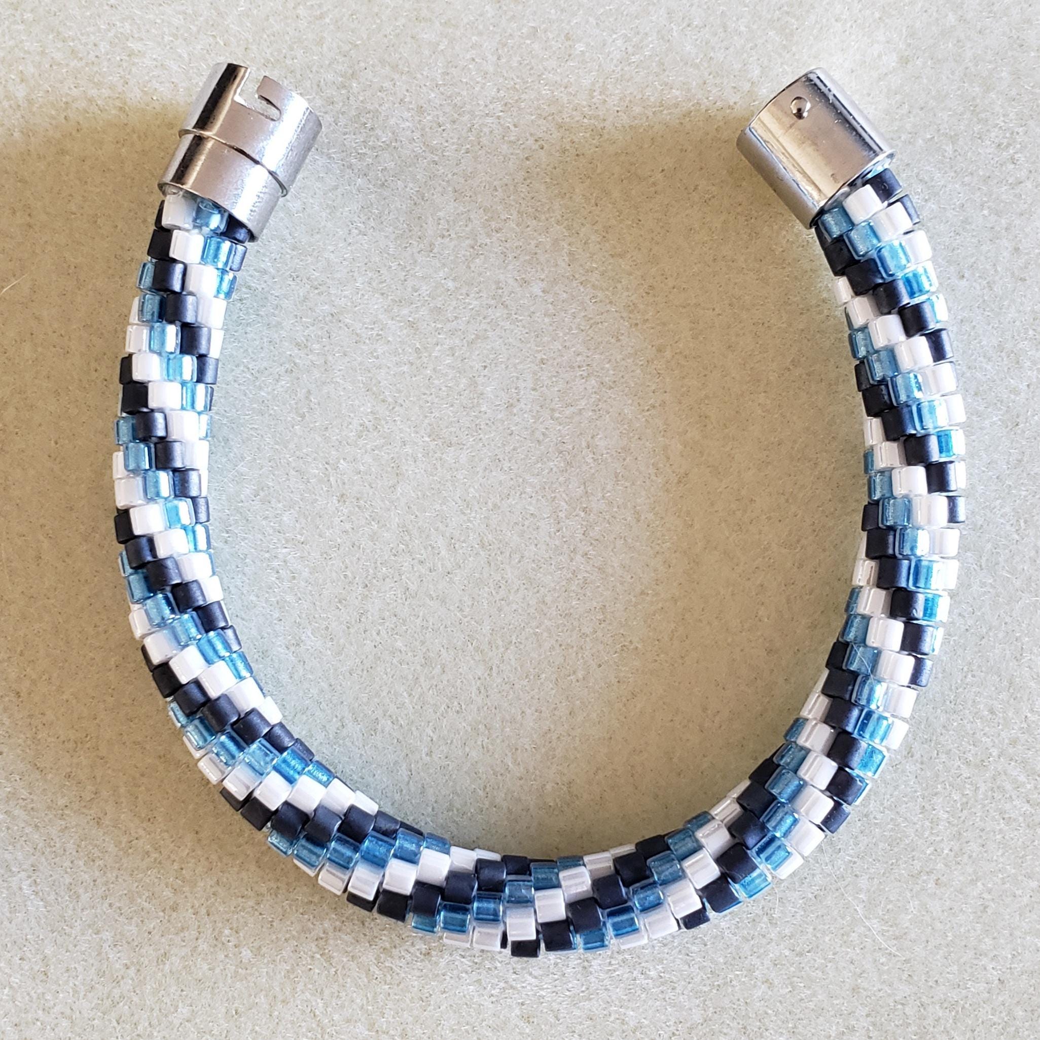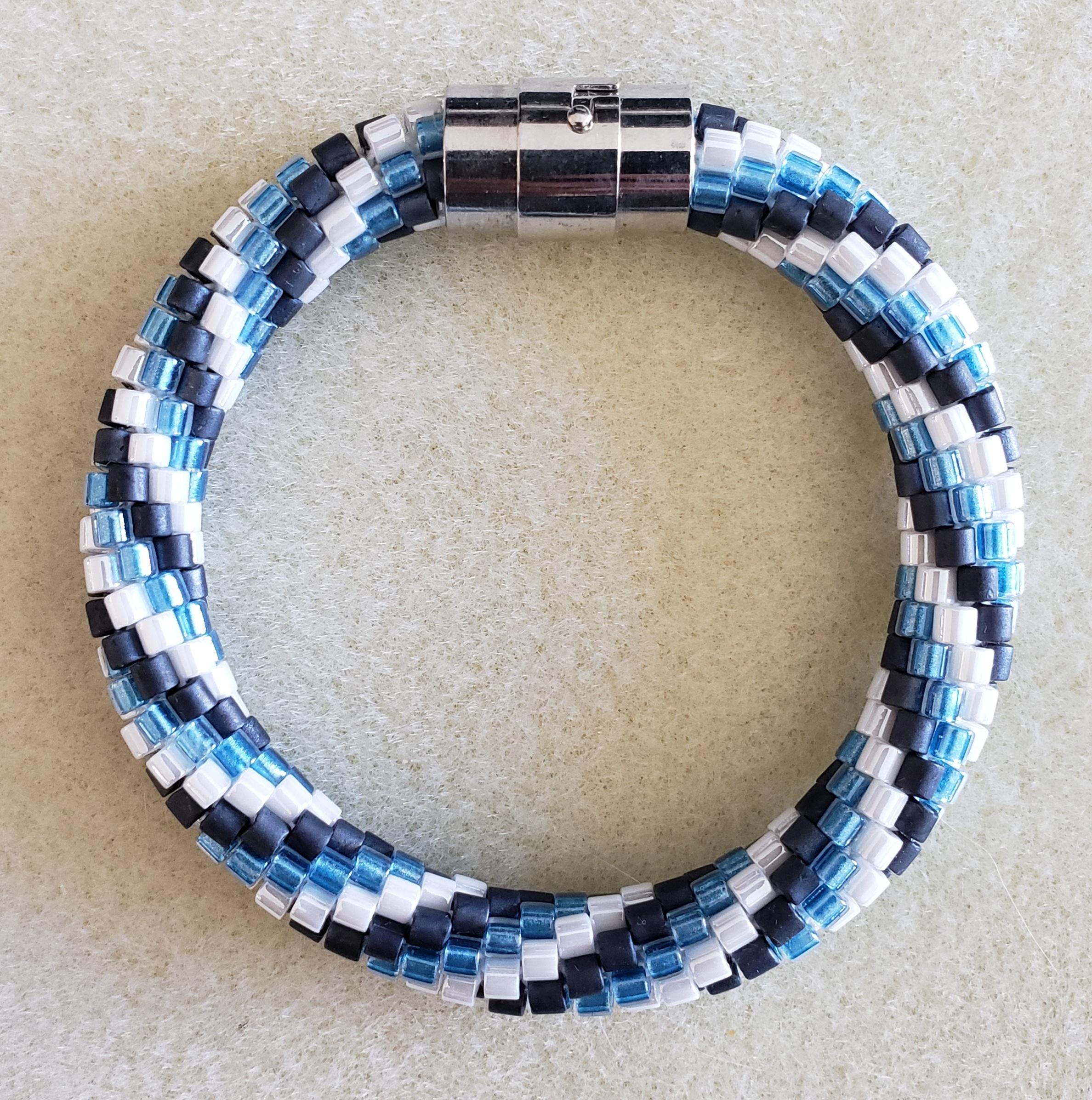 This bracelet measures 8 inches long including the clasp. It is crocheted with high quality glass seed beads and finished off with a silver magnetic safety clasp. One small twist and your bracelet is secure.