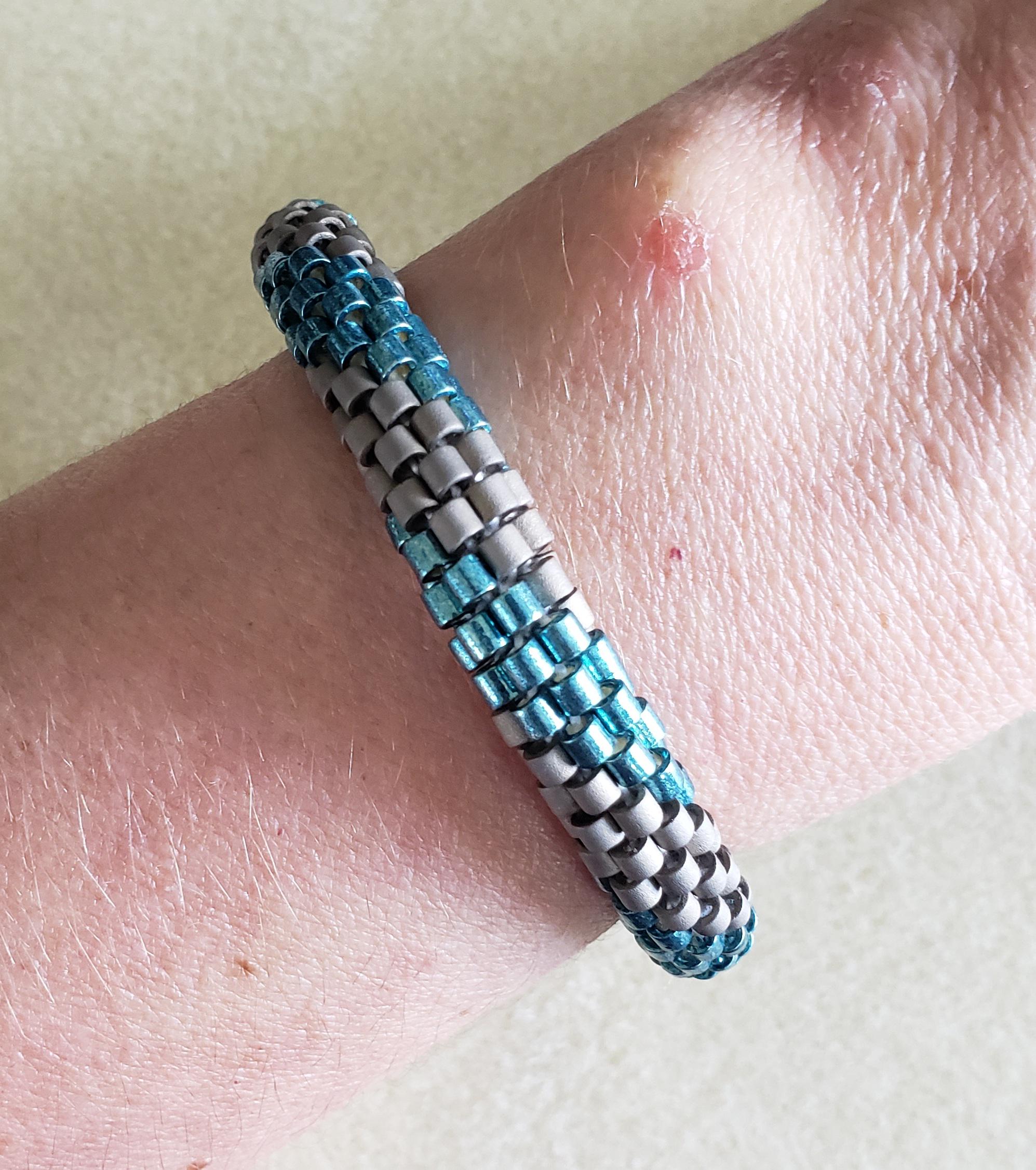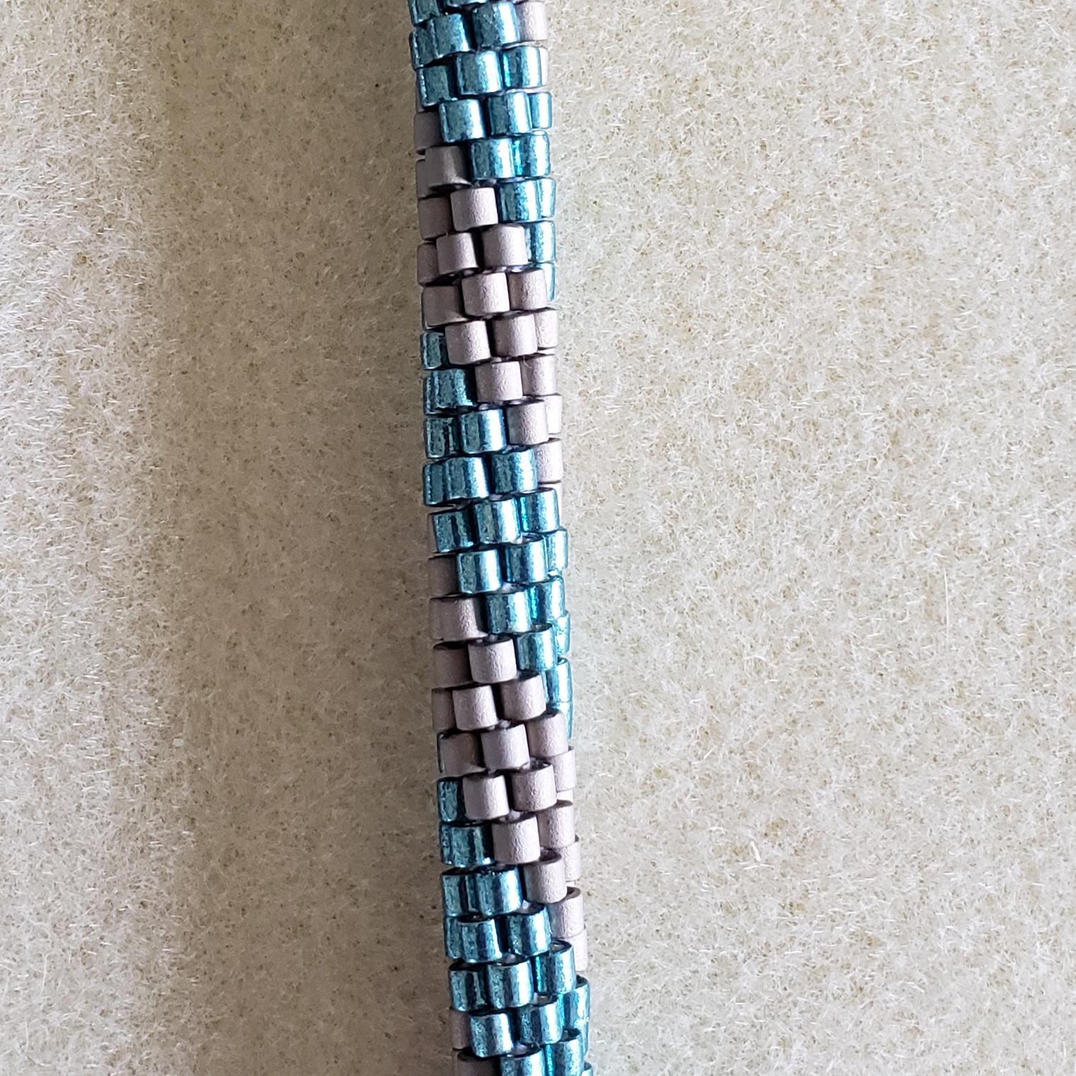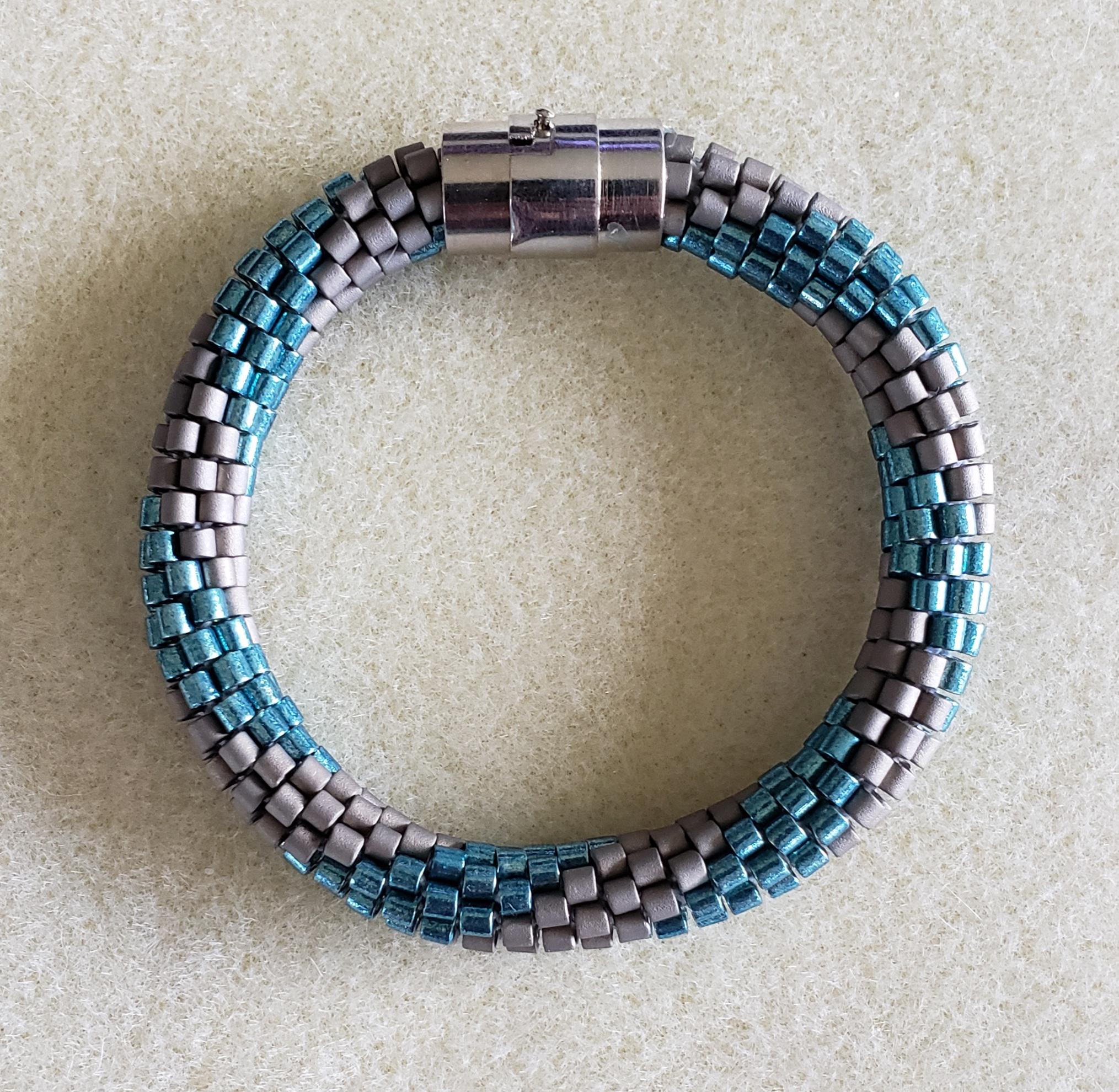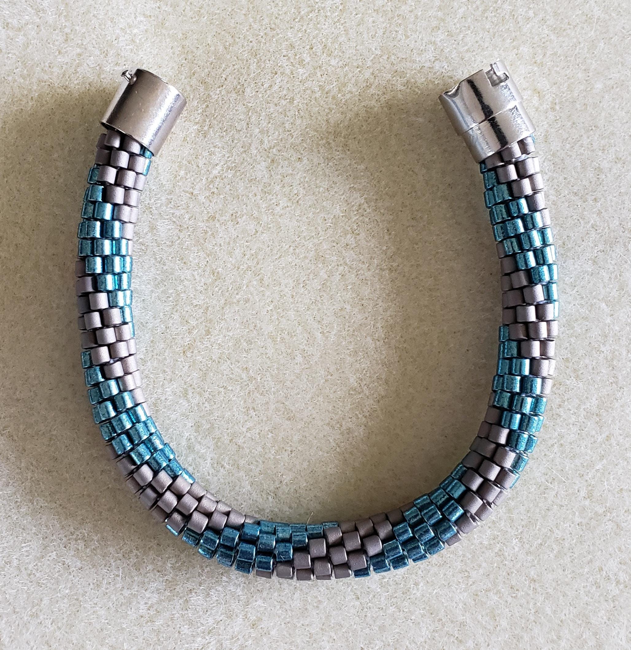 This bracelet measures 8 inches long including the clasp. It is crocheted with high quality glass seed beads and finished off with a silver magnetic safety clasp. One small twist and your bracelet is secure.