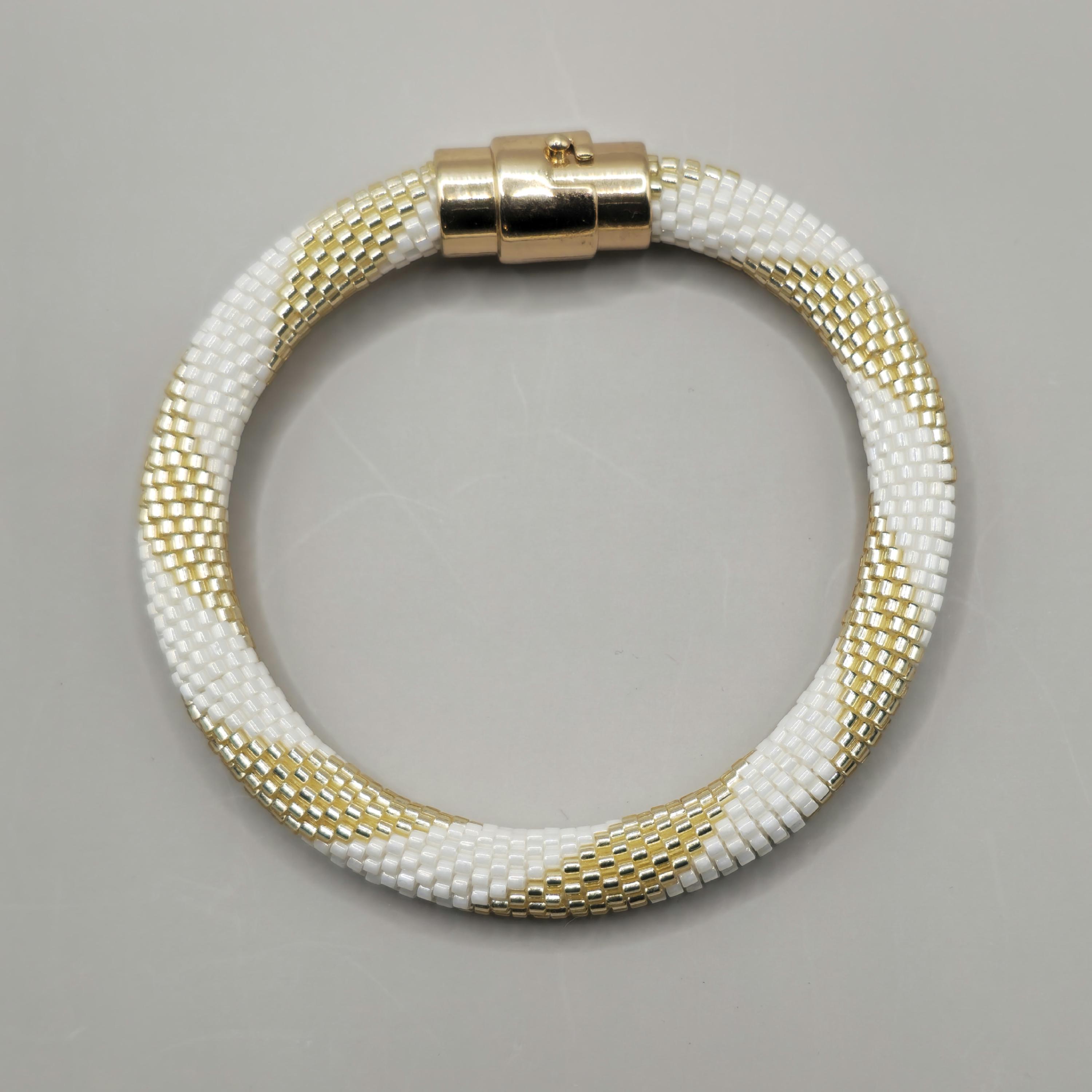 This bracelet measures 7.5 inches long, including the clasp. It is made from high-quality glass seed beads and finished off with a safety magnetic clasp. One twist and your bracelet stays secure.