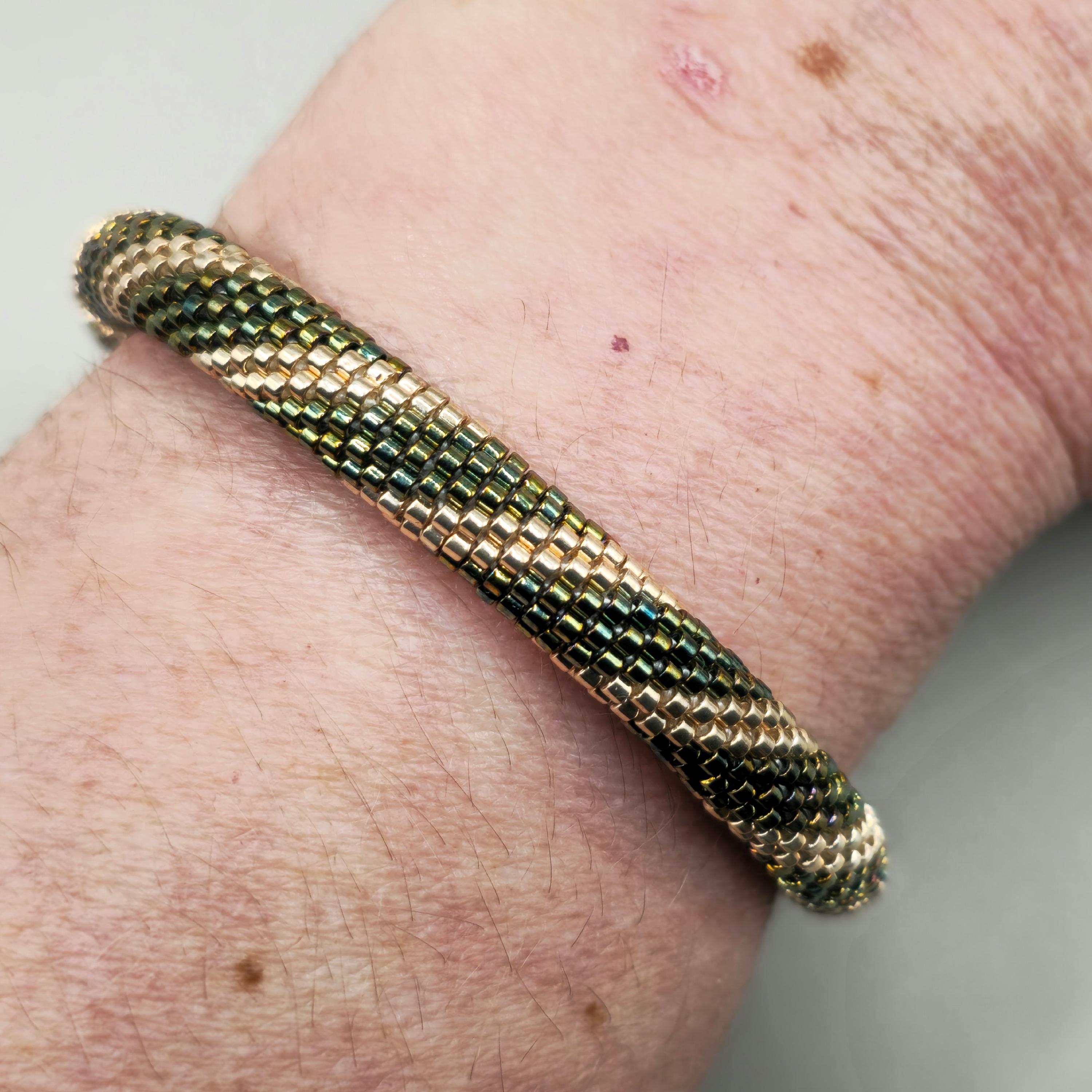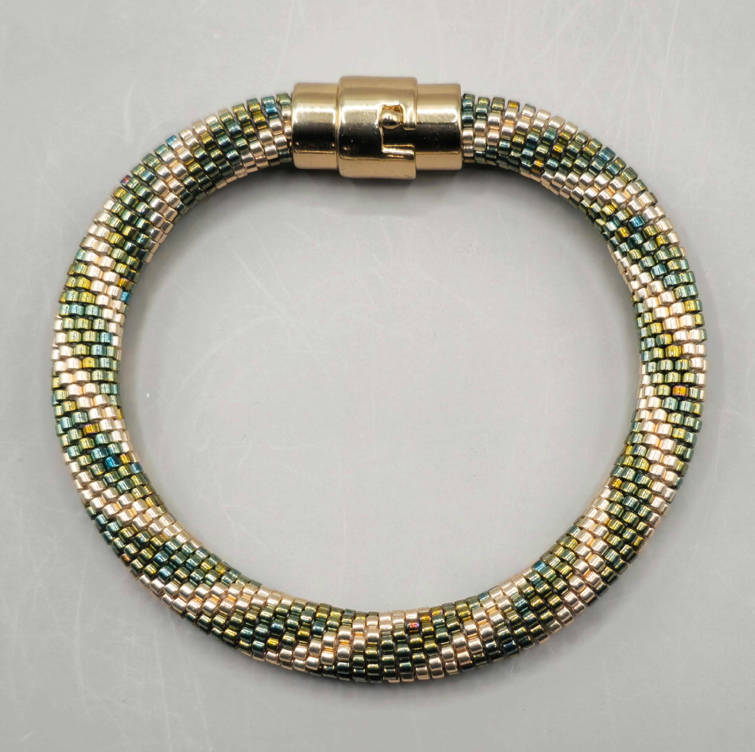 This bracelet measures 7.5 inches, including the clasp. It is made from high-quality seed beads and finished off with a magnetic safety clasp. One small twist and your bracelet is secure.