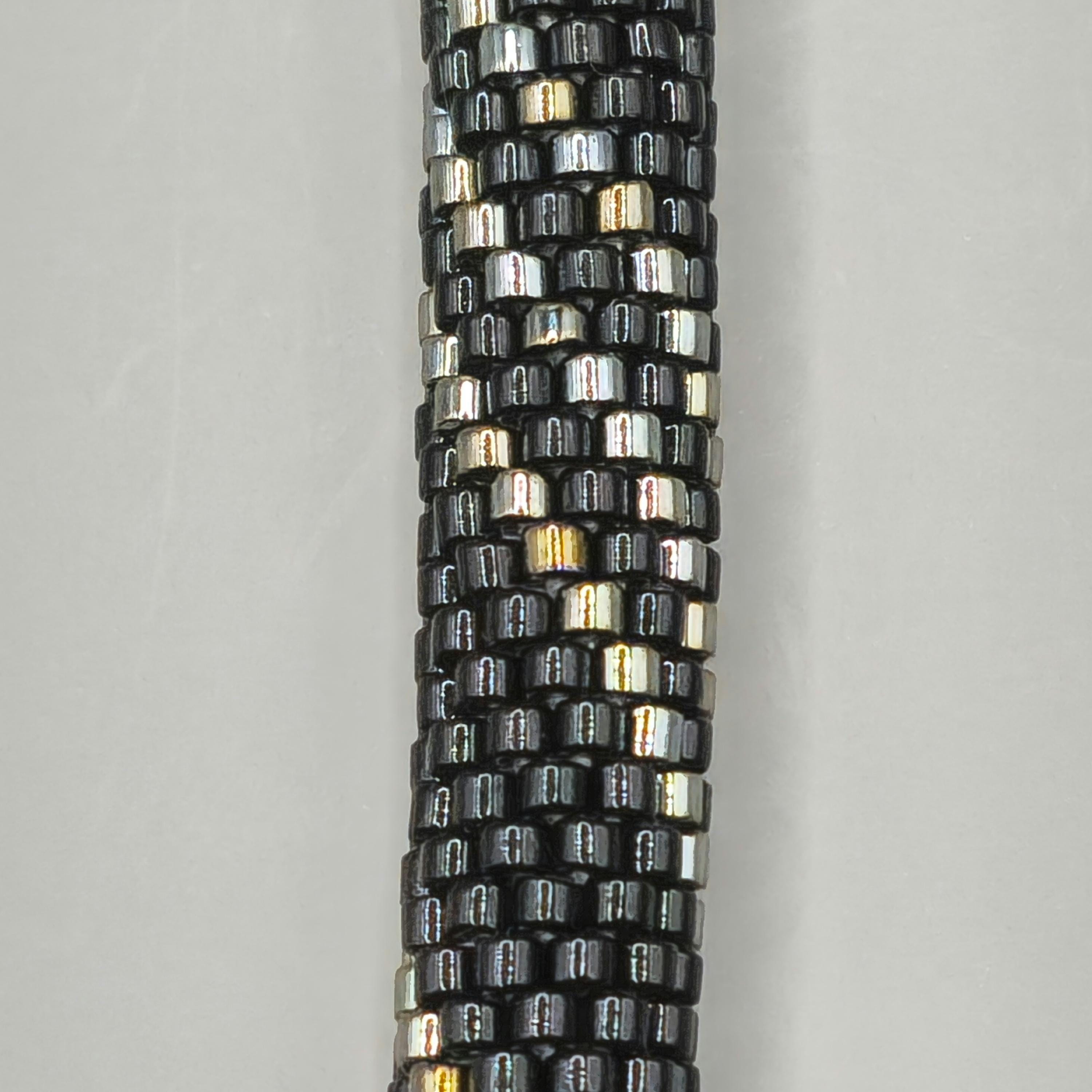 Sleek, modern, and effortlessly bold, the Steel Shadow Crocheted Beaded Bracelet captures the quiet strength of metallic tones and subtle shimmer. Hand-crocheted with care, this bracelet features a striking blend of steel gray and shadowy dark beads that catch the light with every movement, creating a sophisticated yet understated sparkle.