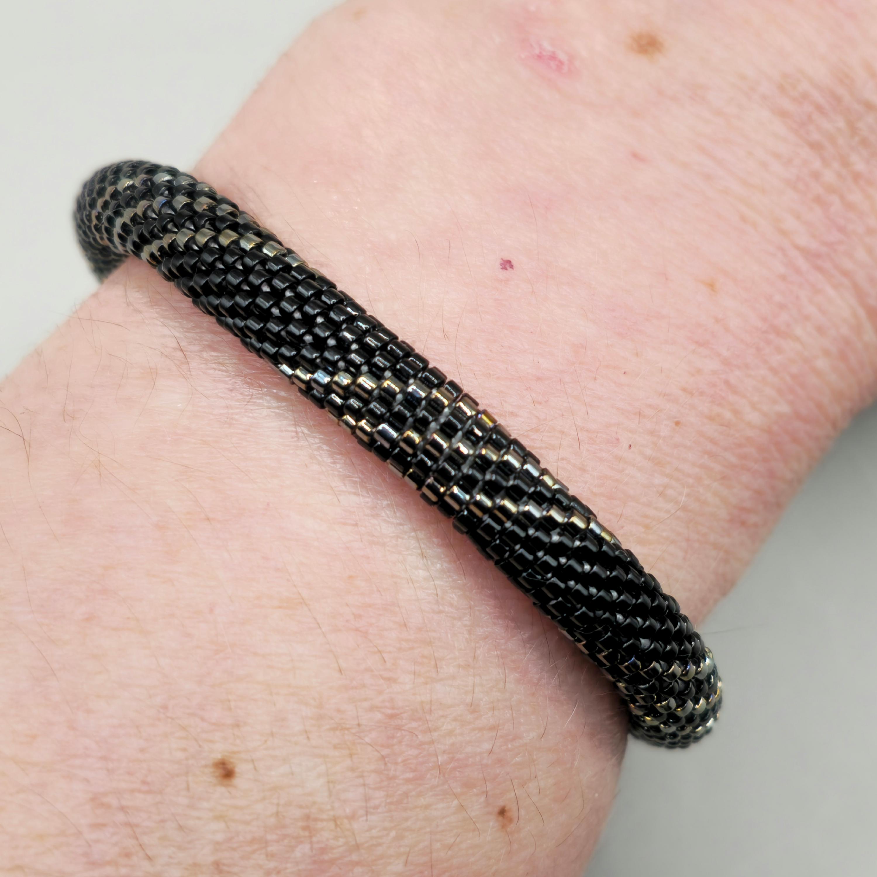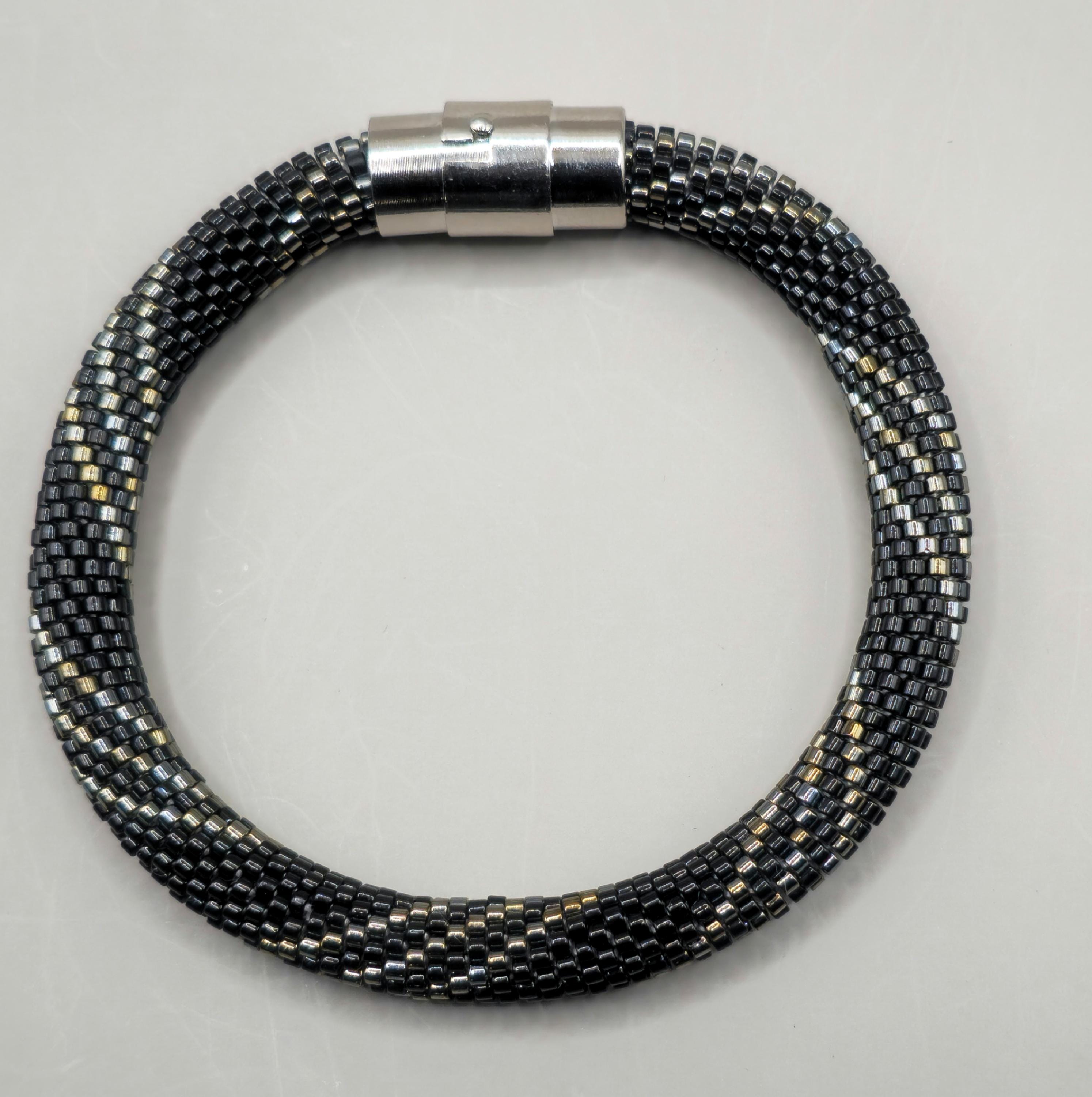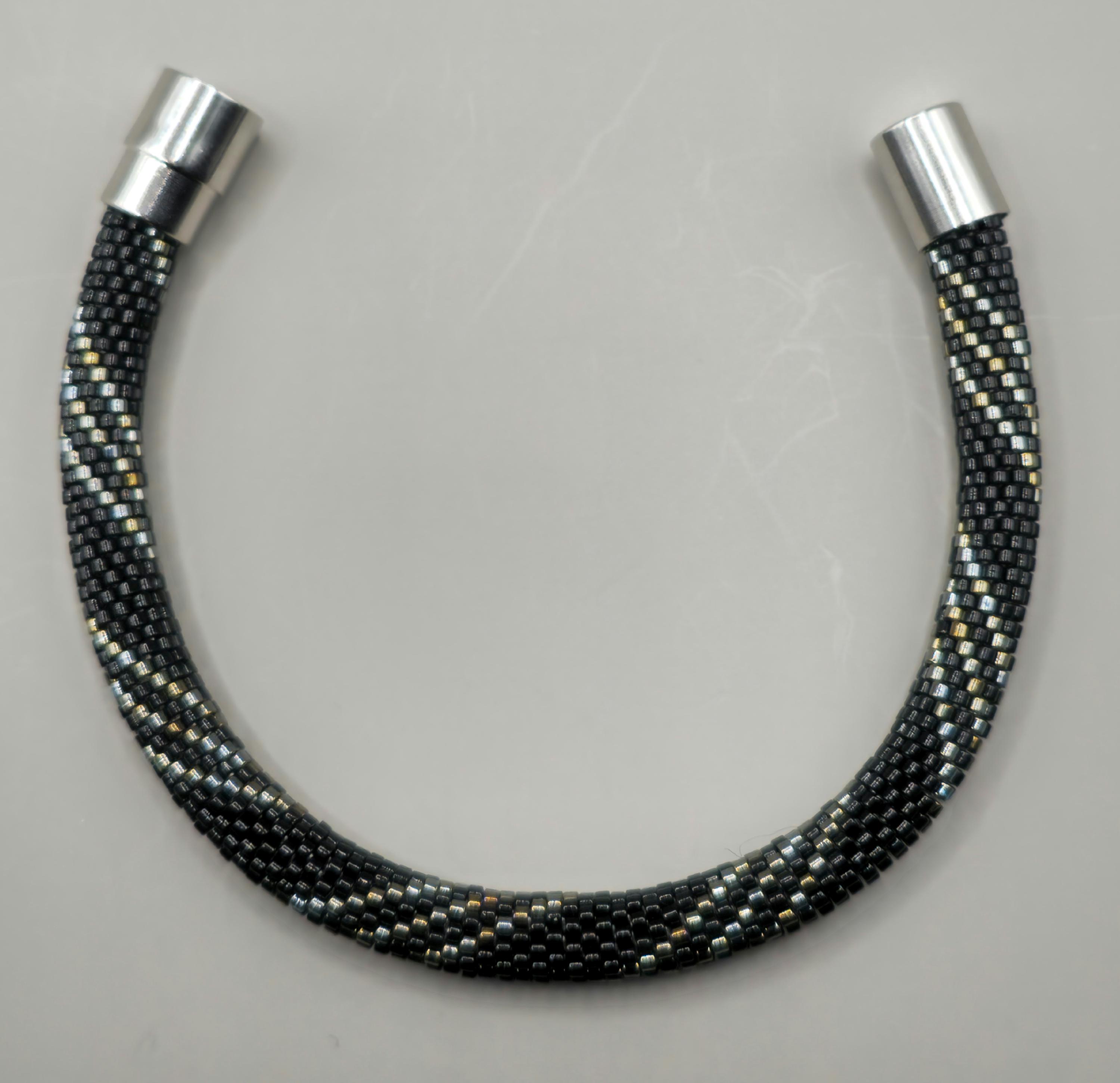 The intricate crochet technique securely weaves each bead into a flexible, rope-like design that is both durable and comfortable to wear. Its cool metallic palette pairs beautifully with both casual and formal styles, making it a versatile accessory for everyday elegance or evening refinement.