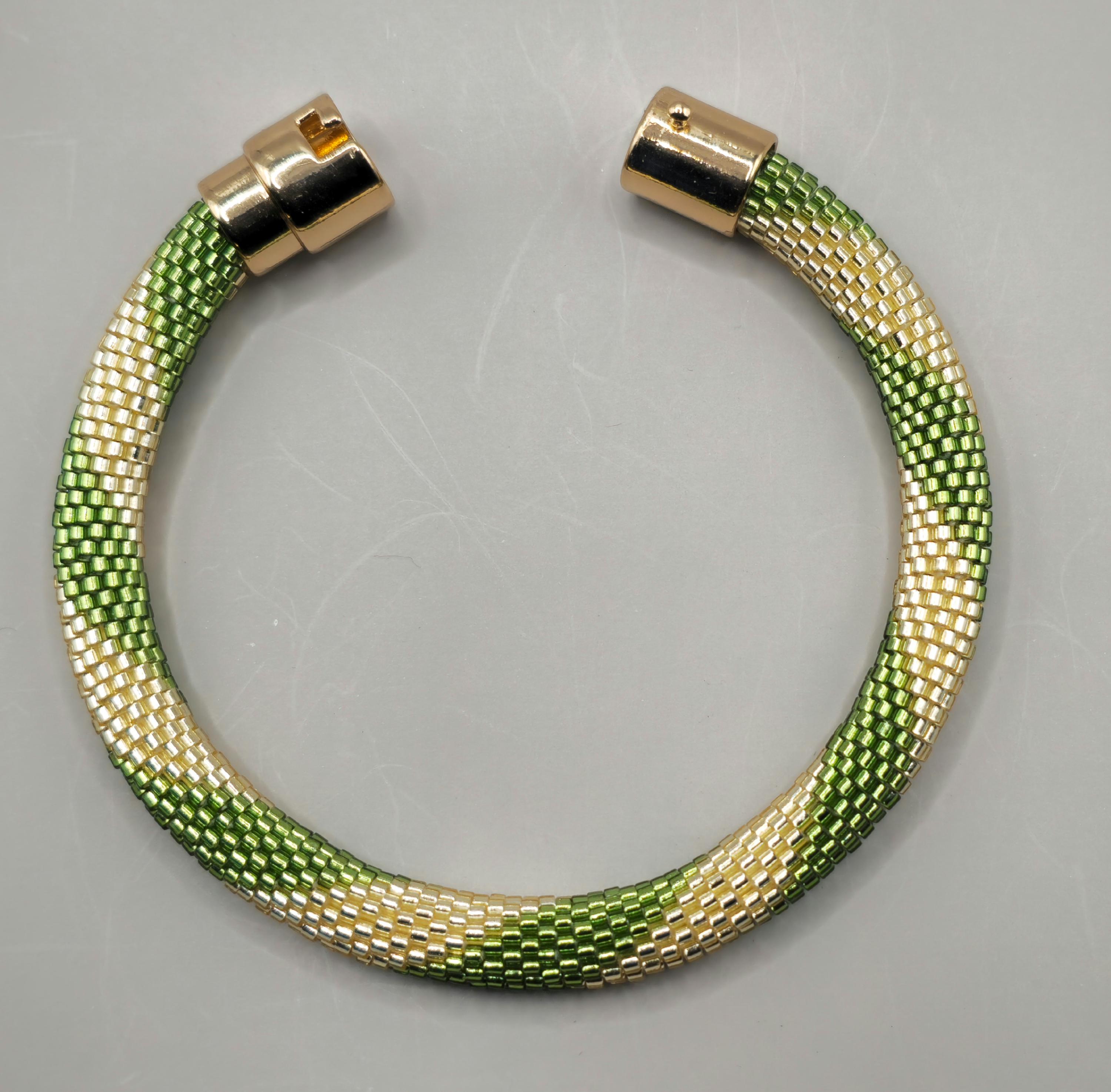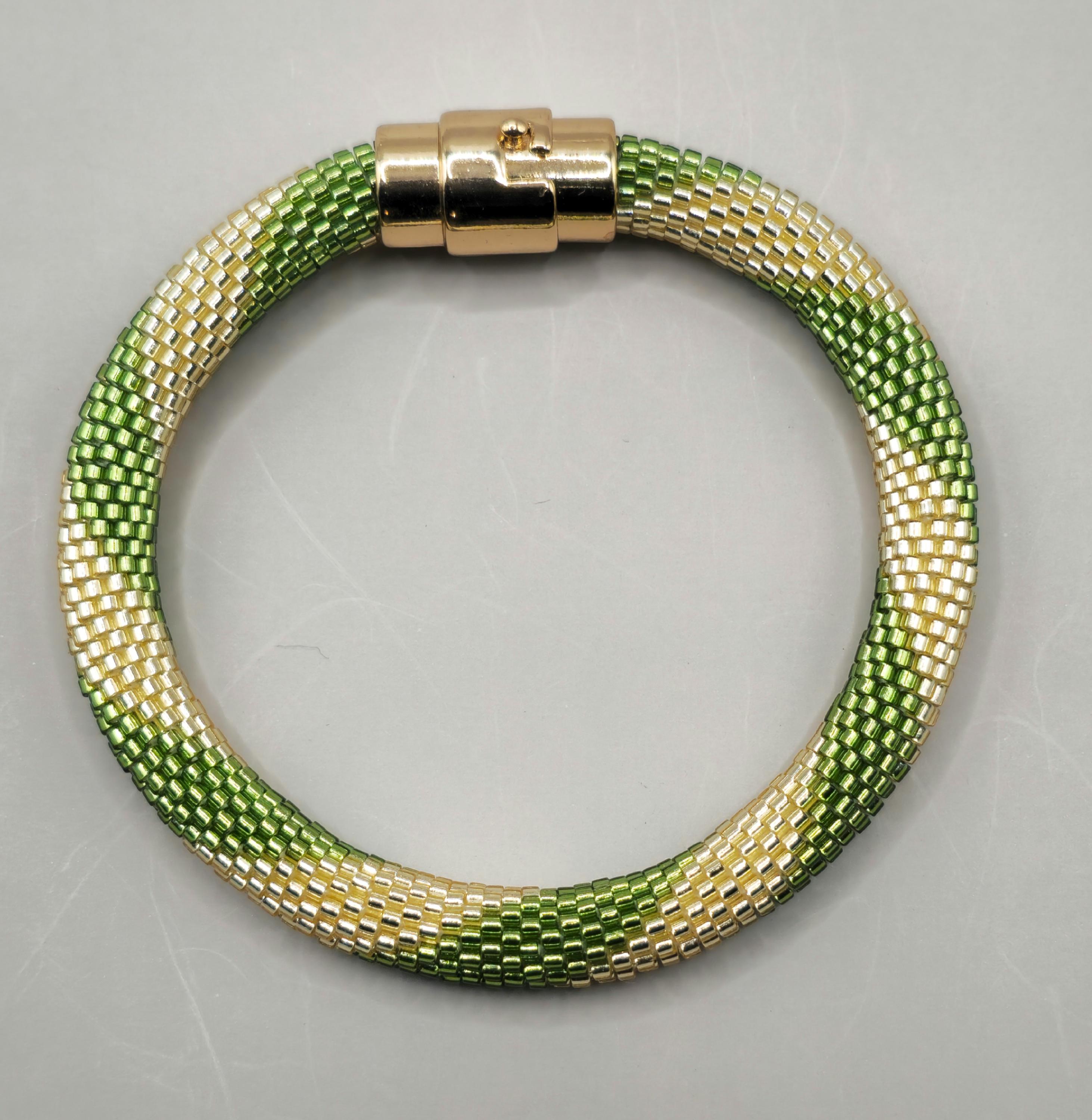 This bracelet measures 7.5 inches long, including the clasp. It is made of high-quality glass seed beads and finished off with a magnetic safety clasp. One small twist and your bracelet is secure.