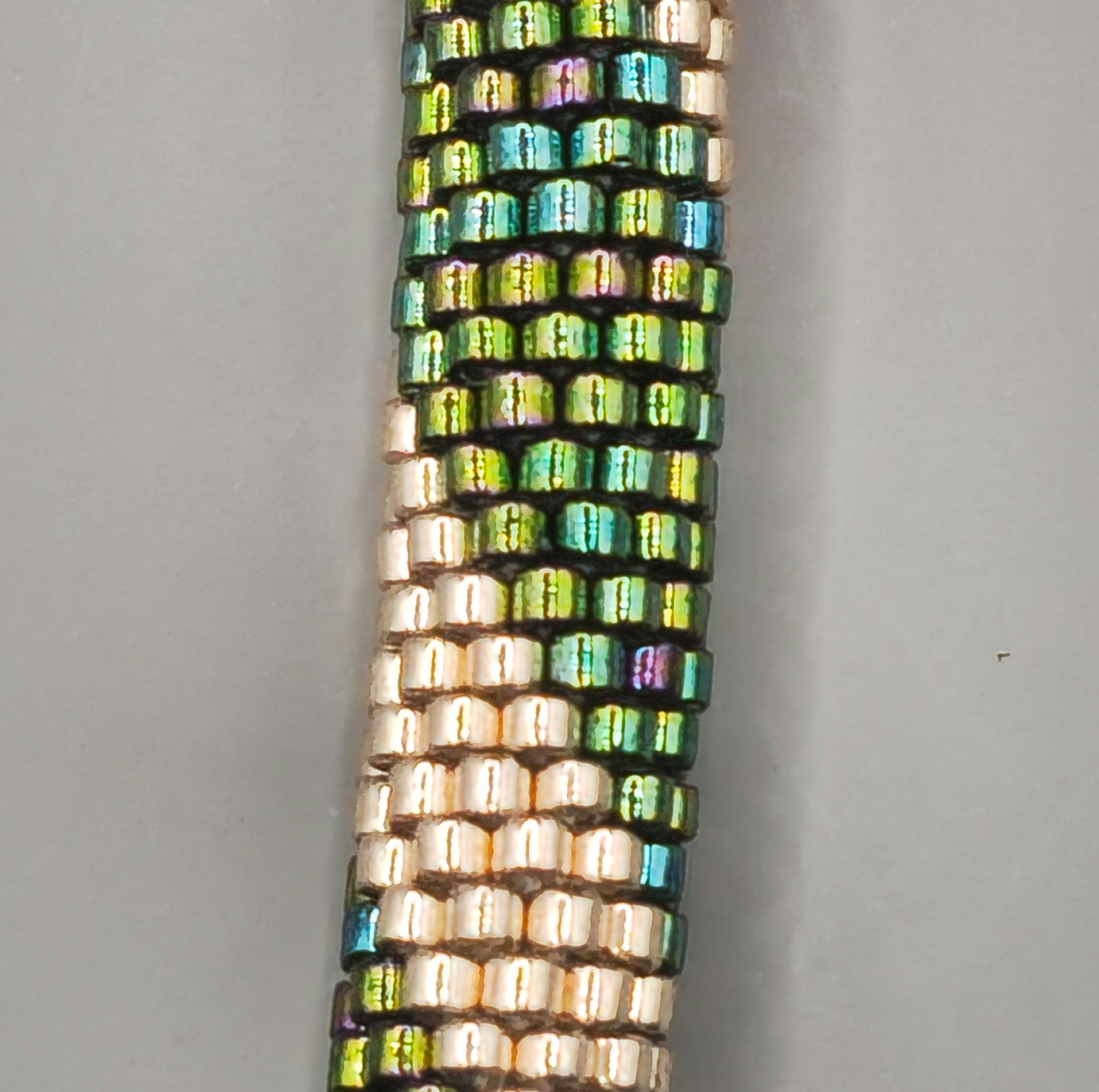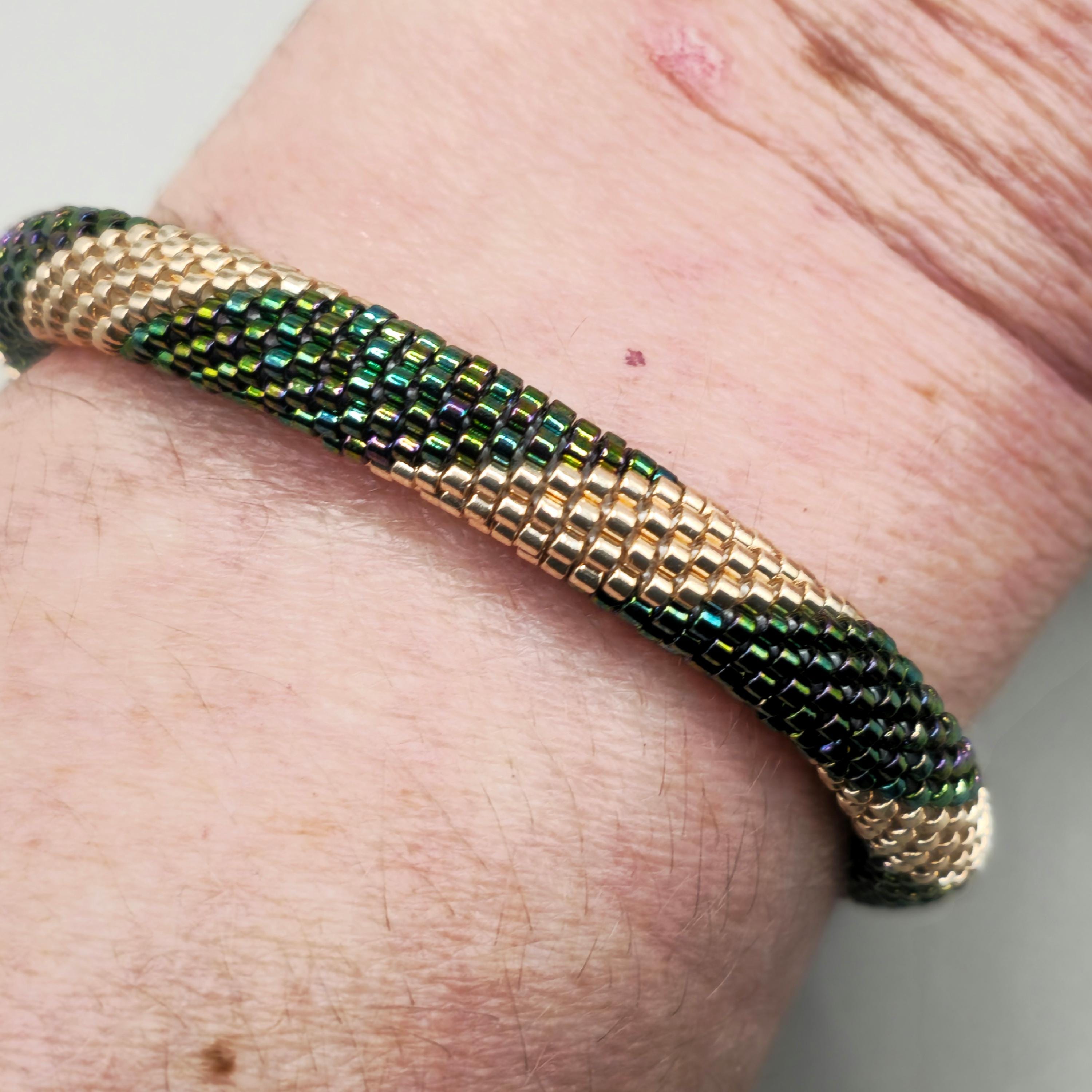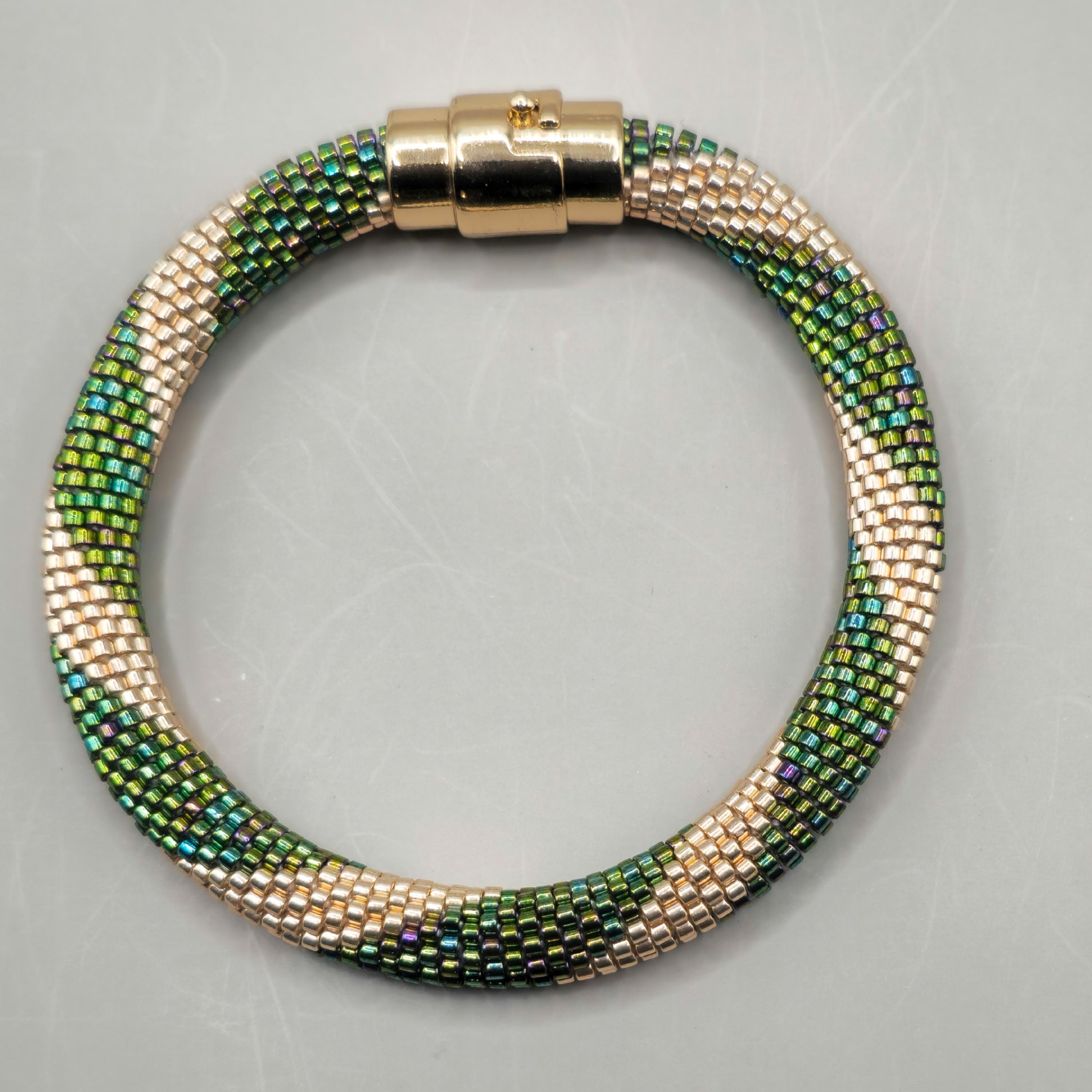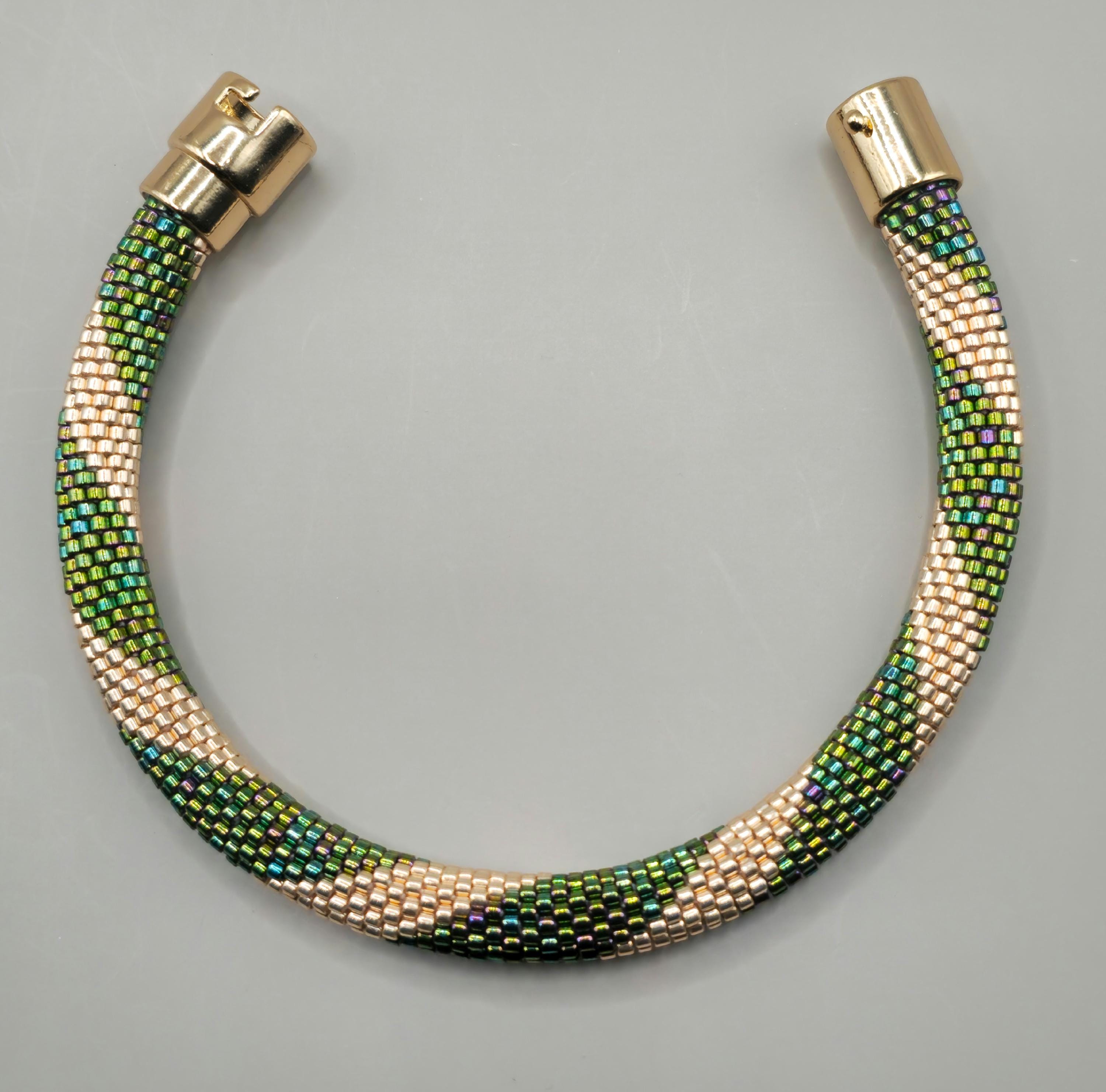 Each bead is carefully incorporated into the crochet stitches, forming a smooth, continuous design that highlights the brilliance of the emerald hues. Beaded crochet jewelry is known for its elegant yet lightweight construction, as beads are worked directly into the thread to become part of the fabric of the bracelet.