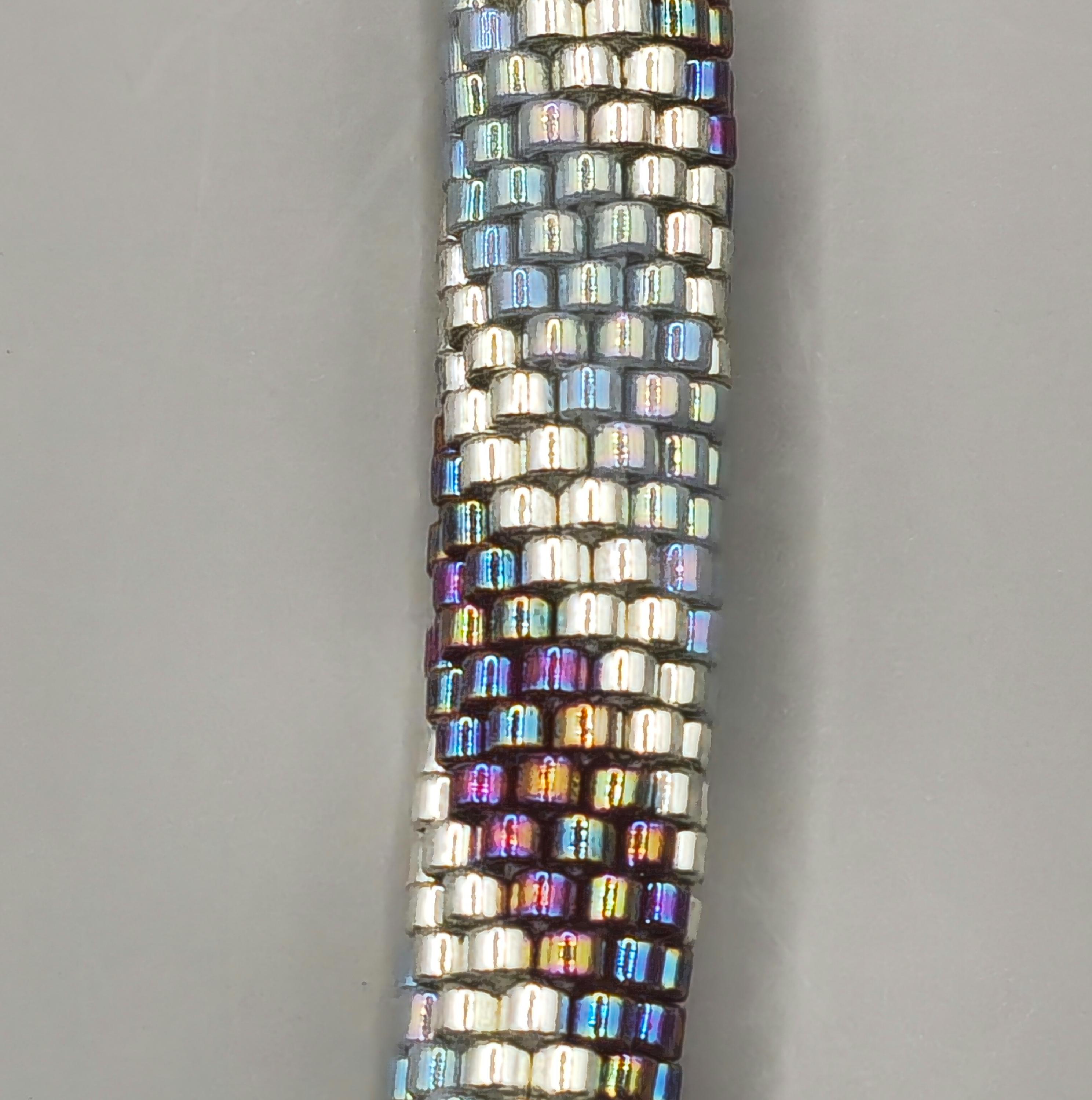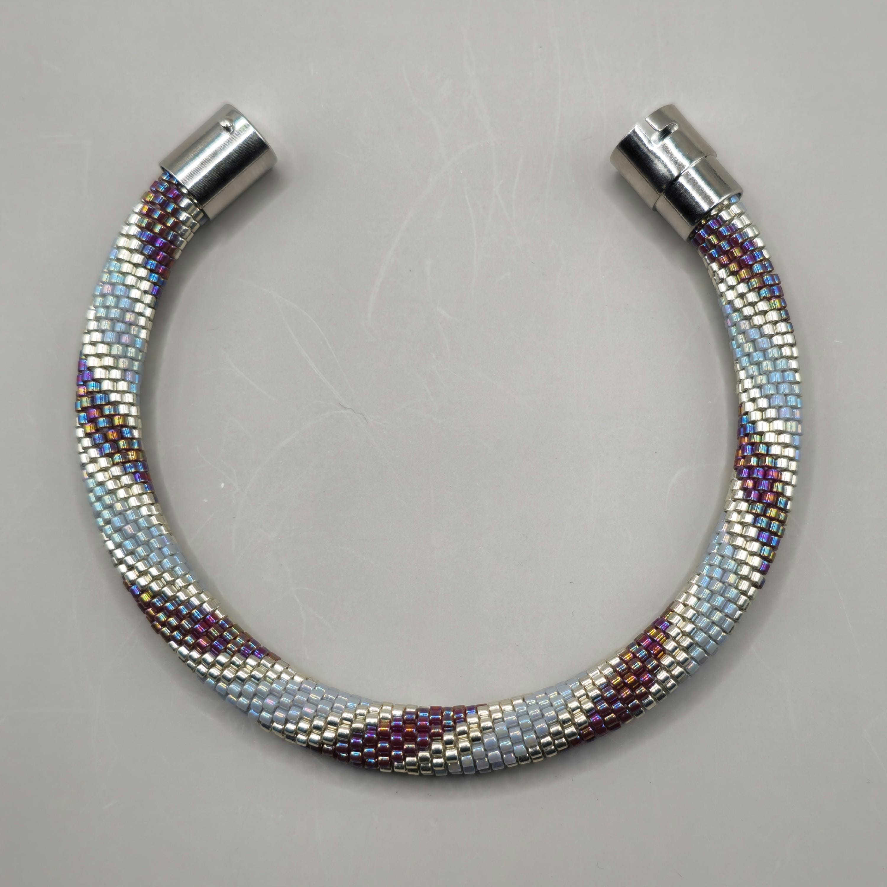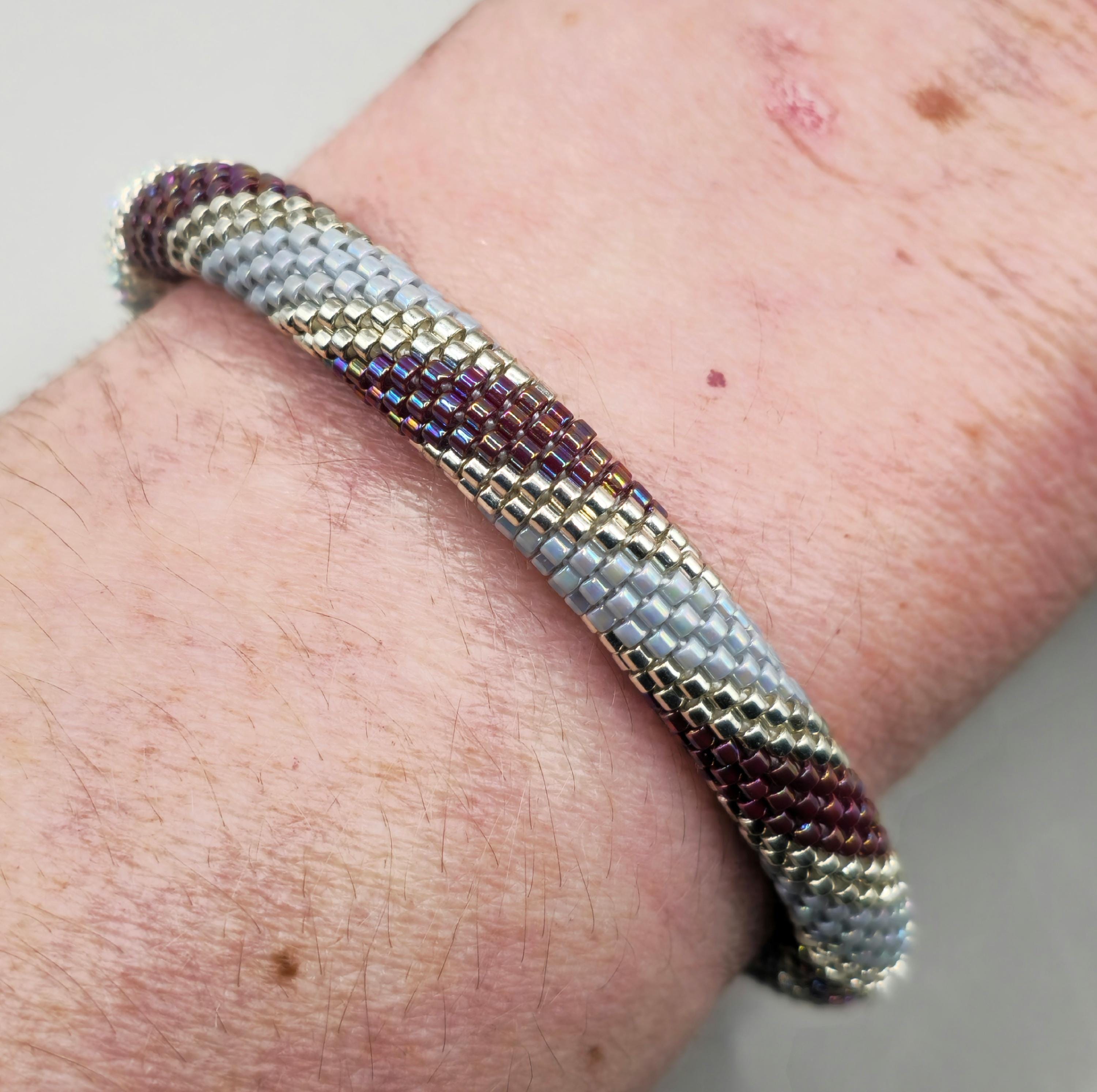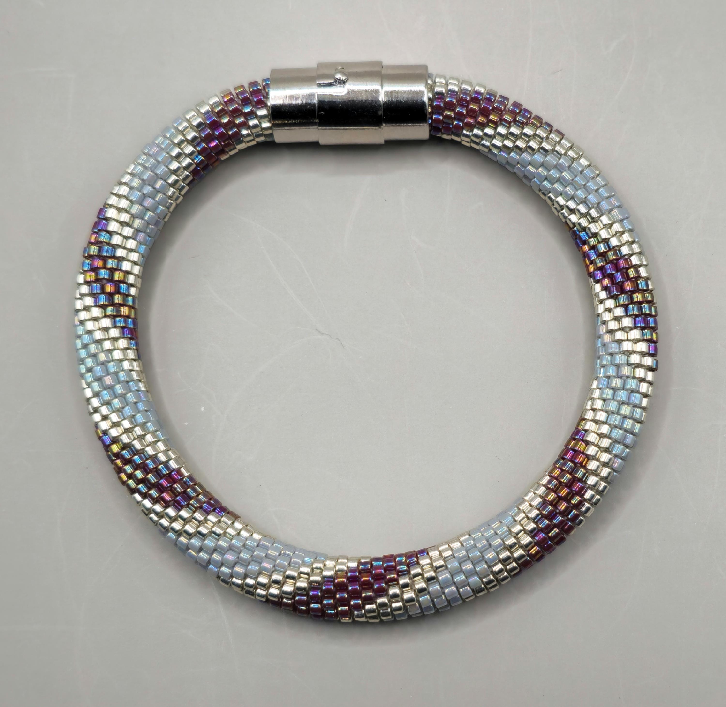 This bracelet measures 7.5 inches long, including the clasp. It is made of high-quality glass seed beads and finished off with a magnetic safety clasp. One small twist and your bracelet is secure.