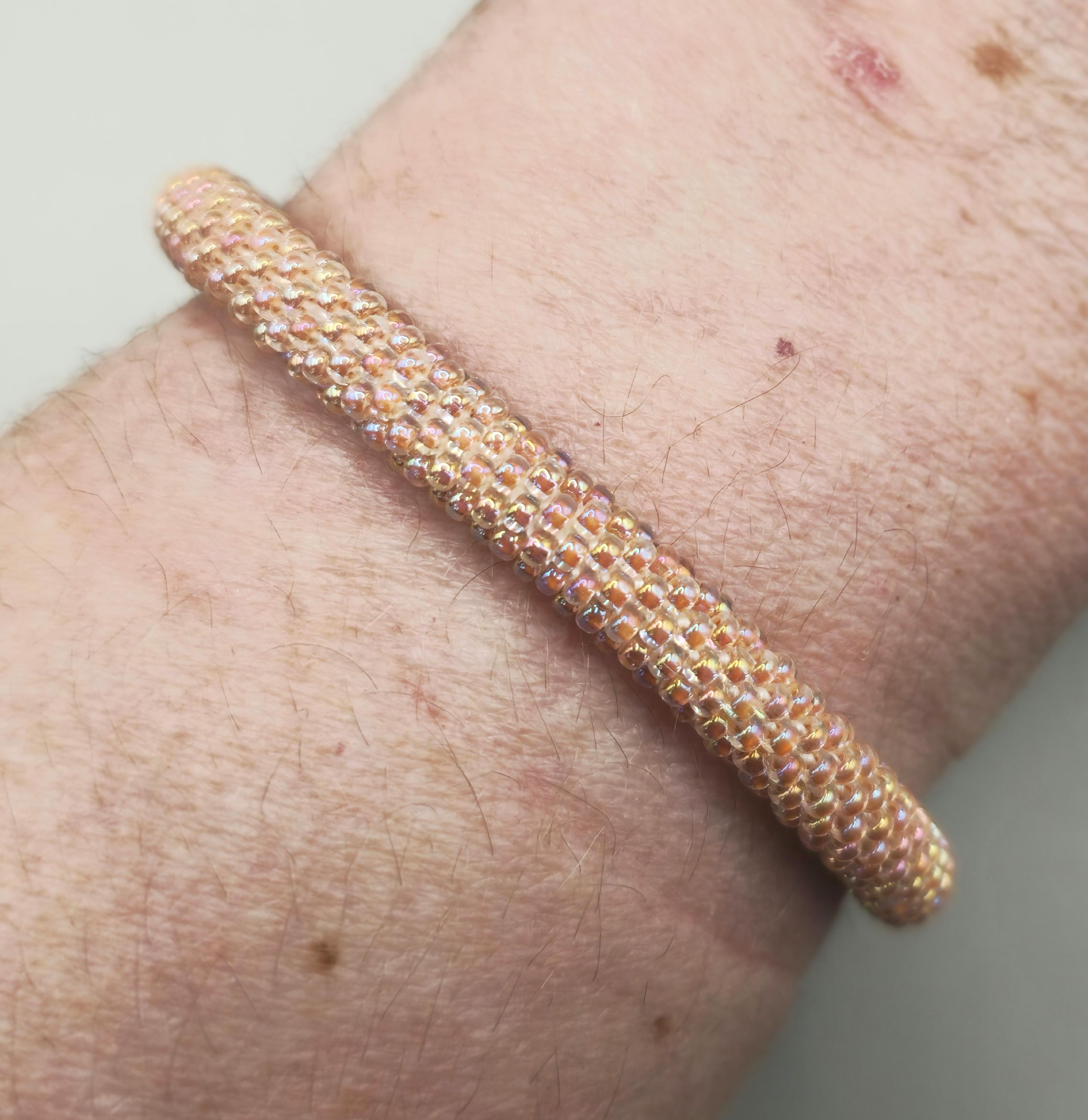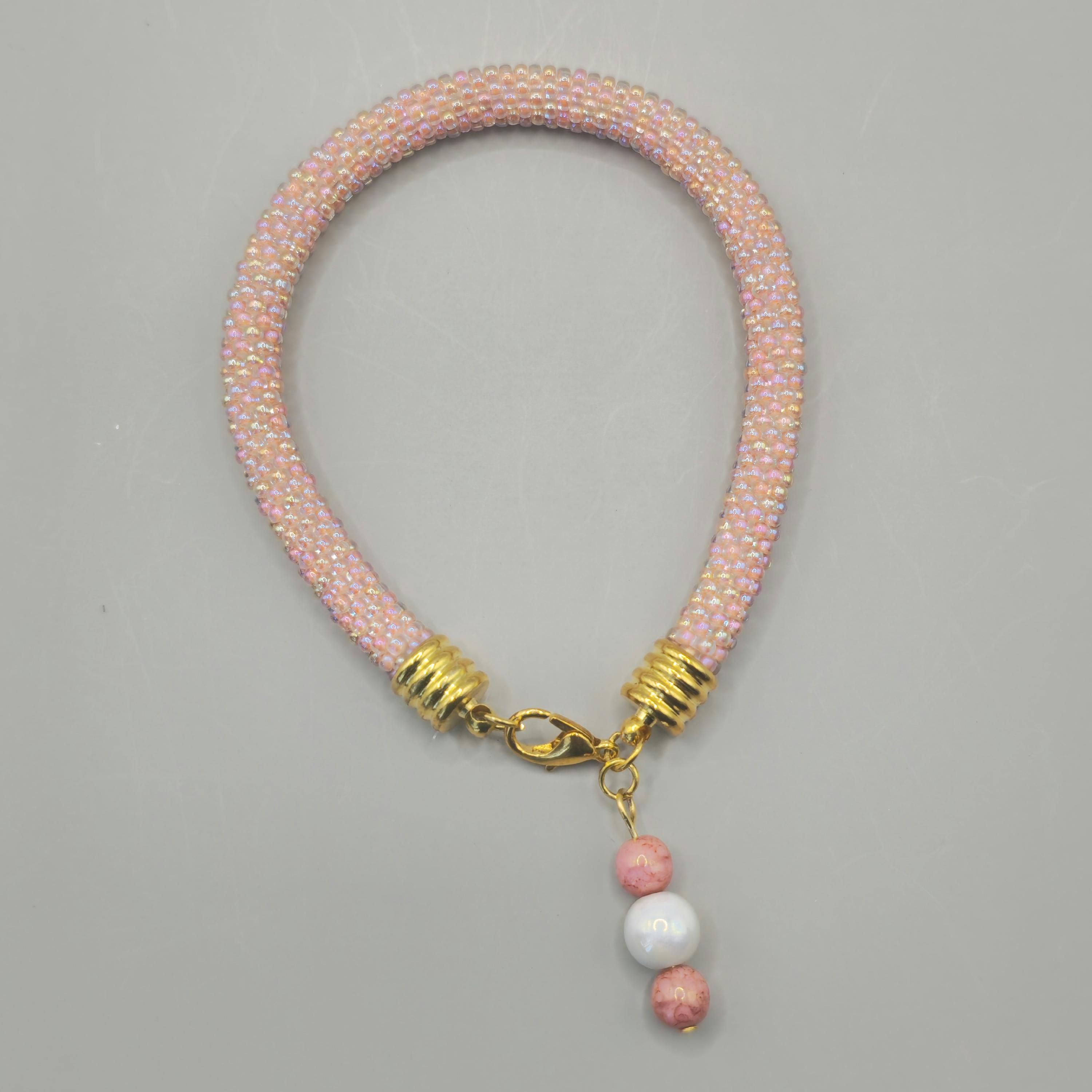 Soft, warm, and glowing with color, the Sunset Pink Crocheted Beaded Bracelet captures the gentle beauty of a sunset sky. Delicate pink beads are carefully crocheted together, creating a smooth spiral design that shimmers subtly with every movement. The warm tones evoke the peaceful glow of evening light, making this bracelet both elegant and uplifting.