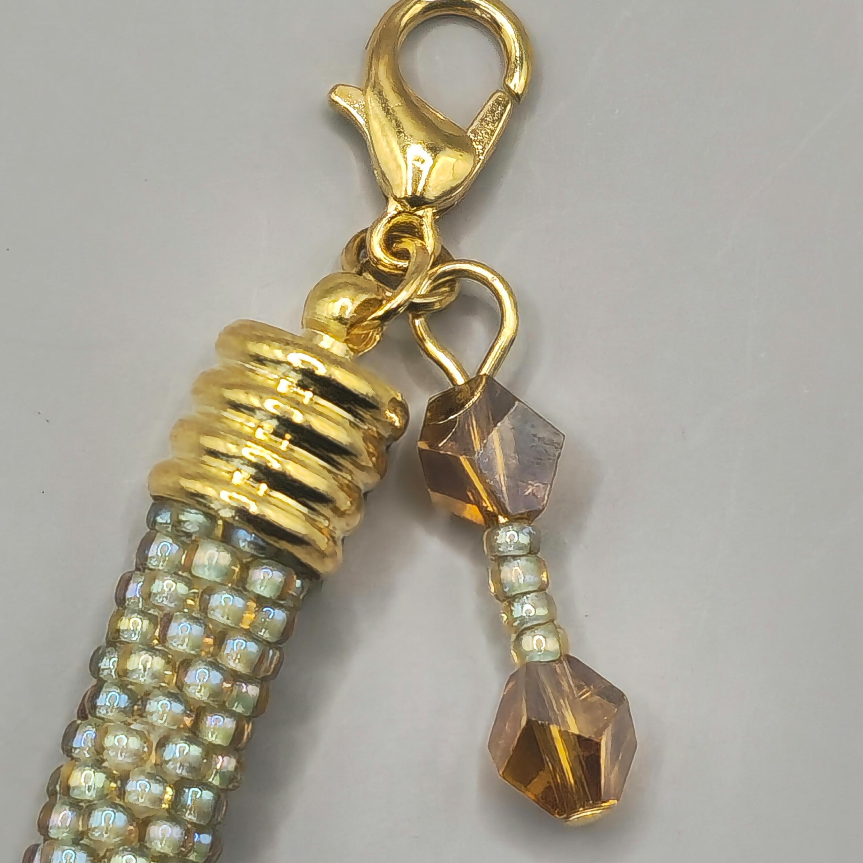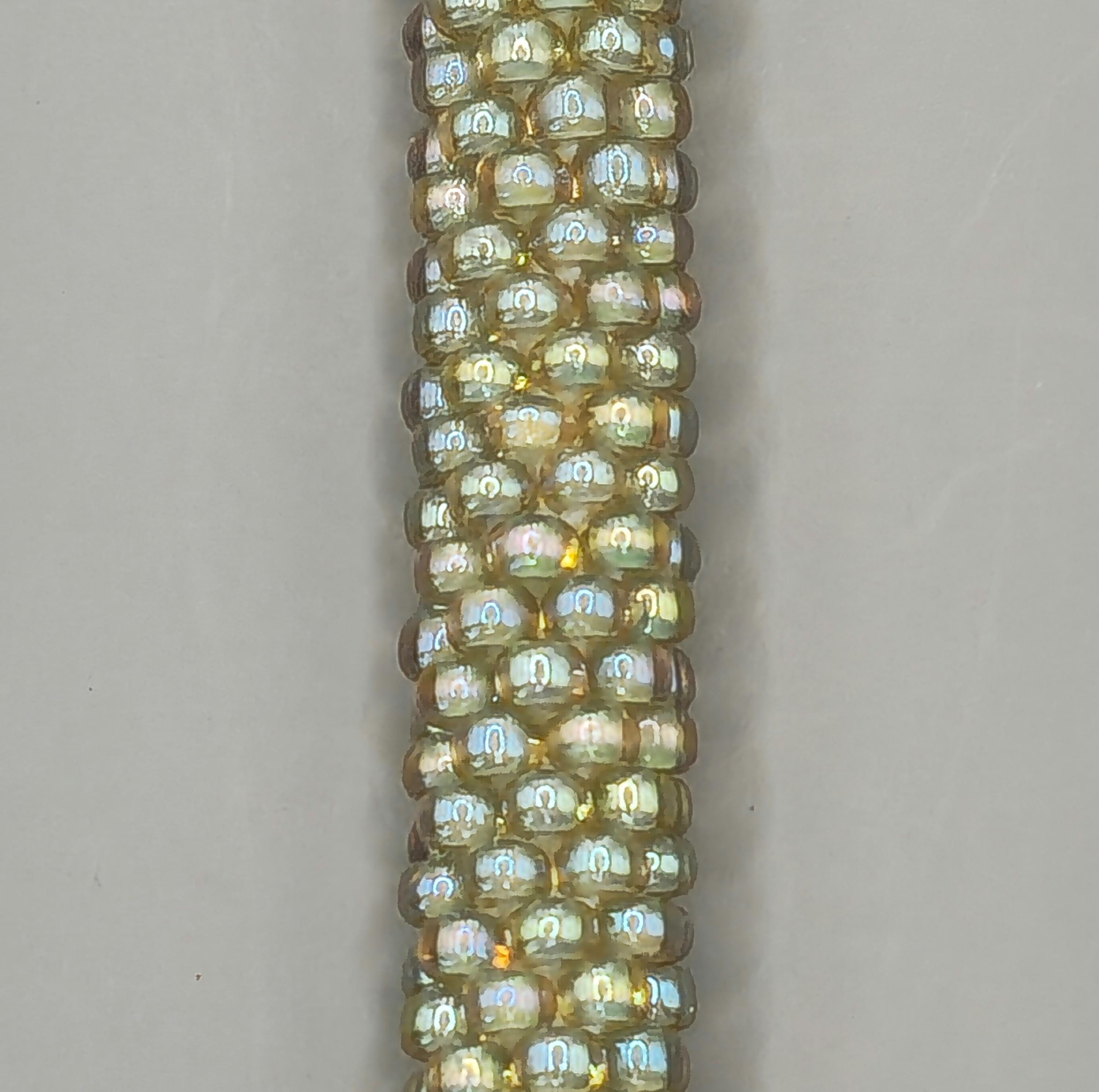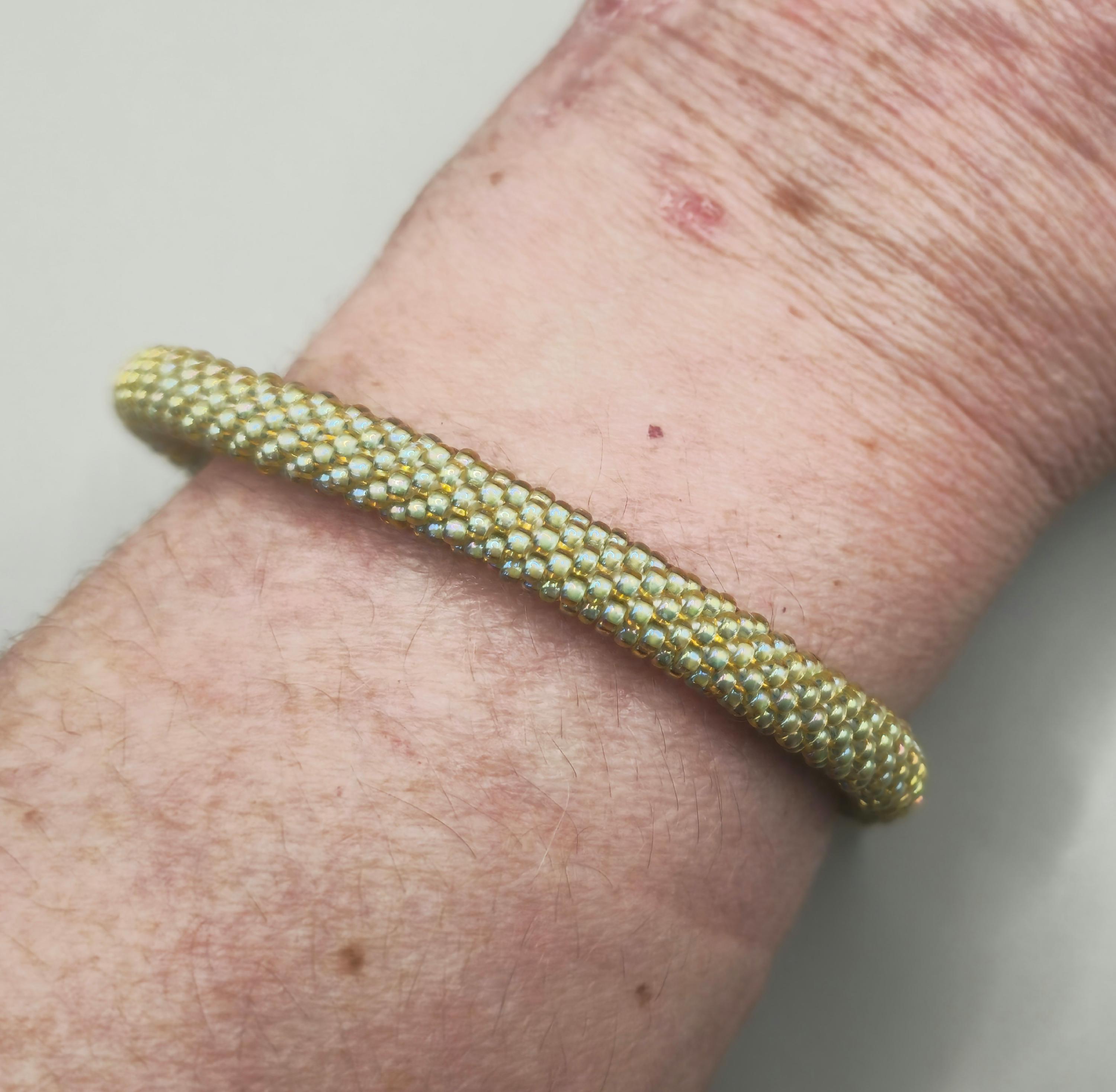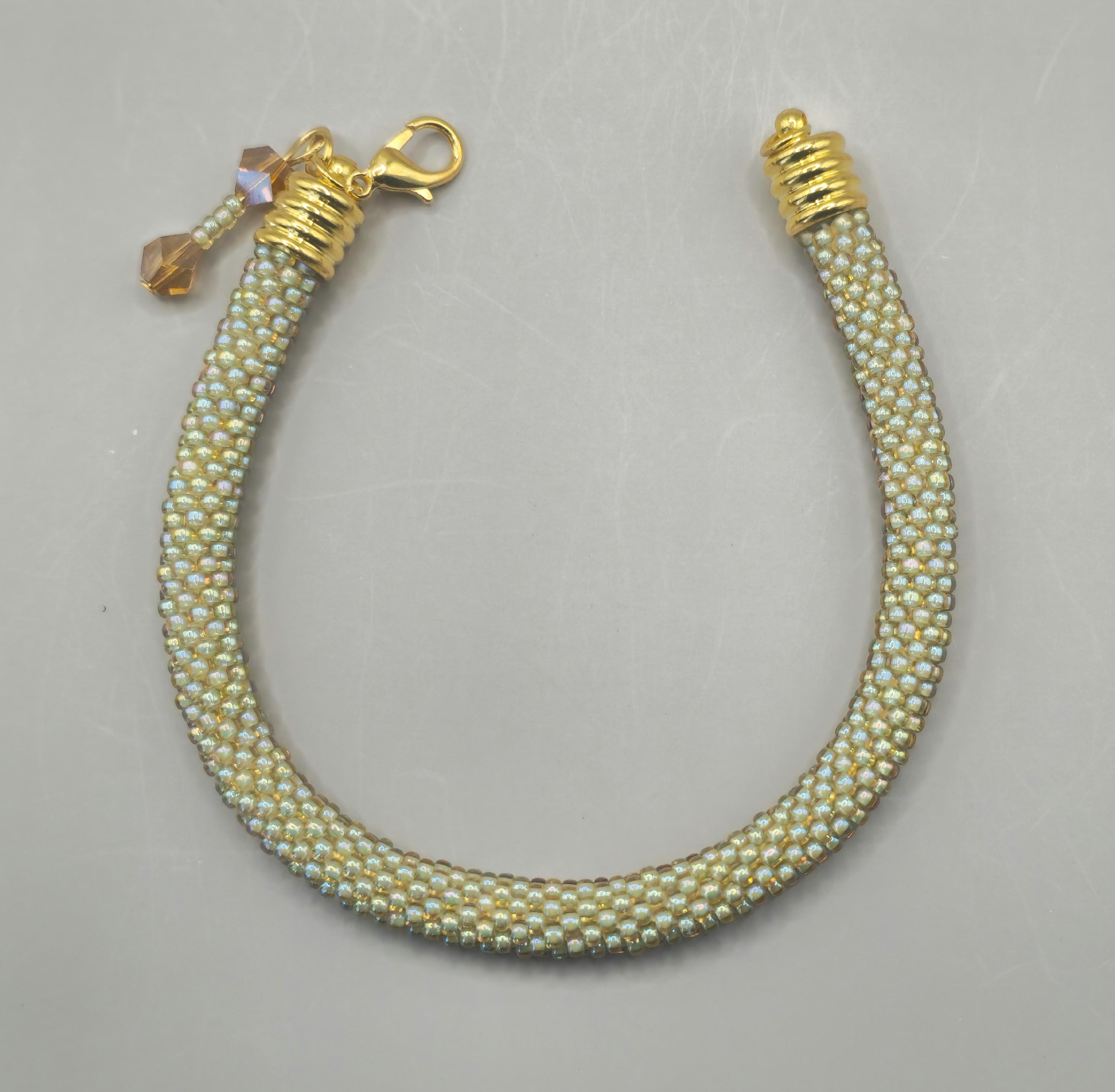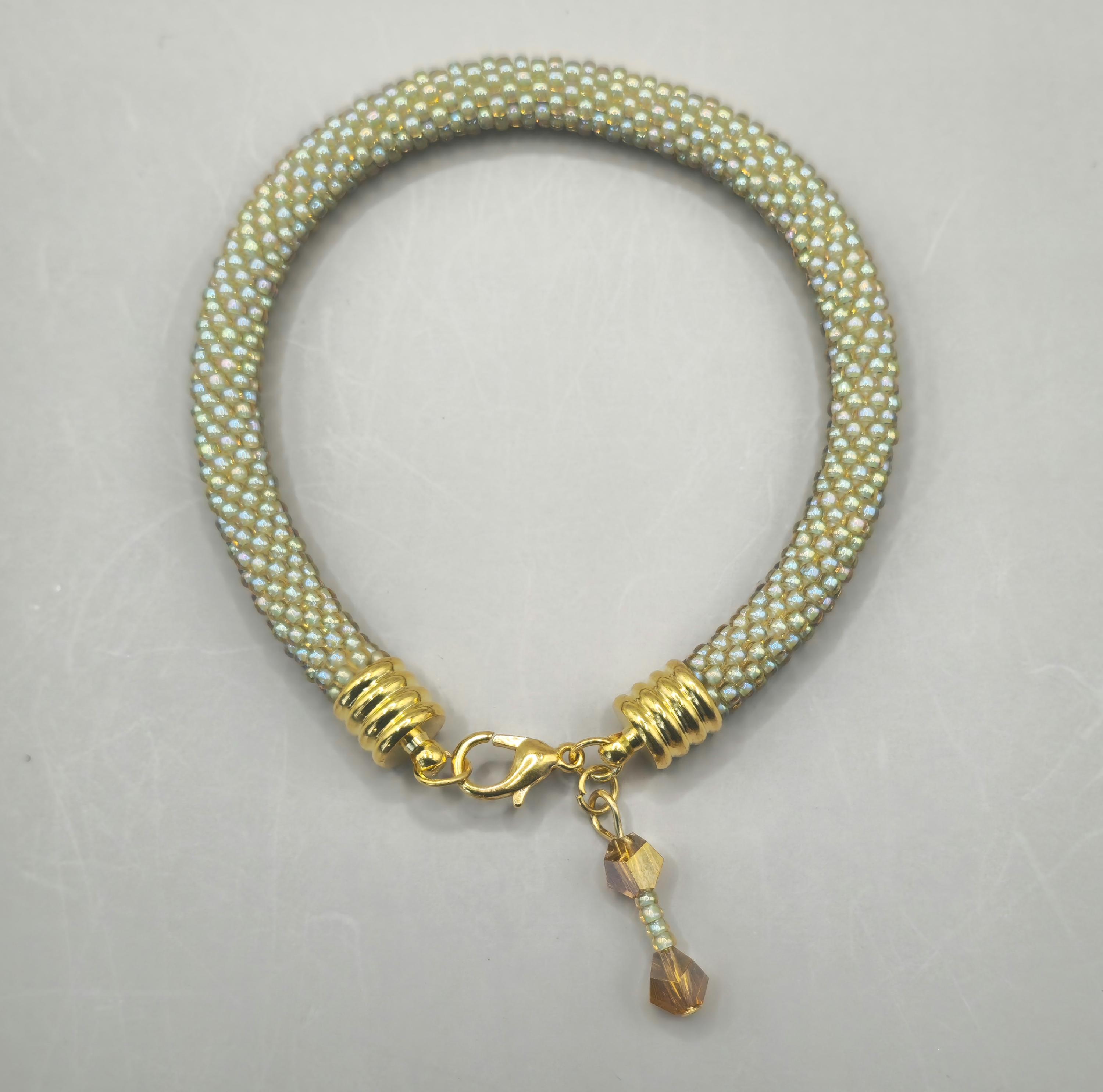 The Golden Sage crocheted beaded bracelet blends soft earthy greens with warm golden tones for a look that feels both natural and refined. Each tiny bead is carefully crocheted into place, creating a smooth, rope-style design that highlights the subtle contrast between sage green and shimmering gold.