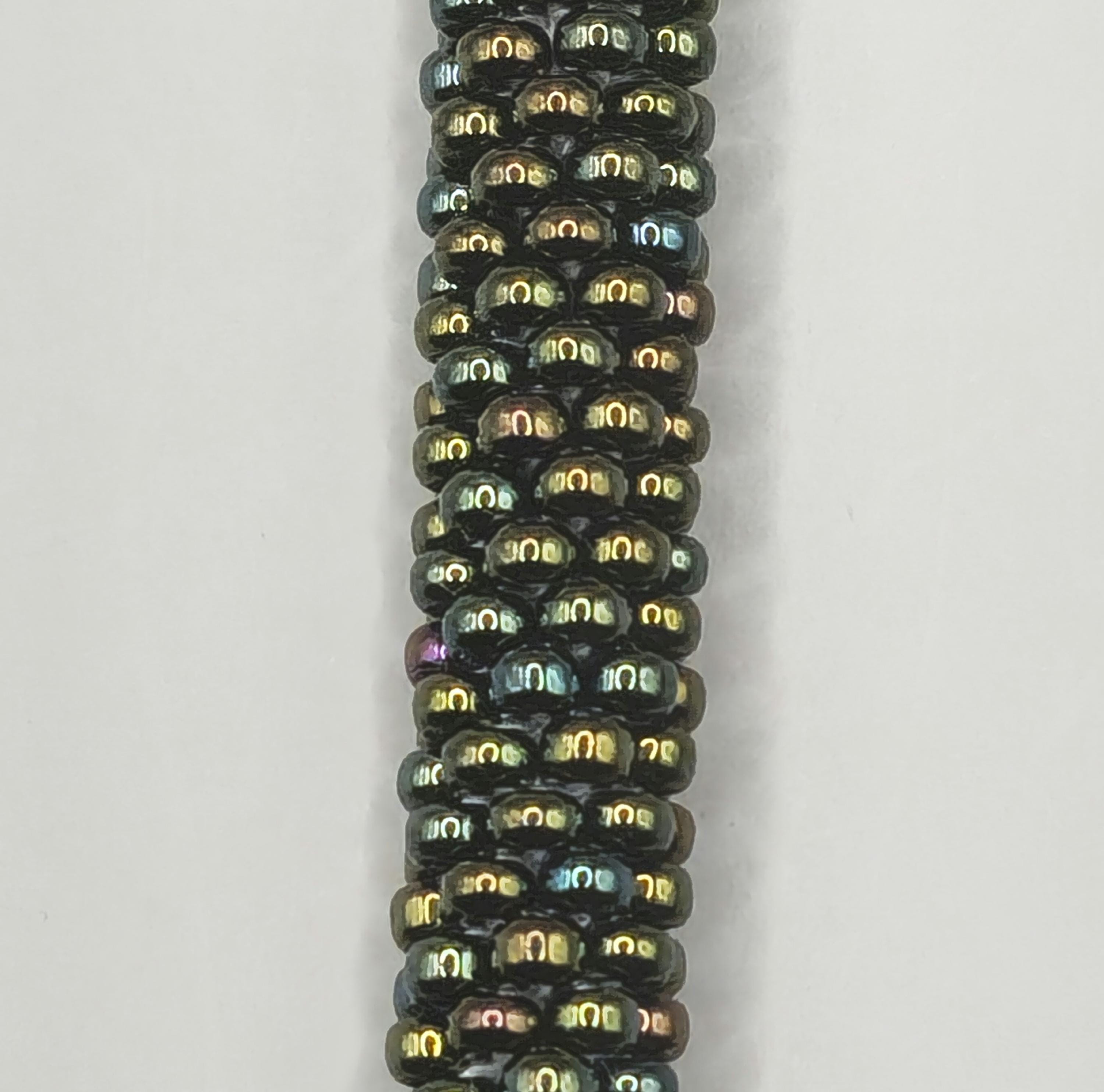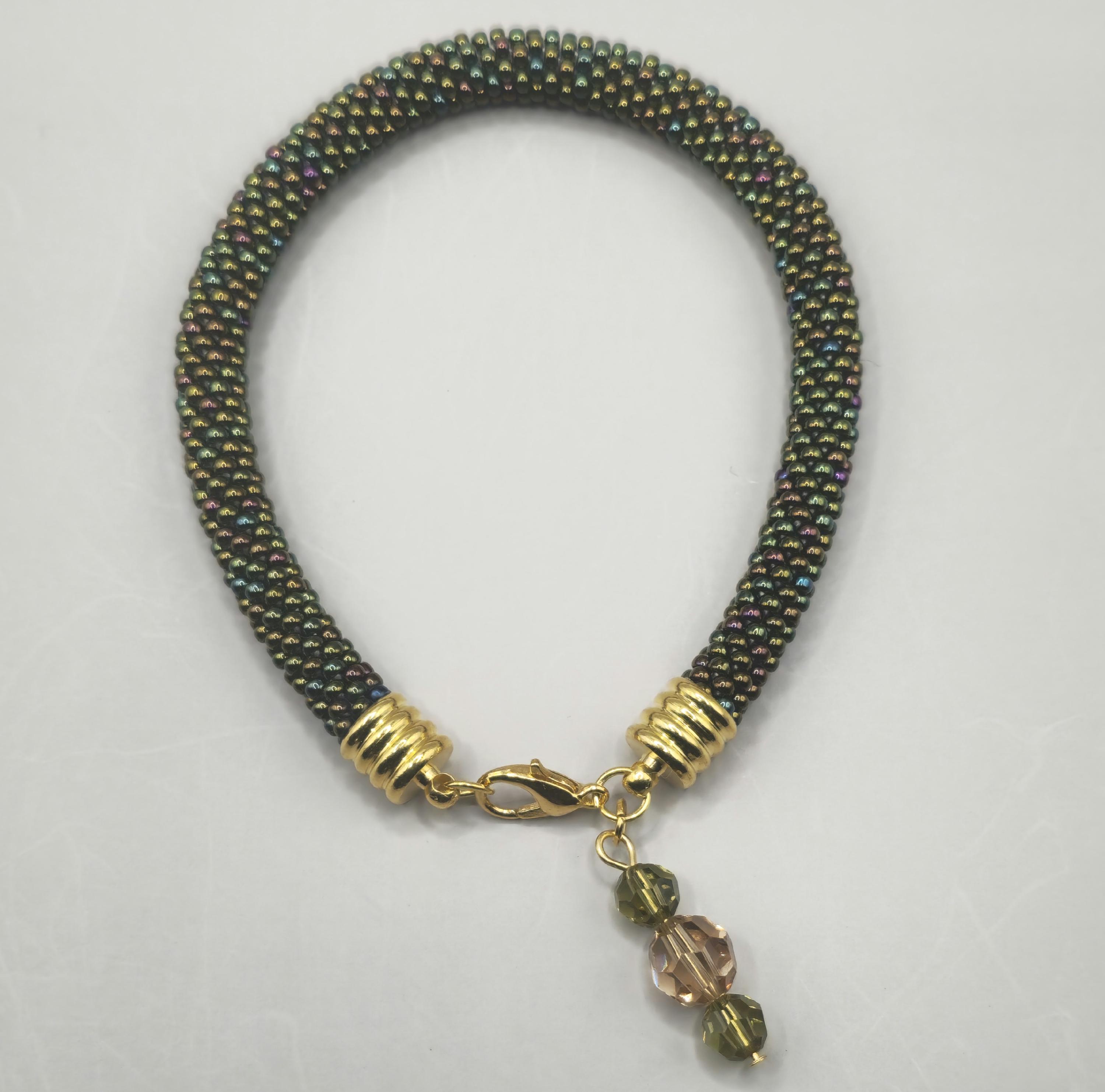 This bracelet measures 7.5 inches long including the clasp. It is made from high-quality glass seed beads and finished off with a lobster claw clasp and beautiful crystal charm.