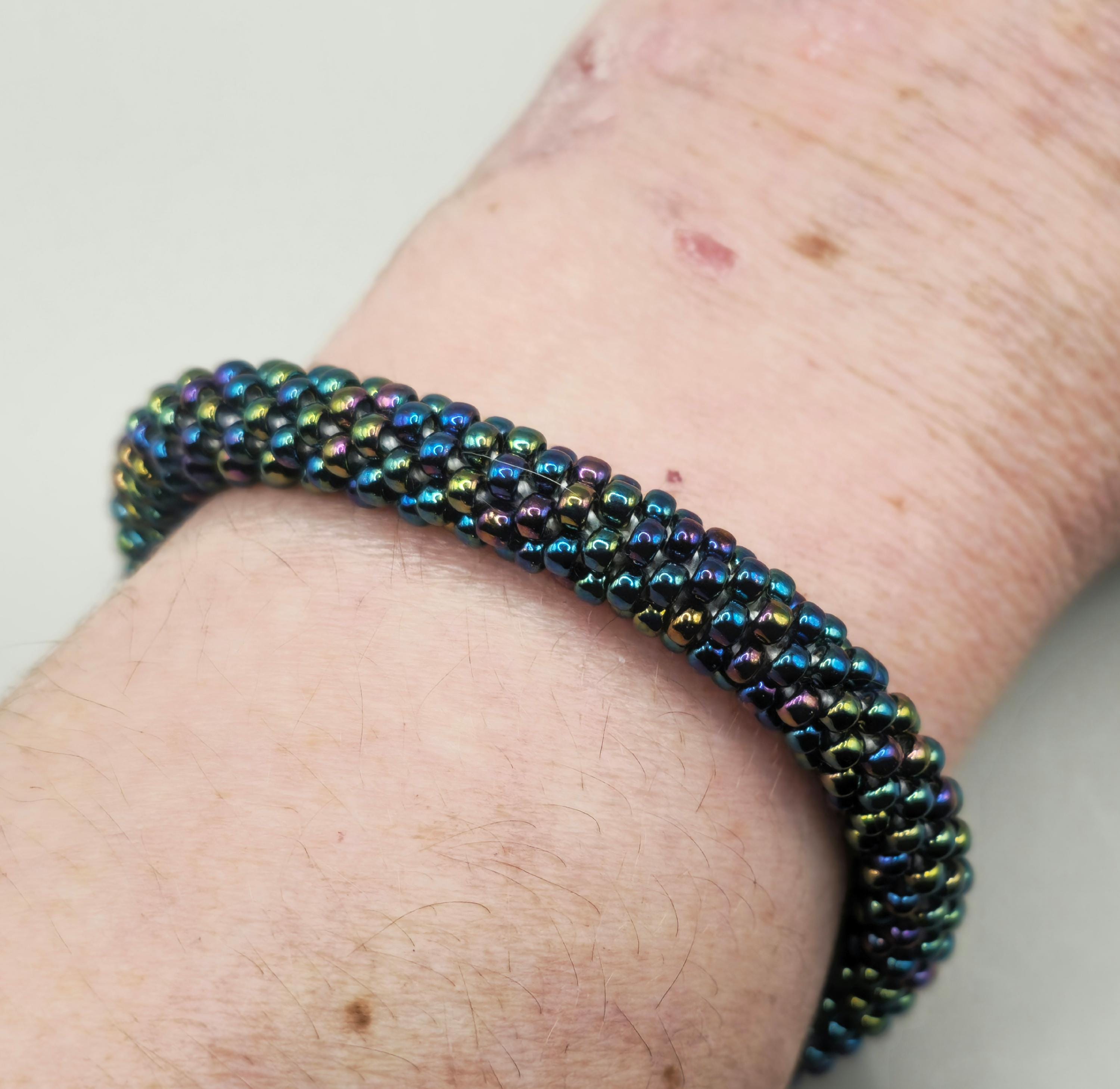 Add a touch of magic to your everyday essentials with the Night Rainbow Crocheted Beaded Wristlet. This beautifully handcrafted piece features a stunning blend of deep, moody tones accented by vibrant pops of rainbow color, reminiscent of a rainbow glowing against a midnight sky.