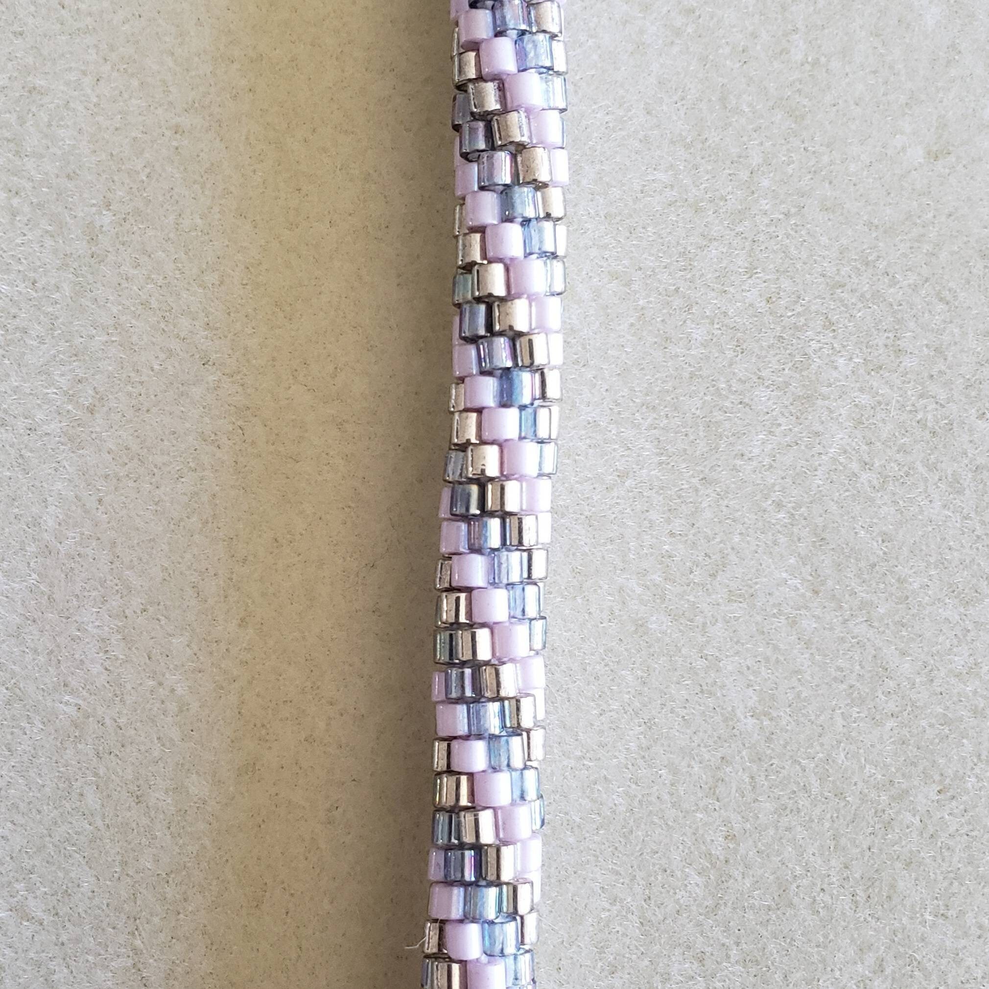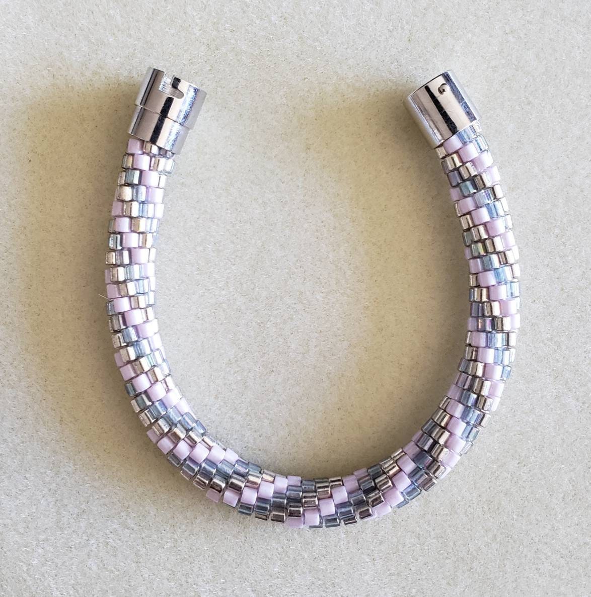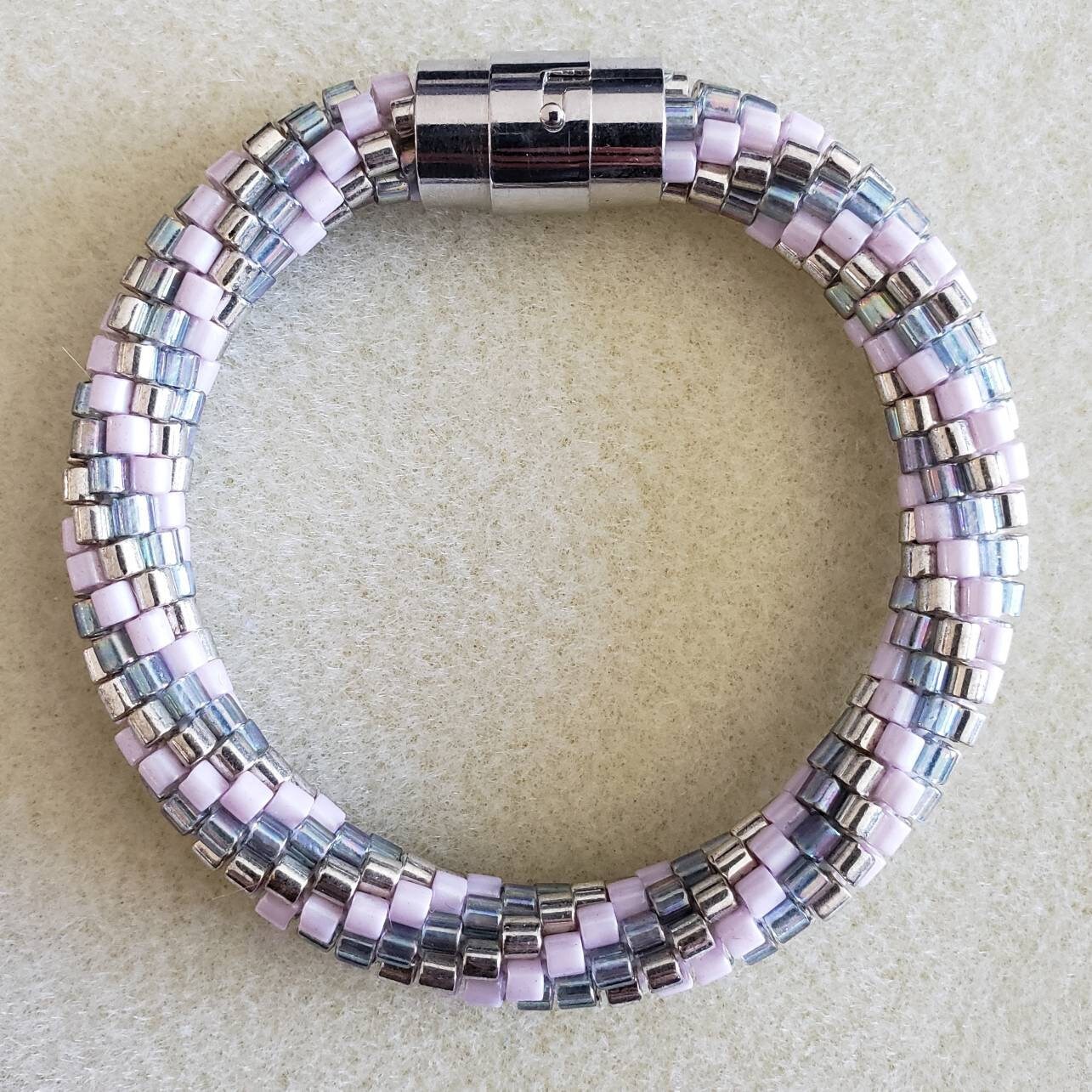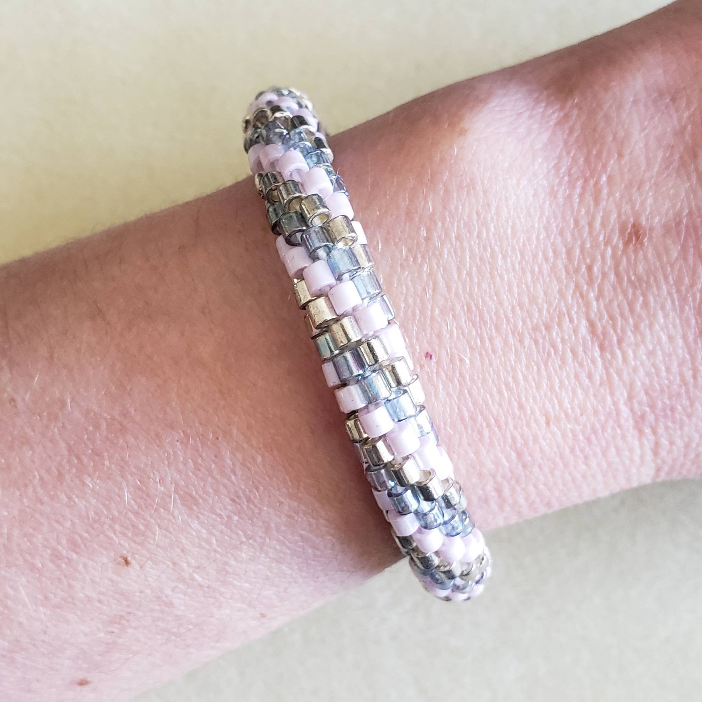 The bracelet measures 7.5 inches long and is made with glass seed beads, cotton thread and finished off with a safety magnetic clasp. One small twist and the bracelet is secure.
